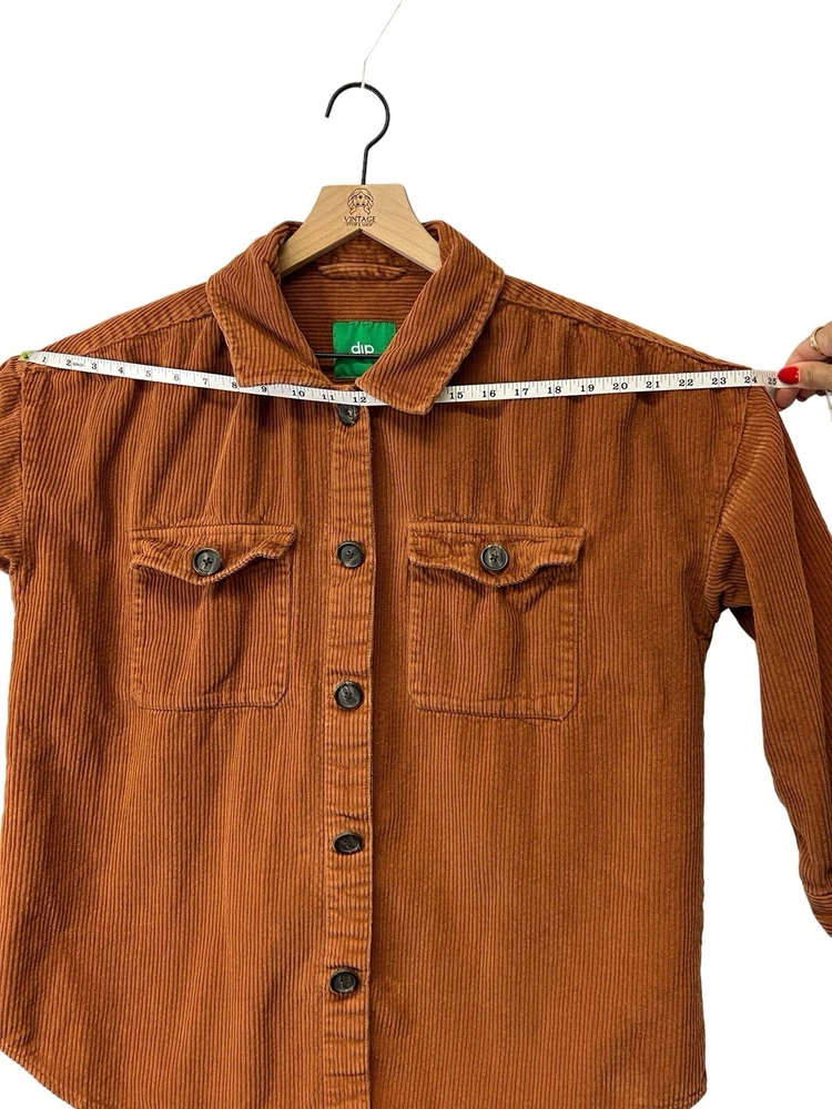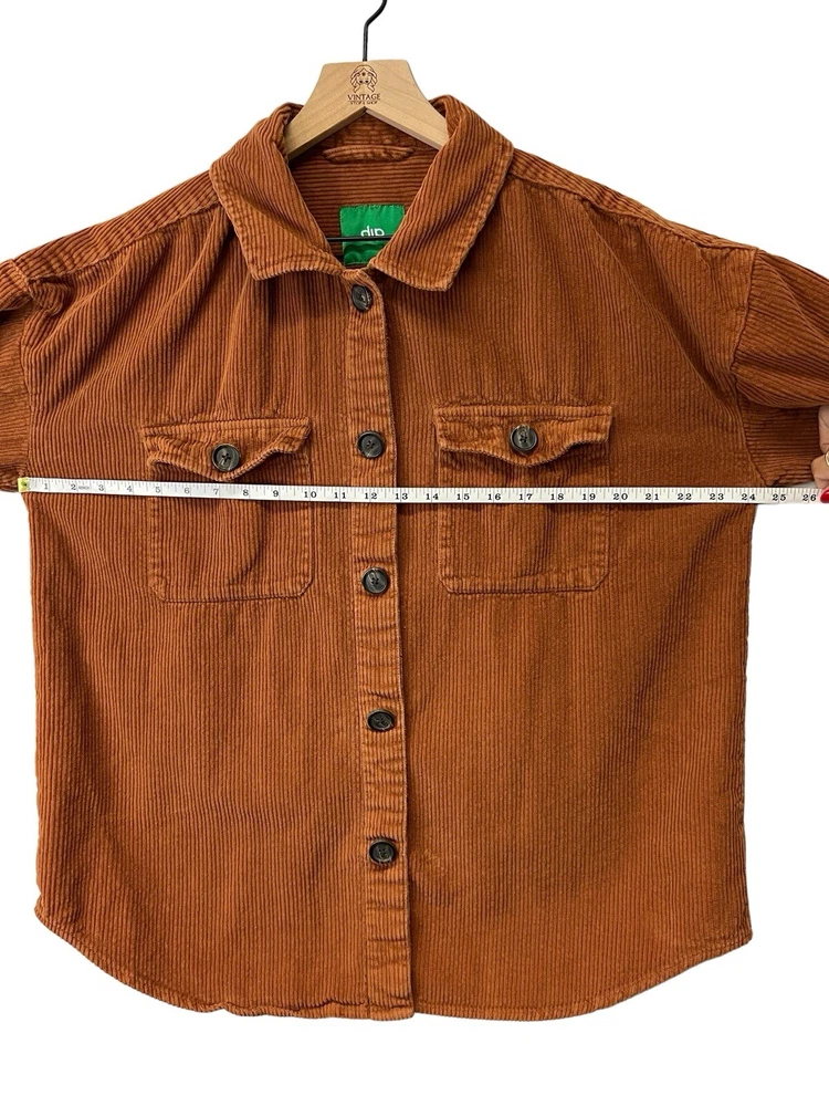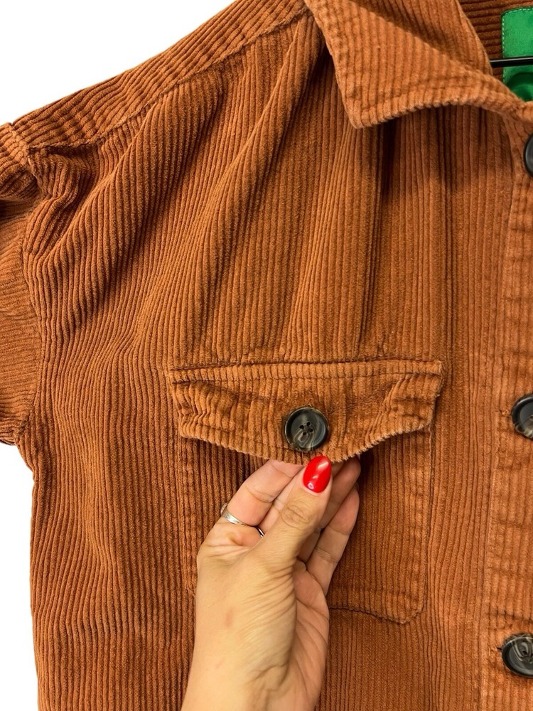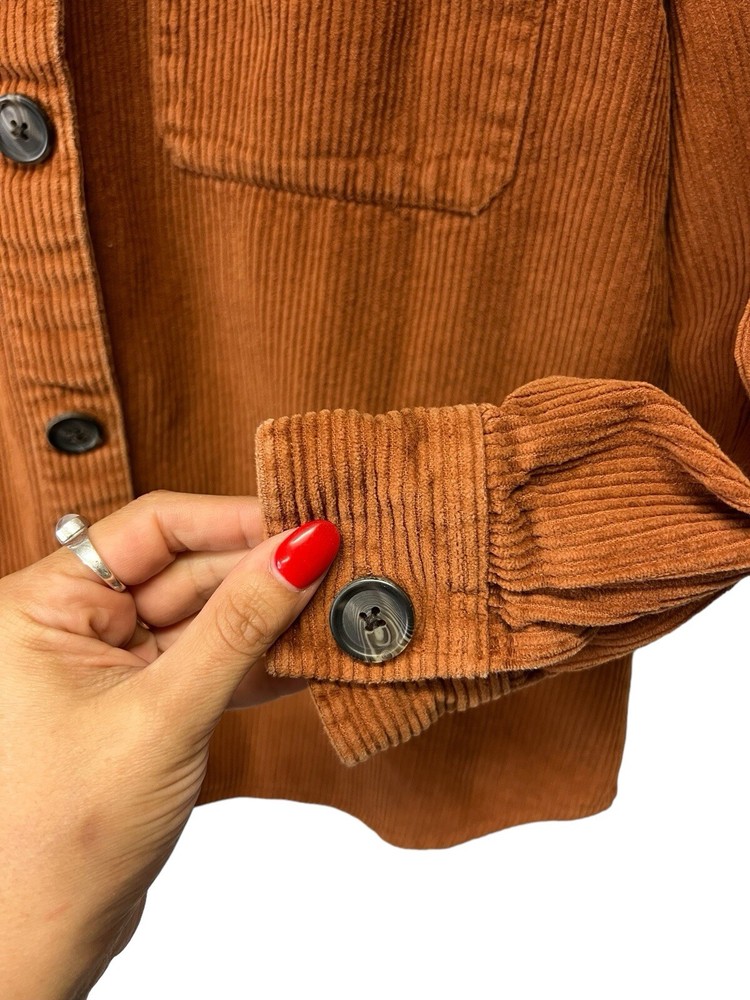 Awesome orange button down shacket. Oversized size large. Sleeves are more of a 3/4 sleeve length. 100% COTTON MACHINE WASH COLO WITH LIKE COLORS TUMBLE DRY LOW COOL IRON IF NEEDED MADE IN INFIA RN 29...