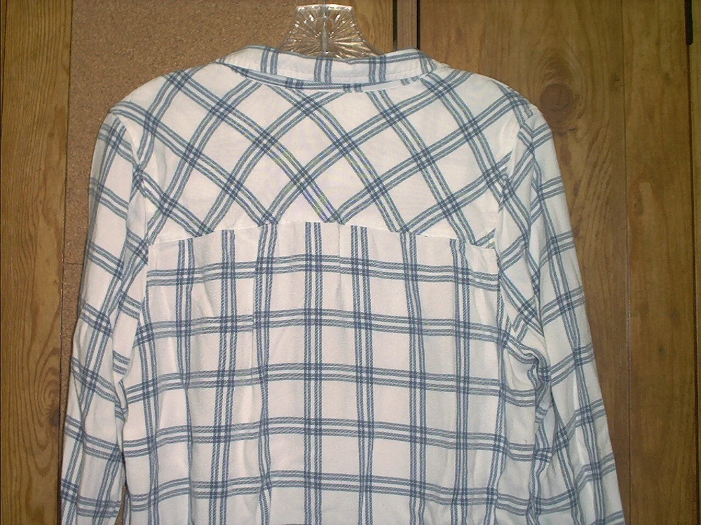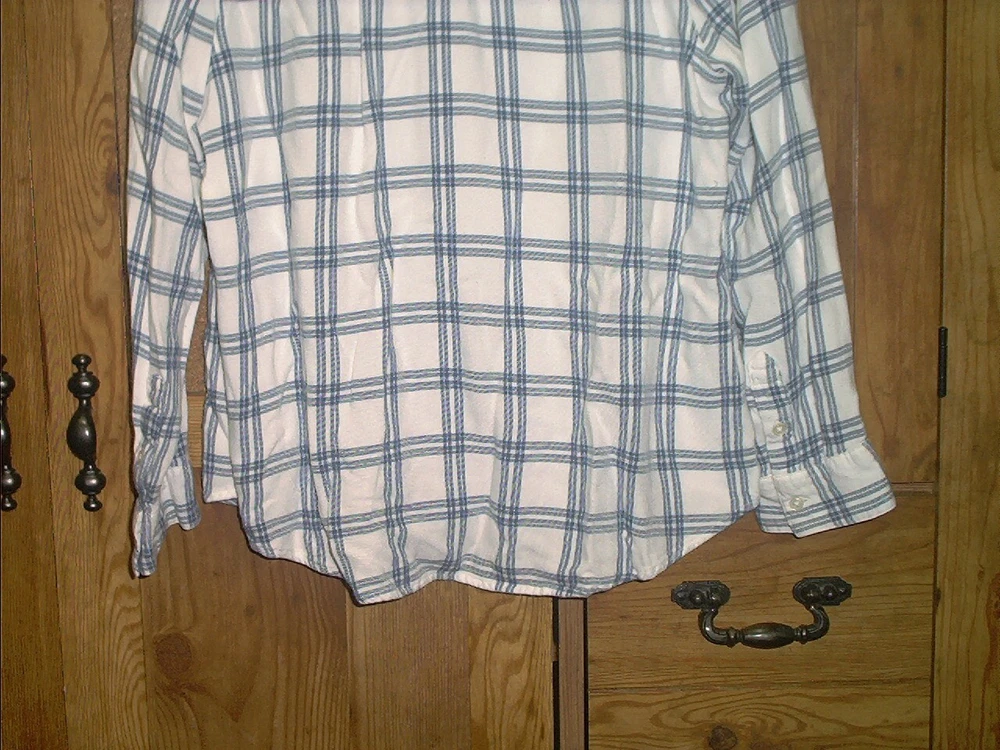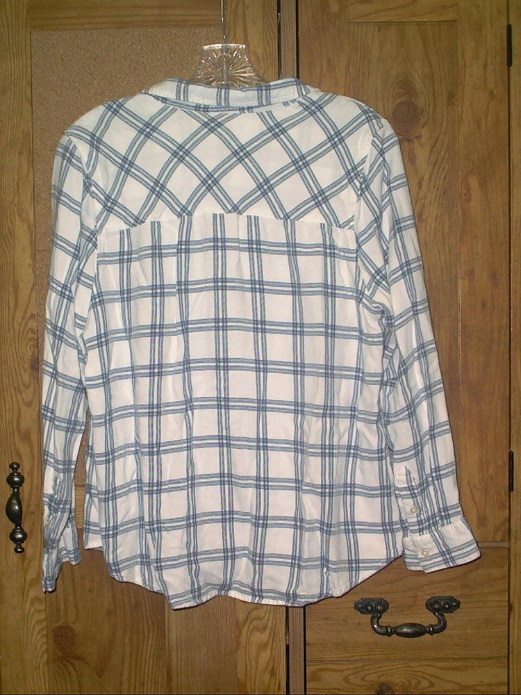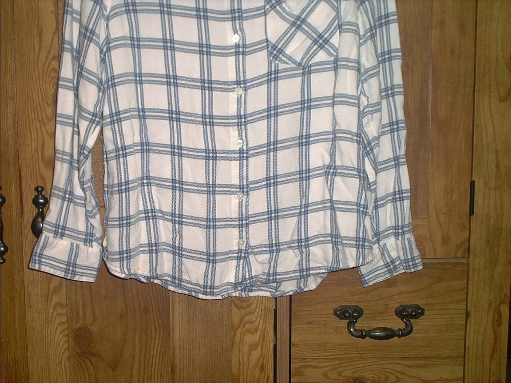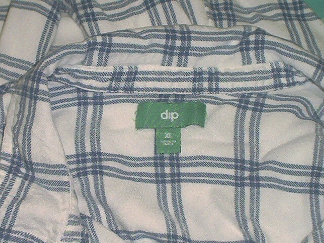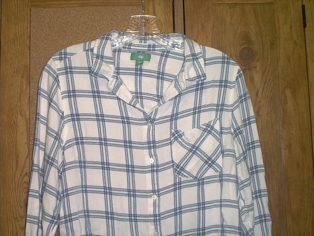 DIP Women's Long Sleeve Blue & White Plaid Viscose Shirt Size XL. DIP women's button up long sleeve shirt is in very good pre-owned condition with no missing buttons or flaws. Blue and White plaid pattern. There is one pocket on the front as seen in photos. The tag states size XL but, c ompare the following measurements to a garment you already own to assure fit. From armpit to armpit, measures 21" and from the back of collar to hem measures approximately 25" in length and from the shoulder to the bottom of the sleeve hem is 21". Shirt is made of 100% Viscose, machine washable cold. From a smoke and pet free environment. Buyer pays shipping. Items ship same or next business day once payment is received. BLKB