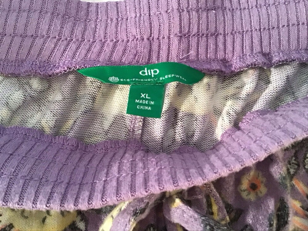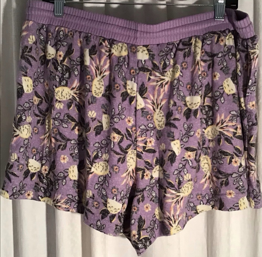 Add a touch of summertime to your wardrobe with these eco-friendly DIP sleepwear shorts. Featuring a relaxed fit and pull-on draw string closure, these shorts are perfect for casual wear or activewear. The purple color with yellow pineapple theme adds a fun pop of color to your outfit. Made of machine washable rayon and polyester with a blended fabric type, these shorts are both comfortable and durable. The elastic waist and pockets make them a practical choice for any occasion. These shorts are available in size XL and are perfect for women who want to stay stylish and comfortable. New without tags! Fun and whimsical comfy shorts! Smoke-free & Pet-free home