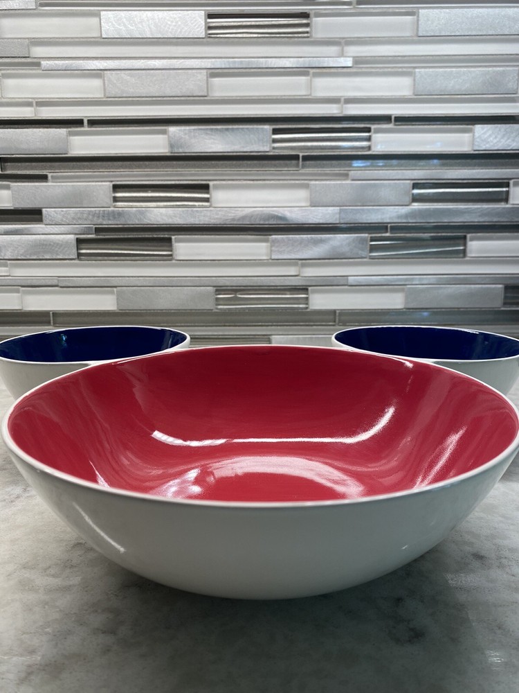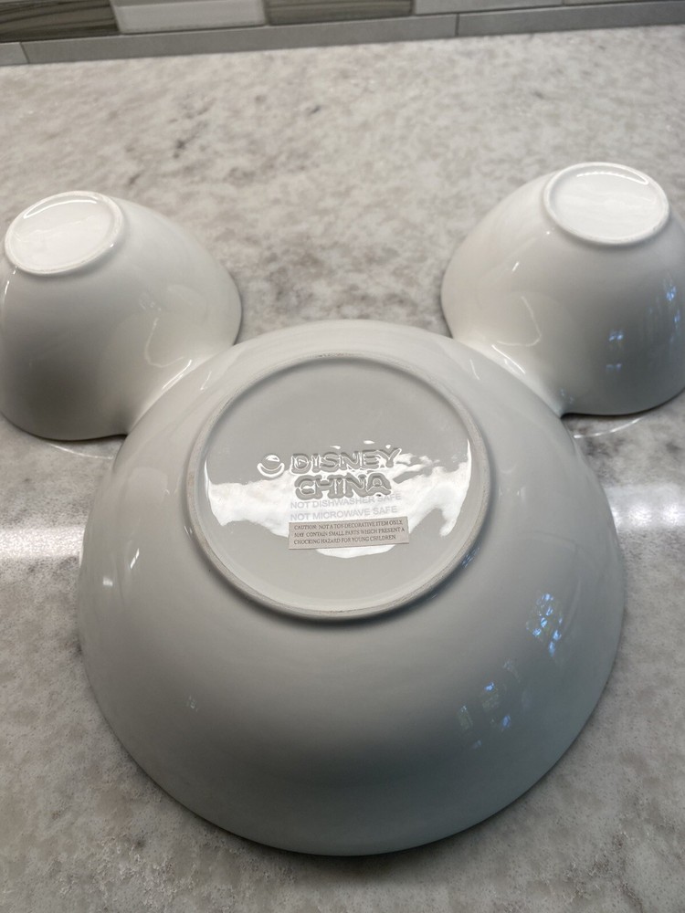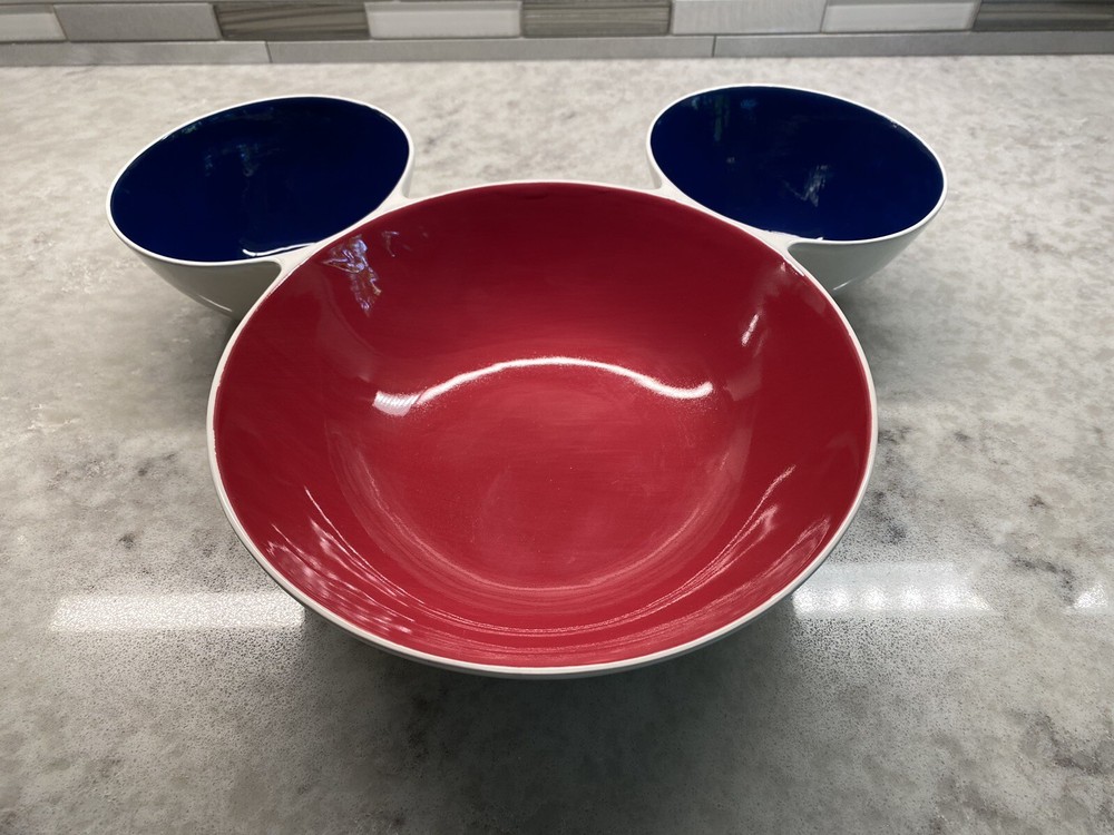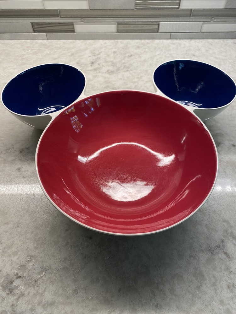 This Disney Mickey Mouse Ears ceramic chip and dip bowl is a must-have for any Disney fan. The bowl features a red, white, and blue color scheme and is great condition, ready to use for your next party or special event. The bowl was manufactured in China and is part of the Disney Direct collection. This item is perfect for collectors of contemporary Disney houseware and would make a great addition to any collection. Don't miss out on the opportunity to add this unique piece to your own collection or to gift it to a fellow Disney lover. Note: Ceramic bowl is not dishwasher or microwave safe. Hand washing only! Main bowl is red, dip bowls are blue, sides & bottom are white. Measurements: 2-3/4” tall Main bowl is nearly 9” round Both ear bowls are 5-1/4” x 4-1/2” oval Top to bottom measures 13” Overall width measures 14” (ear to ear) This item is great condition, no chips, no cracks, no scratches!