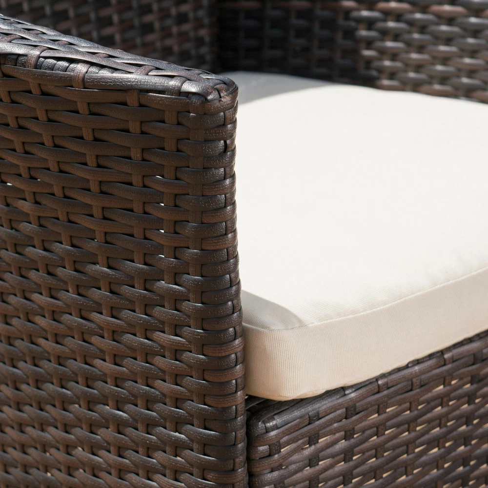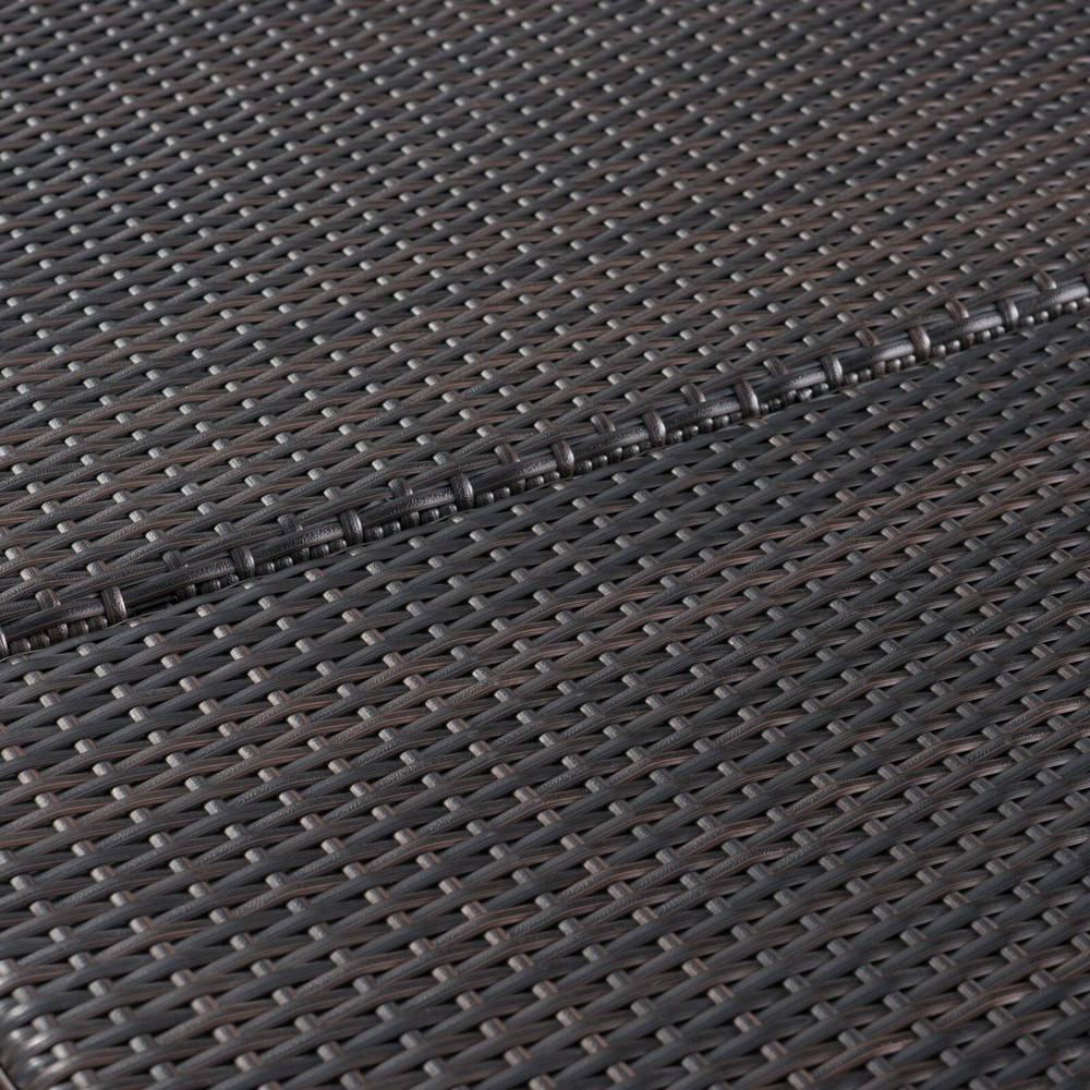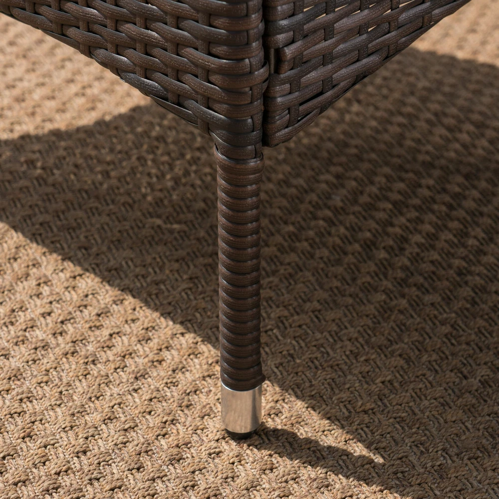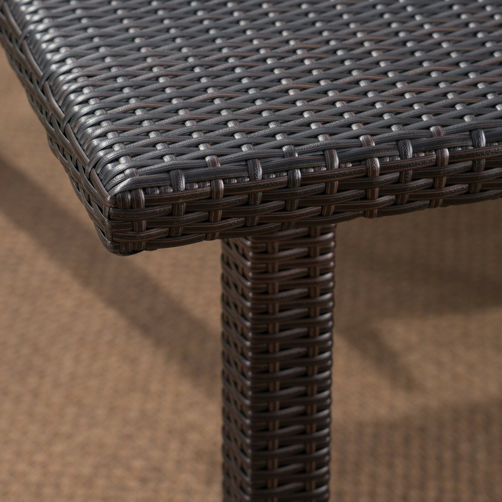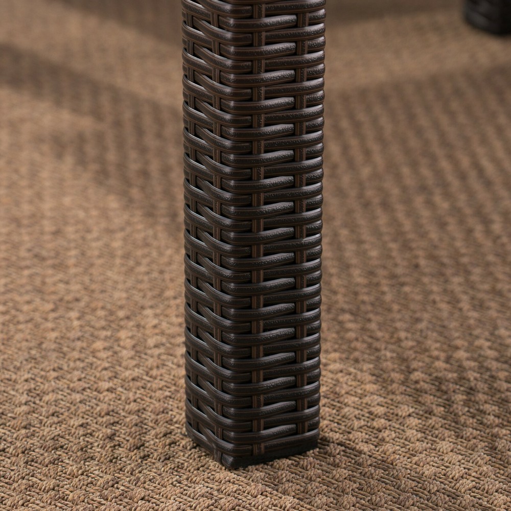 This clean and simple dining set combines the functionality of iron with the comfort of wicker. Complete with a table, and 8 wicker dining chairs, this set offers comfortable seating in the great outdoors. Sure to complement any patio decor, this dining set comes complete with comfortable cushioned chairs, guaranteed to give you a weather resistant set that will last for years to come. Product Details Includes: One (1) Table and Eight (8) Dining Chairs Material: Polyethylene Wicker Frame Material: Iron Cushion Material: Water Resistant Fabric Composition: 100% Polyester Wicker Finish: Multi-brown Cushion Color: Beige Assembly Required Dimensions Table: 64.00"D x 64.00"W x 30.00"H Chair: 23.50"D x 23.00"W x 33.00"H Seat Width: 18.00" Seat Depth: 18.00" Seat Height: 16.00" Arm Height: 23.75"