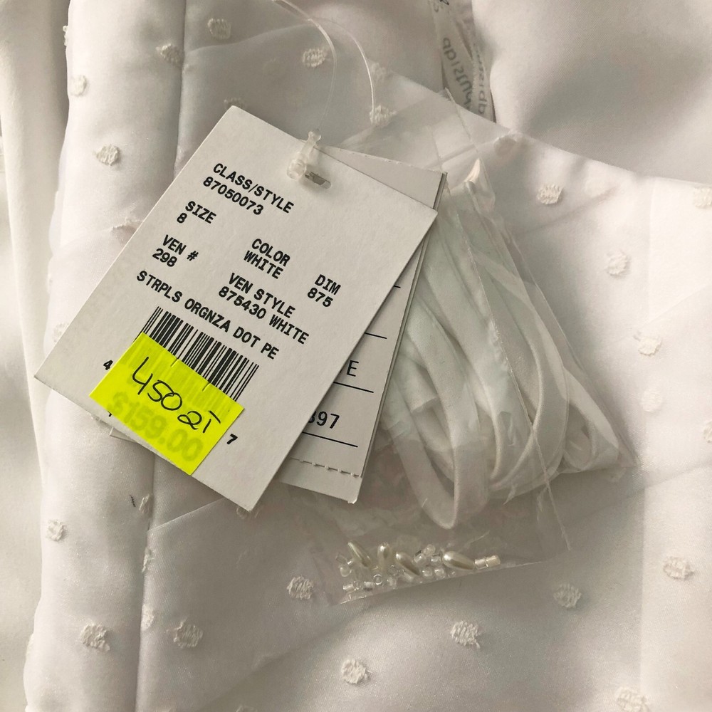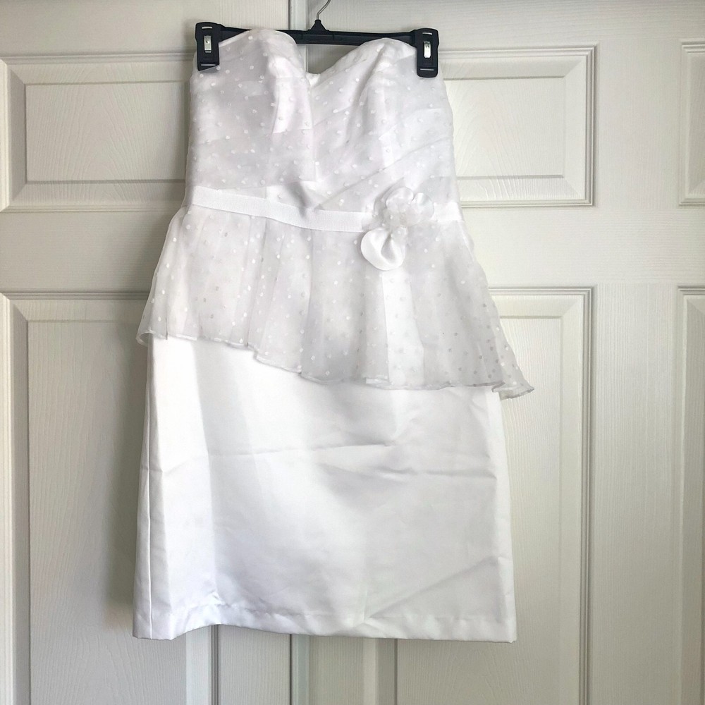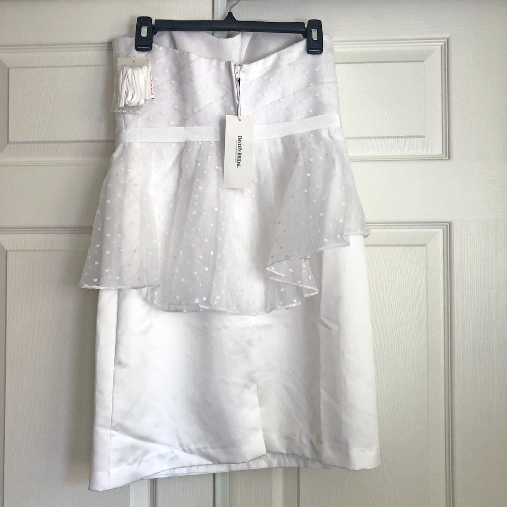 David's Bridal db Studio, Strapless Short Organza Dot Peplum Wedding Dress, Size 8, White, NWT Size 8, No alterations, Never worn, New with Tags. Style #875430. Original retail price of $159. Strapless sweetheart neckline. Short dress, with flattering peplum. No boning in the bodice, but lightly structured. Back is not too low, so you can wear a standard strapless bra. Bodice, peplum, and decorative flower detail at waist, are a polka dot white on white organza. Skirt is just above knee length (for reference I'm 5'-6") and is slightly tapered, but not as tight as a standard pencil skirt. Zip back. LWD (little white dress): Great for an all-white party, modern wedding dress, or for a bachelorette party, bridal shower, or rehearsal dinner. Please message me if you have any other questions :)