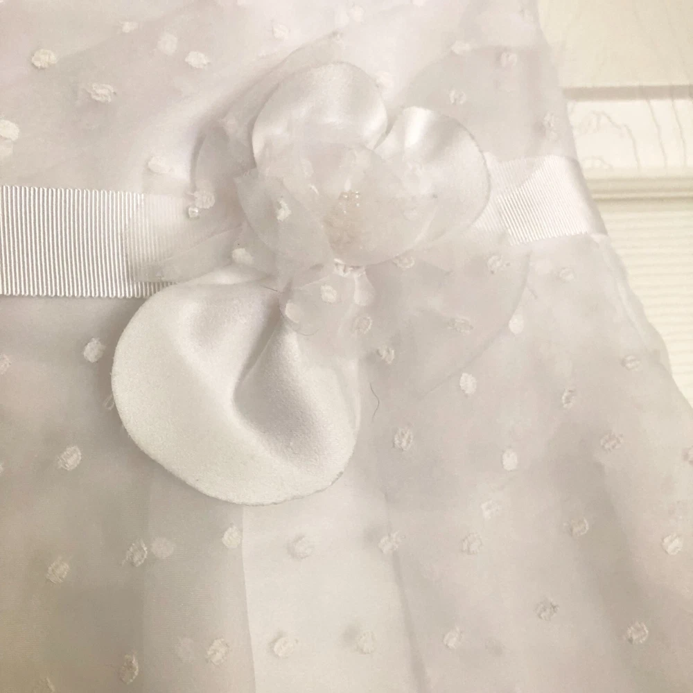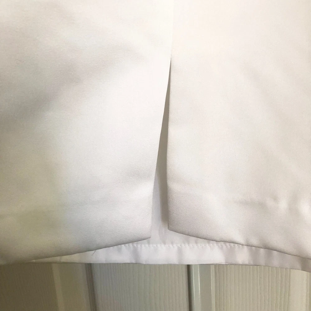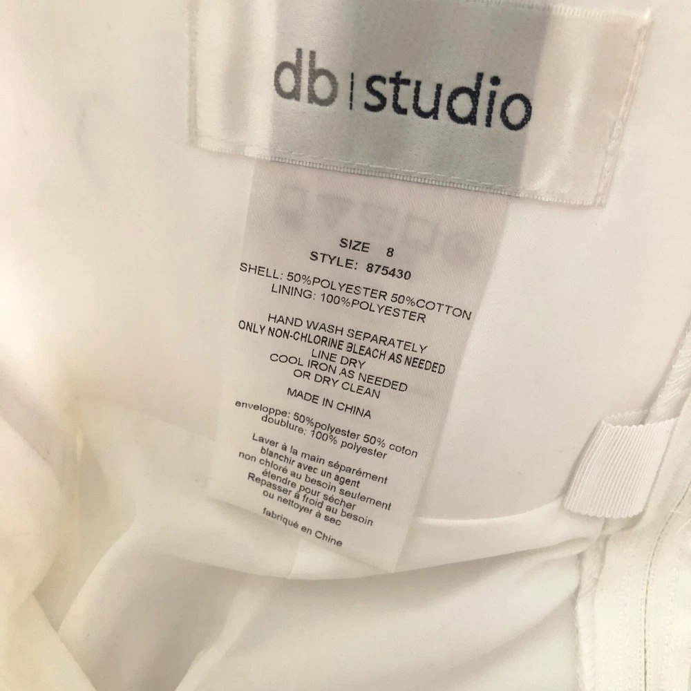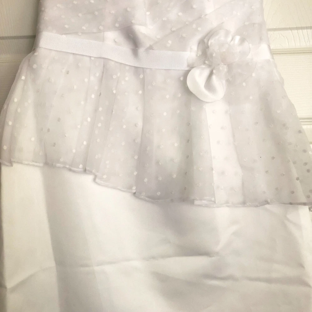 David's Bridal db Studio, Strapless Short Organza Dot Peplum Wedding Dress, Size 8, White, NWT Size 8, No alterations, Never worn, New with Tags. Style #875430. Original retail price of $159. Strapless sweetheart neckline. Short dress, with flattering peplum. No boning in the bodice, but lightly structured. Back is not too low, so you can wear a standard strapless bra. Bodice, peplum, and decorative flower detail at waist, are a polka dot white on white organza. Skirt is just above knee length (for reference I'm 5'-6") and is slightly tapered, but not as tight as a standard pencil skirt. Zip back. LWD (little white dress): Great for an all-white party, modern wedding dress, or for a bachelorette party, bridal shower, or rehearsal dinner. Please message me if you have any other questions :)