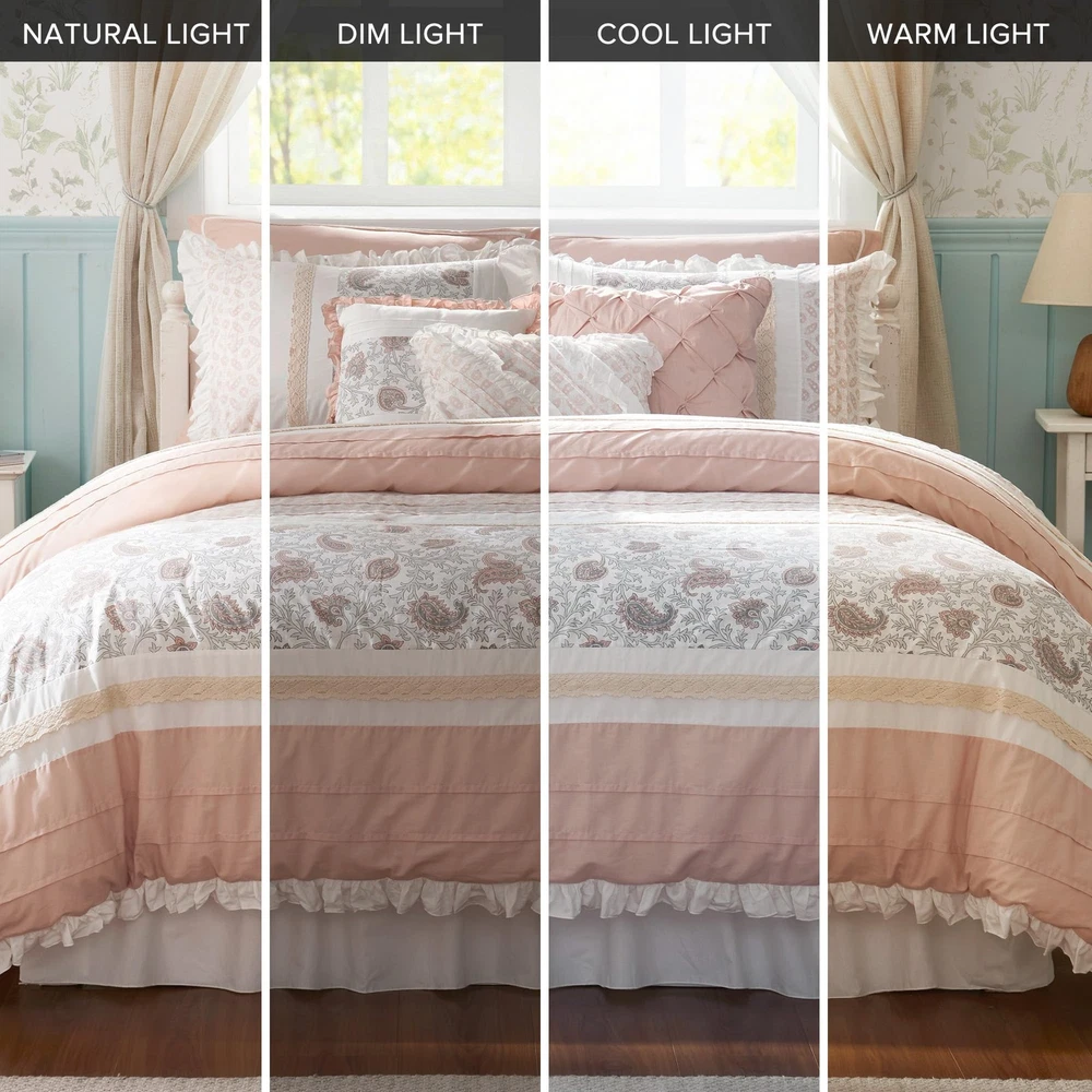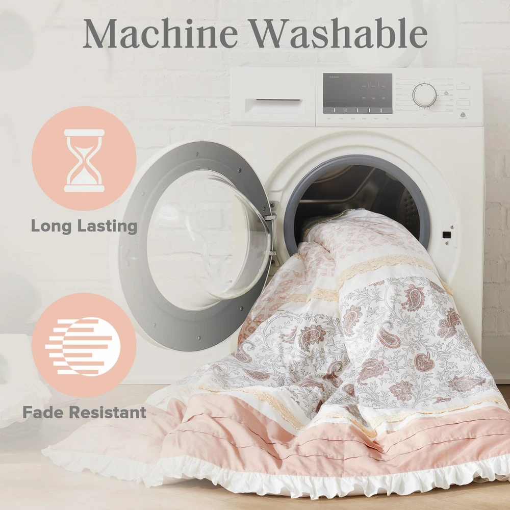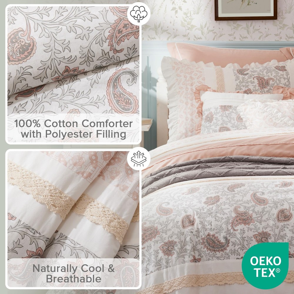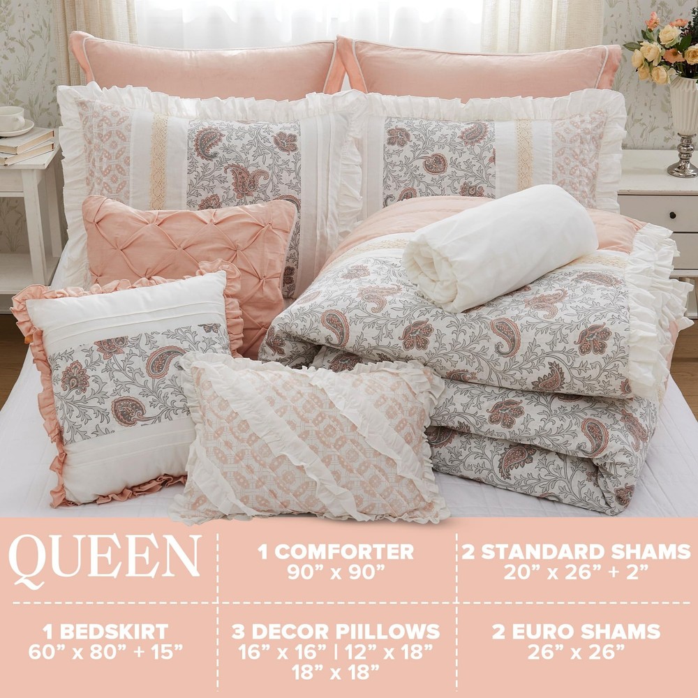 Style: The Dawn 9 Piece Cotton Percale Comforter Set offers a shabby chic update to your bedroom décor Unique Design: A paisley print is featured on the cotton comforter with pintucked fabric separated by lace taping embellishments. Around the edge, a ruched flange adds a graceful touch, for a charming cottage look High Quality Fabric: Naturally breathable and lightweight cotton fabric that is Oeko-Tex certified to have no chemical harmful substance paired with plush poly filling for a perfect all season bedding Set includes: 1 Comforter:90"W x 90"L, 2 Standard Shams:20"W x 26"L+2D", 1 Bedskirt:60"W x 80"L+15"D, 3 Decorative Pillows:16"W x 16L"/12"W x 18"L/18"W x 18"L, 2 Euro Shams:26"W x 26"L Care Instructions: Machine wash cold, gentle cycle. Do not bleach. Tumble dry low. Remove promptly and use steamer if necessary. If there is limited movement in the washer or dryer, use large capacity commercial washer dryer
