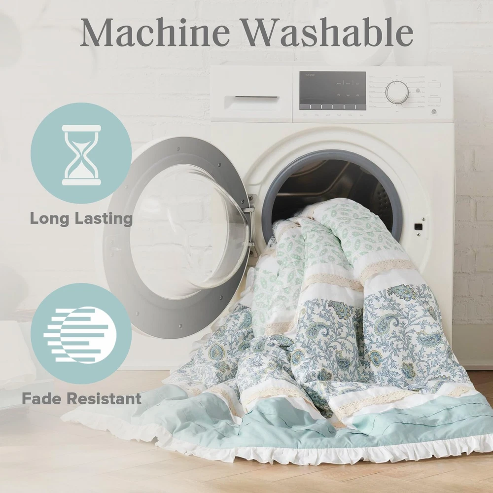 The Dawn 9 Piece Cotton Percale Comforter Set offers a shabby chic update to your bedroom decor. A paisley print is featured on the cotton comforter with pintucked fabric separated by lace taping embellishments. Around the edge, a ruched flange adds a graceful touch, for a charming cottage look. Naturally breathable and lightweight cotton fabric that is Oeko-Tex certified to be free of any chemicals and harmful substance paired with hypoallergenic filling for a perfect all season bedding. Set includes: 1 Comforter:104x92", 2 King Shams:20x36+2", 2 Euro Shams:26x26", 1 Bed Skirt:78x80+15", 3 Pillows:16x16"/12x18"/18x18" Care instructions: Machine wash cold, gentle cycle. Do not bleach. Tumble dry low. Remove promptly and use steamer if necessary. If there is no free movement in the washer or dryer, use large capacity commercial washer/dryer.