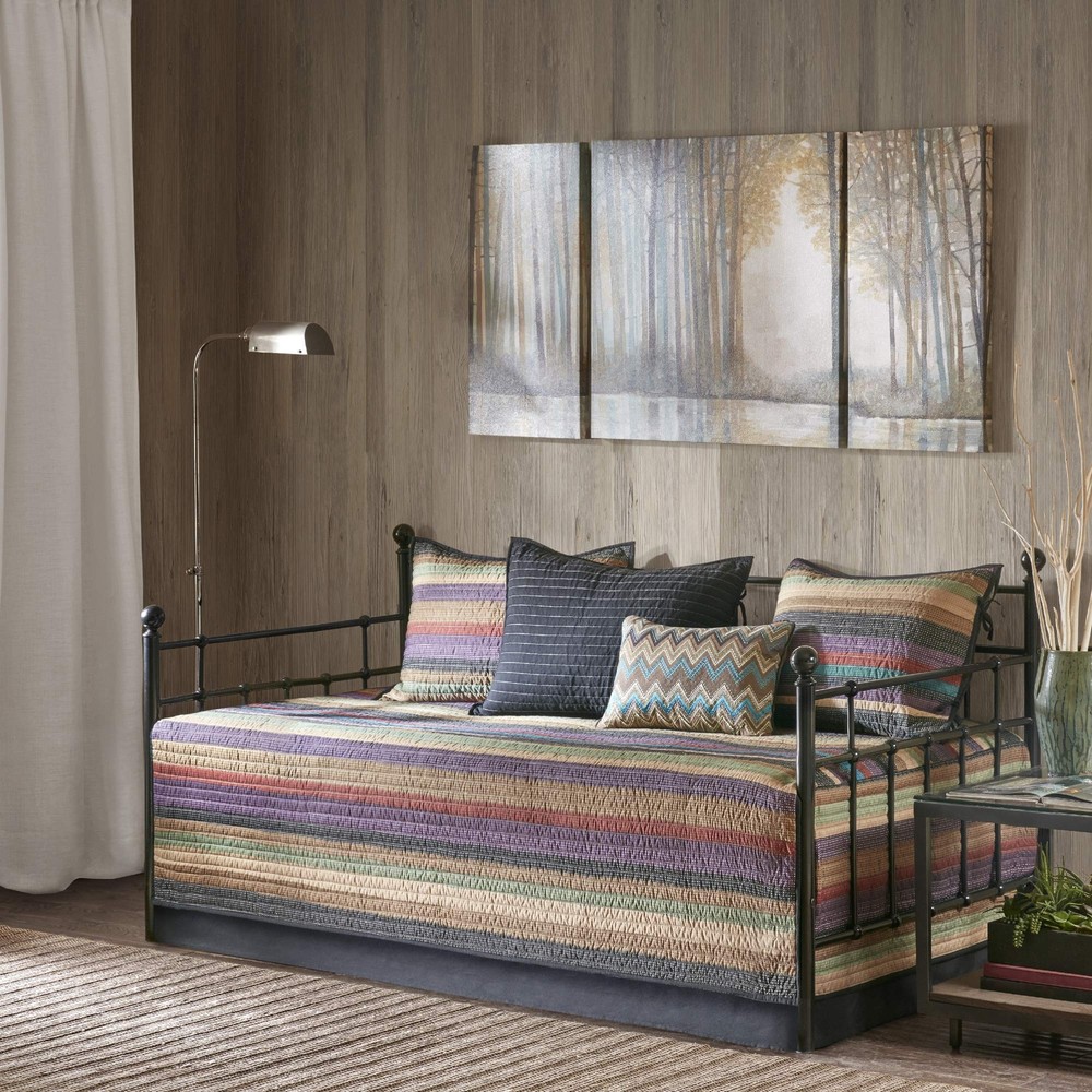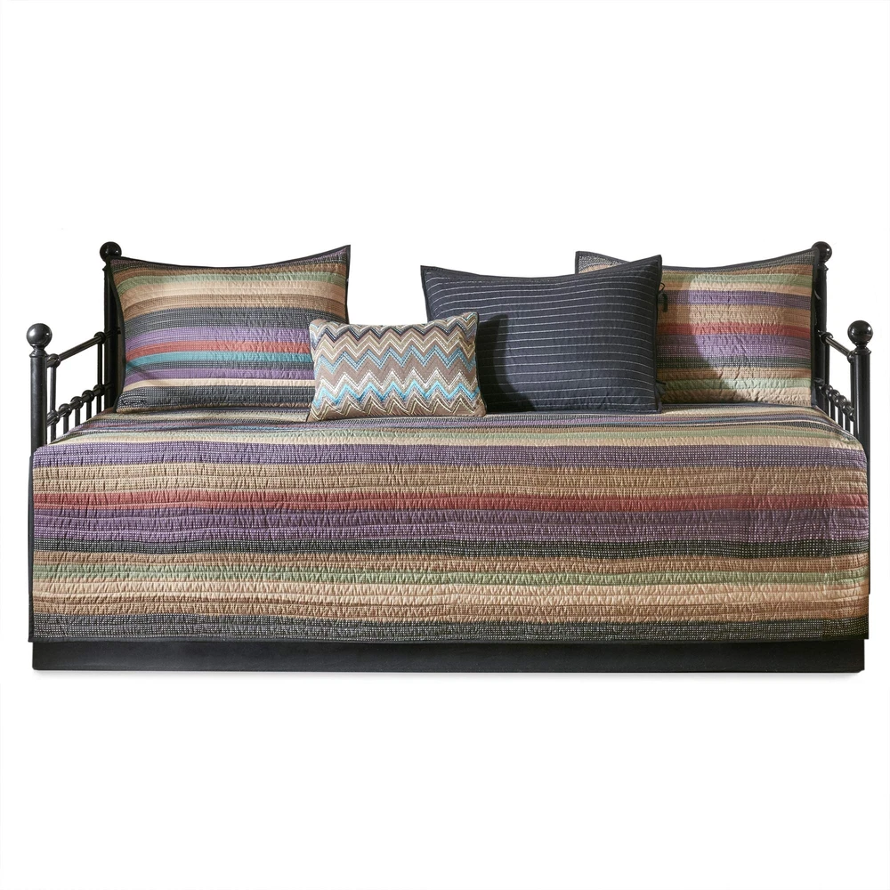 Create a warm and inviting space in your guest room with the Tissa 6 Piece Reversible Daybed Cover Set. This quilted daybed cover features a multicolor stripe print with a pin-striped reverse to create a chic lodge-inspired look. The 3 reversible shams repeat the patterns seen on the daybed and feature tie closures on the sides, adding a charming accent. An oblong decorative pillow with a multicolor chevron stripe pattern and a solid bedskirt add the finishing touches to this reversible daybed set. Machine washable for easy care, this daybed cover set easily fits a Twin size mattress. For an updated look, the Yosemite 6 Piece Reversible Daybed Cover Set can bring a brand new esthetic to your guest room. The quilted collection features shades of purple, teal, and earth tones in thin striping to create a beautiful look. Naturally really soft and durable cover perfect for summer use and add on layer in cold season Set includes: 1 Daybed Cover: 75"Wx39"L, 3 Standard Shams: 20"Wx26"L, 1 Bedskirt: 39"Wx75"L + 15"D, 1 Decorative Pillow: 12"Wx18"L Care instructions: machine washable, spot clean pillow