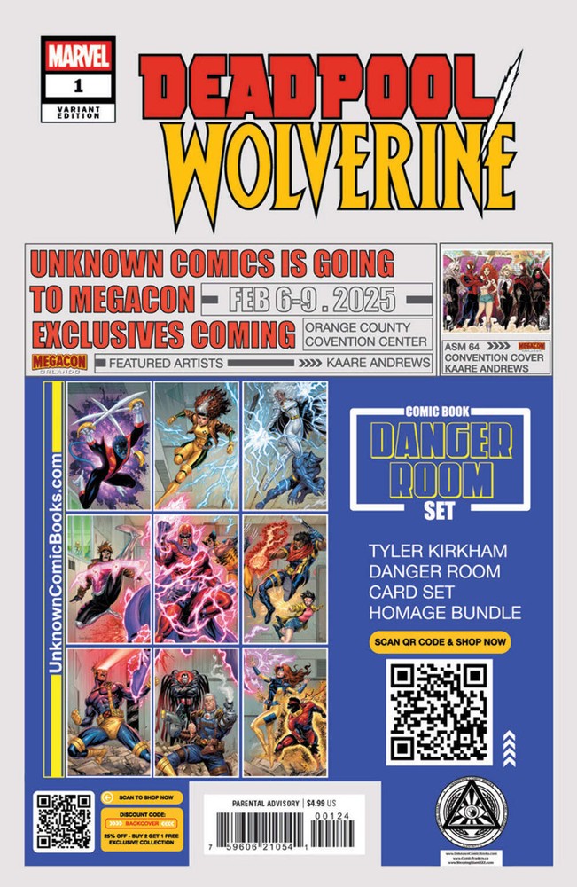 The Deadpool/Wolverine #1 exclusive by Tyler Kirkham is a must-have for fans! The battle-damaged premium variant looks stunning, full of dynamic energy and detail. Kirkham's art perfectly captures the chaotic yet iconic duo—Deadpool's humor and Wolverine's intensity shine. The virgin cover makes it even more special, a standout piece for collectors. If you love bold, action-packed comics with top-tier artwork, don’t miss this! (Pre-orders ship after the 2025 release.)