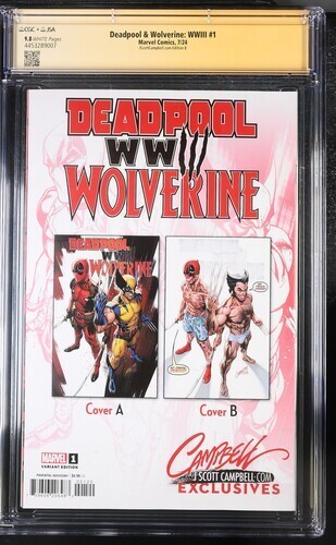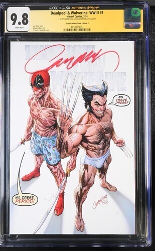 Deadpool & Wolverine WWIII #1 CGC x JSA 9.8 signed by J Scott Campbell. You will receive exactly what is pictured in the listing. Items will be shipped extremely carefully to insure they arrive in excellent condition. All S/H for this auction varies. I do combine items for shipping. Insurance is included with all shipping. For International buyers please note any custom fees charged by your country are your responsibility. I will always try to accommodate any special requests. If there are ever any problems regarding your purchase please contact me prior to putting in claims, leaving negative feedback, or giving out low ratings. I aim for 5 out of 5 stars all the time and will always do my best to fix any issues. I always make sure my customers are happy!!!! I ship fast and secure, just check my feedback. Please feel free to E-mail me with any questions or if you need larger scans. Please check out my other auctions!! Happy Bidding. Good Luck.