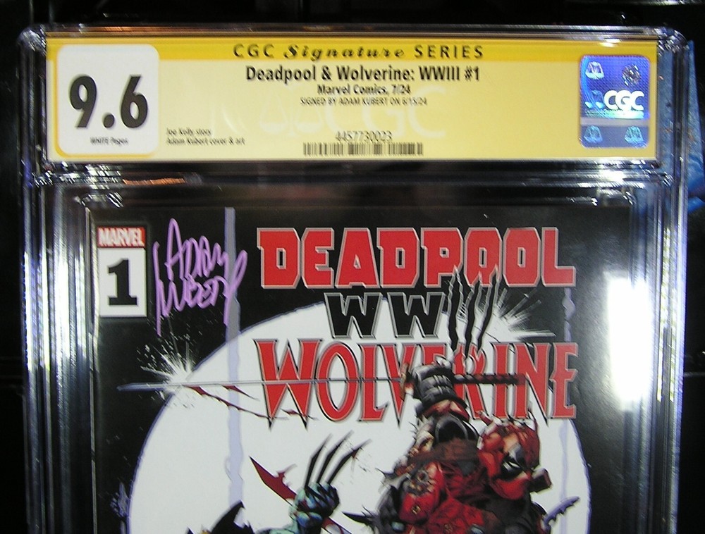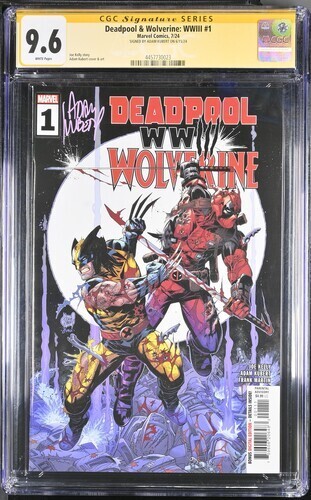 This is a rare and highly sought-after comic book featuring the iconic characters Deadpool, Wolverine, Logan, and Wade Wilson. The comic is part of the Deadpool & Wolverine: Wwiii series and is signed by the talented Adam Kubert, making it a valuable addition to any collection. The comic has been professionally graded by the Certified Guaranty Company (CGC) with a grade of 9.6 Near Mint+, ensuring its quality and authenticity. The comic is in English and was published by Marvel Comics in 2024. It is a must-have for any fan of superheroes and US comics. The cover art by Adam Kubert and Frank Martin is stunning, making the comic a true collector's item. Don't miss out on the opportunity to own this rare and highly coveted comic book.