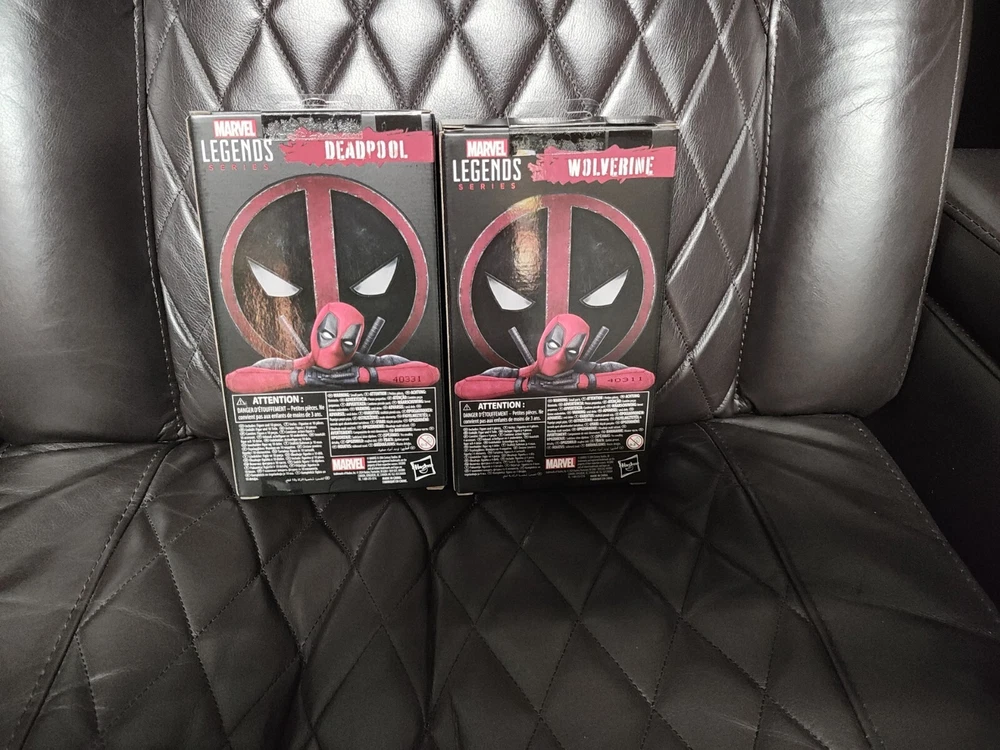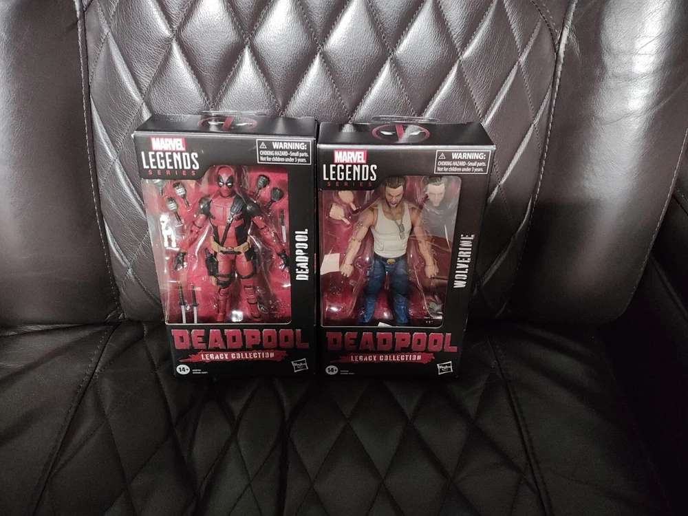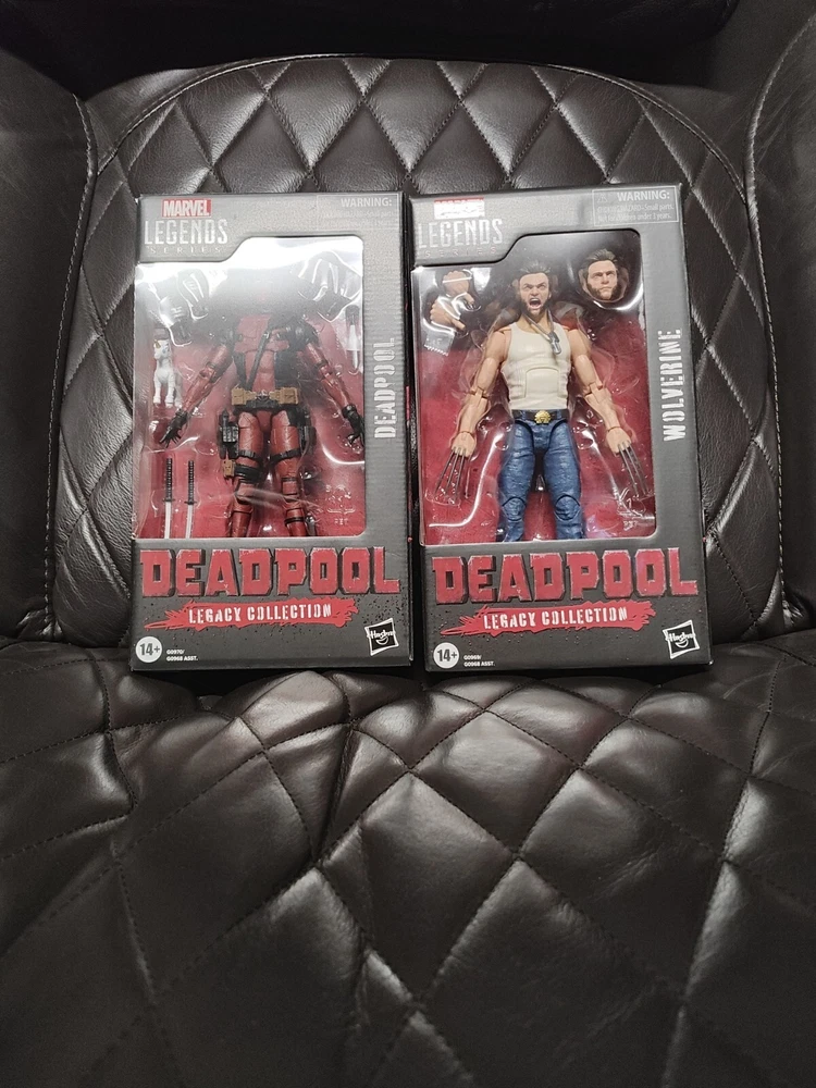 For sale is a set of action figures from the Marvel Legends Legacy Collection featuring Deadpool and Wolverine. These highly detailed figures stand 6 inches tall and come with a gun and sword made of durable plastic. The figures are based on the Marvel comic book characters and are an original licensed reproduction by Hasbro. The set is in hand and ready to be shipped to your doorstep. Fans of the Deadpool franchise will love this addition to their collection, as well as those who appreciate highly detailed action figures. Don't miss out on the opportunity to own these iconic characters from the Marvel universe.