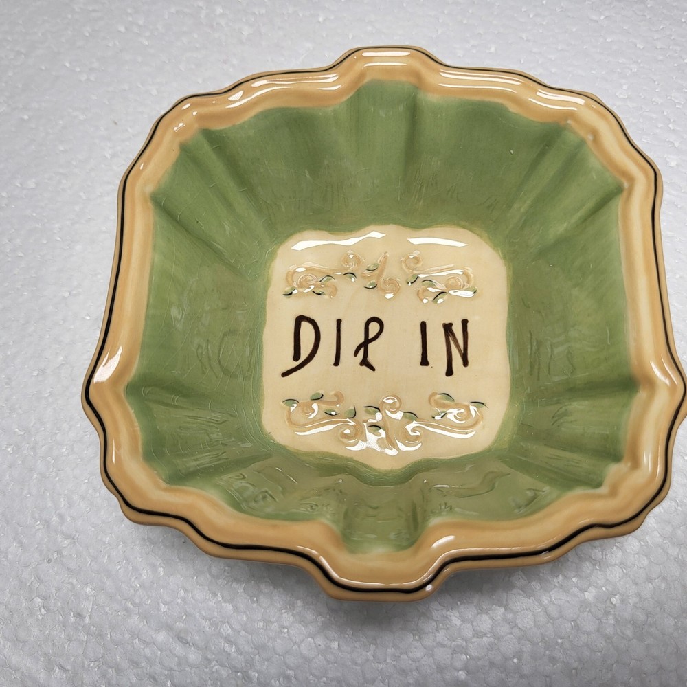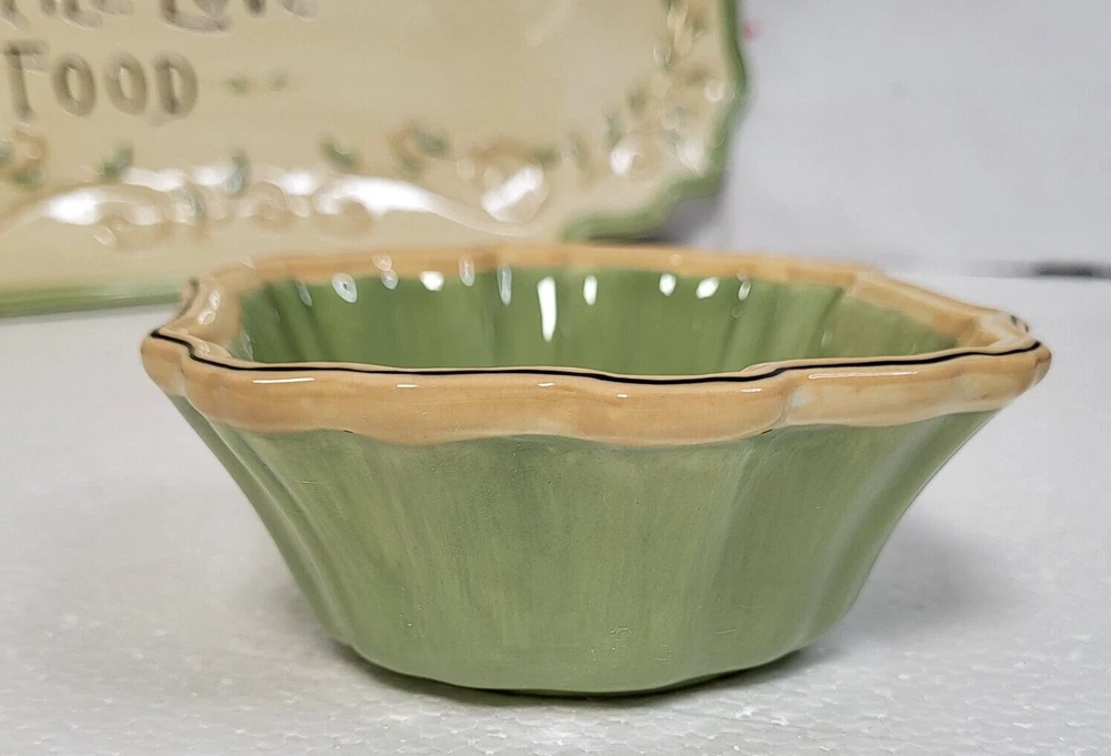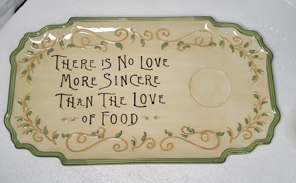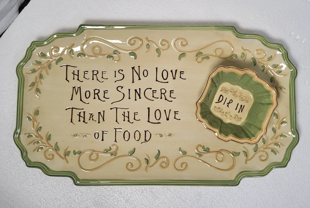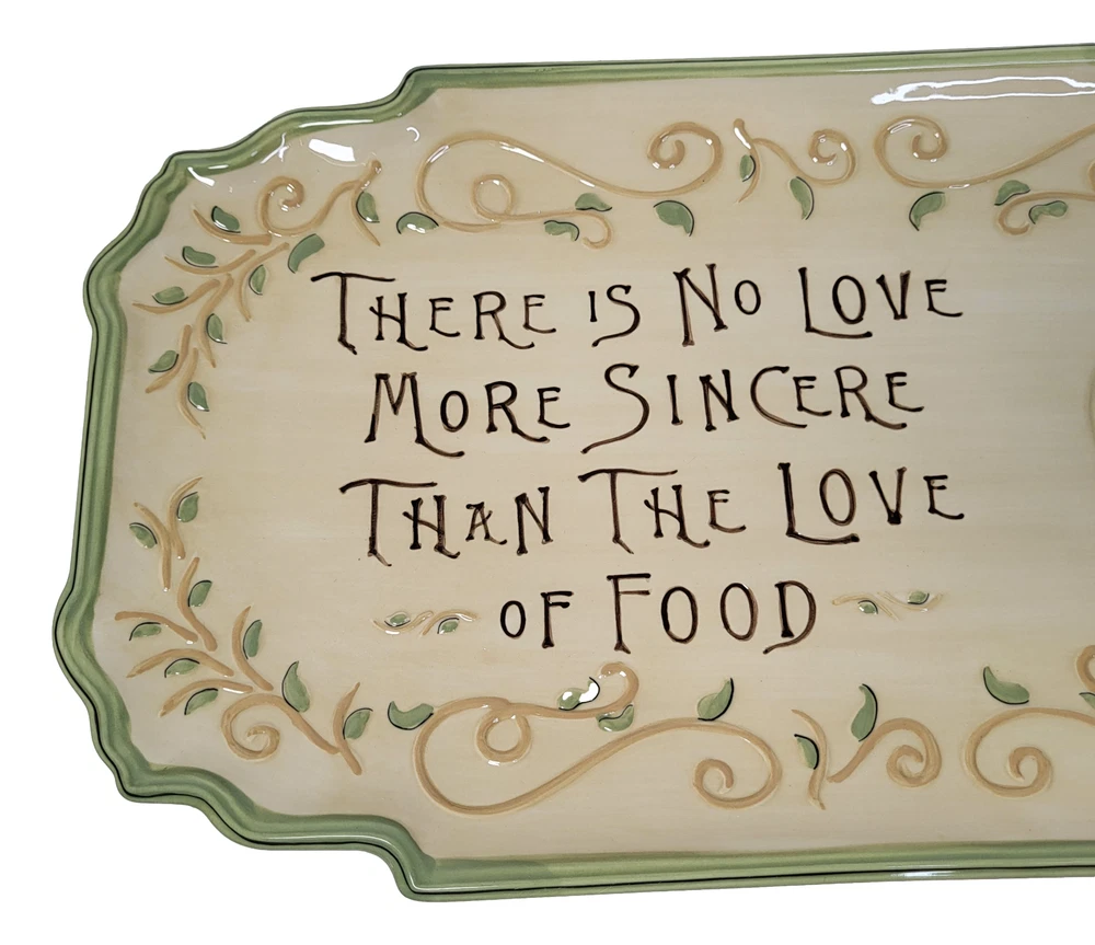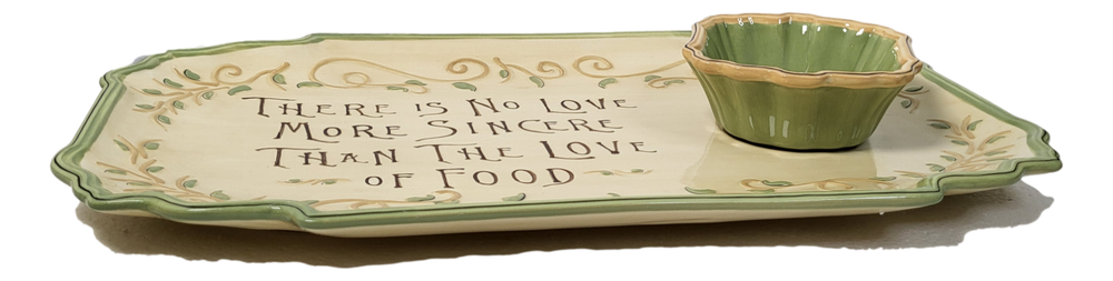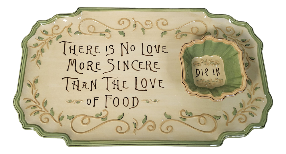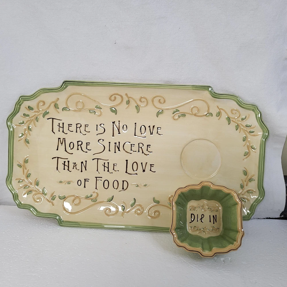 Enhance your gatherings with the Large Decorative Crudites Platter from Grasslands Road Serving Up Style collection, a serving set that marries functionality with elegance. The set includes a generously sized ceramic tray, measuring 17.5 inches in length and 12 inches in width, perfect for presenting an array of appetizers and snacks. Its glossy finish and vibrant floral pattern bring a touch of garden-style charm to any table setting. Designed with the modern host in mind, this platter features long rectangle octogen shape with scalloped edging, ideal for keeping appetizers organized and visually appealing. It's dishwasher safe for easy cleanup and microwave safe for convenient warming. The accompanying dip bowl adds a practical yet stylish element to this two-piece set, making it a must-have for any occasion that celebrates the love of food. Beautiful floral vine pattern designed in colors of yellow, cream and sage green. Fun foodie quote is inscribed on the platter that reads, "There is no love more sincere than the love of food". Perfect size for family gatherings, holidays, celebrations and parties.