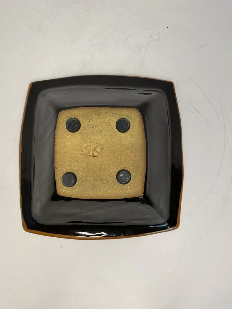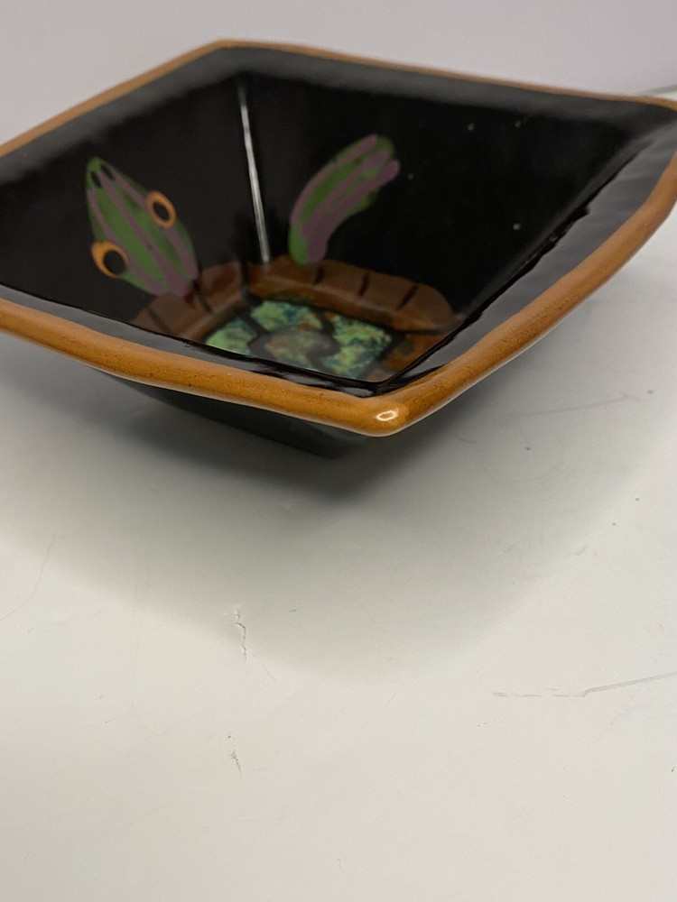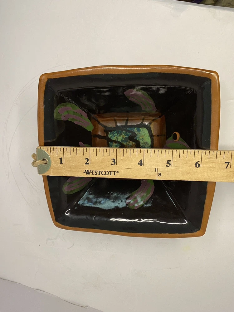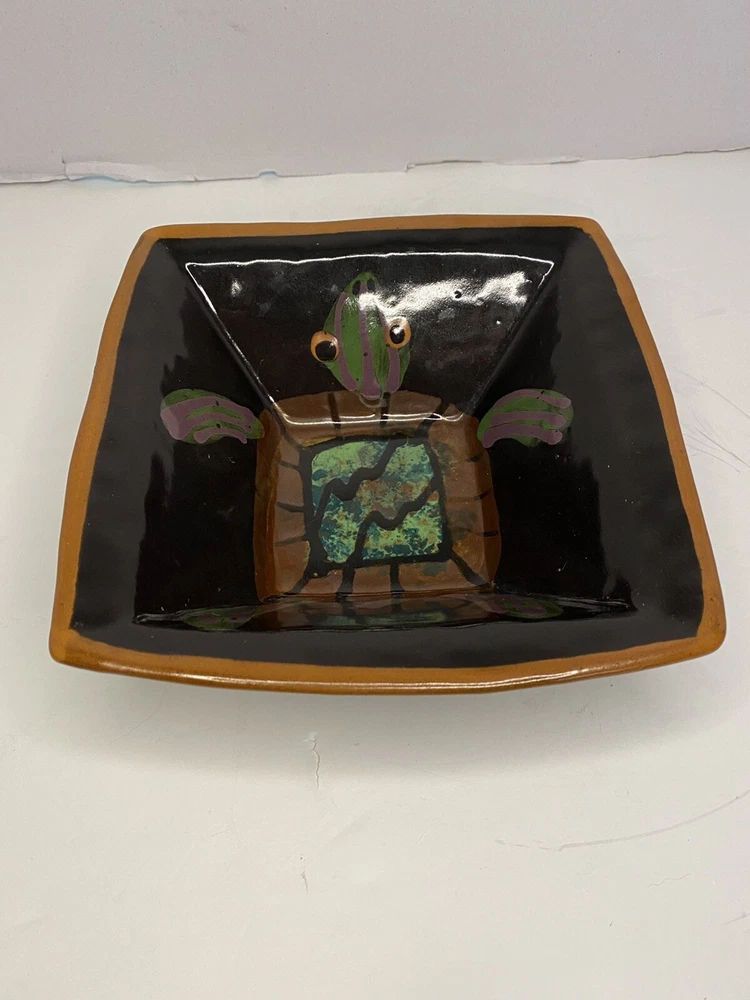 Decorative Marked Pottery Bowl Turtle Design EUC Tortoise S.K.. Excellent Preowned Condition. No chips or cracks. Tiny pits on inside glaze appear to be part of manufacturing process. Inside out tortoise flattened into square shaped bowl (6-3/4” to a side, 2” tall). Cute graphic. Please see photographs. #Handmade #Turtle #Tortoise #Earthtones #Abstract