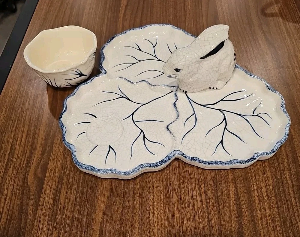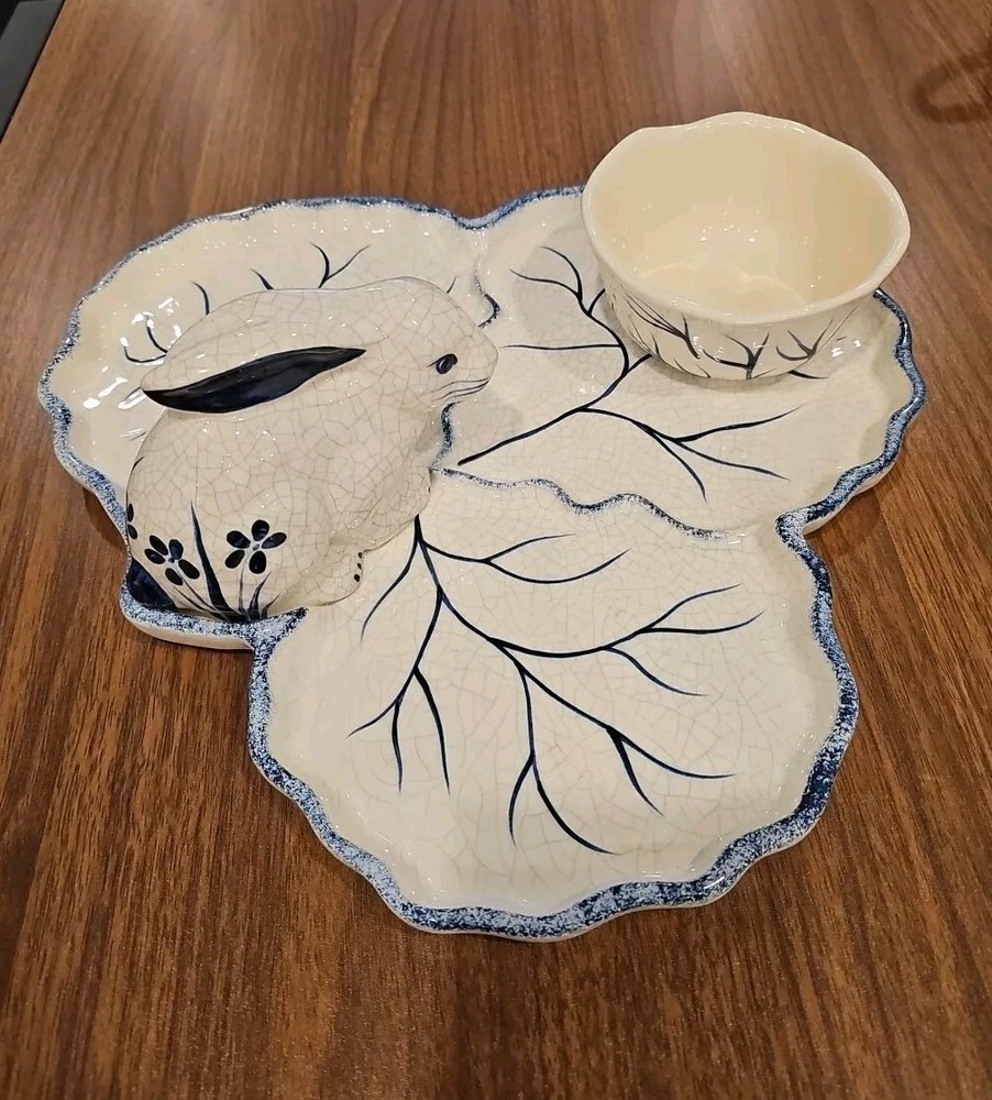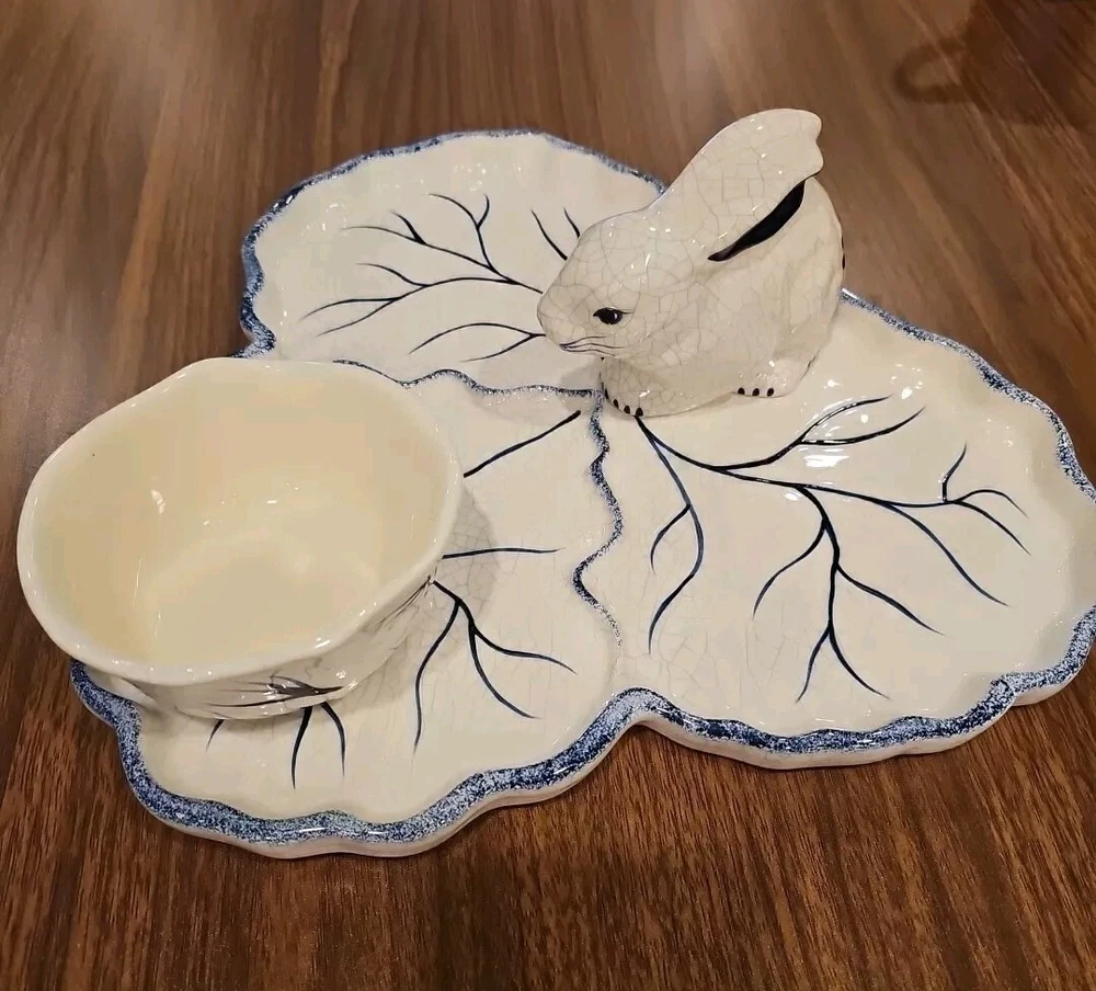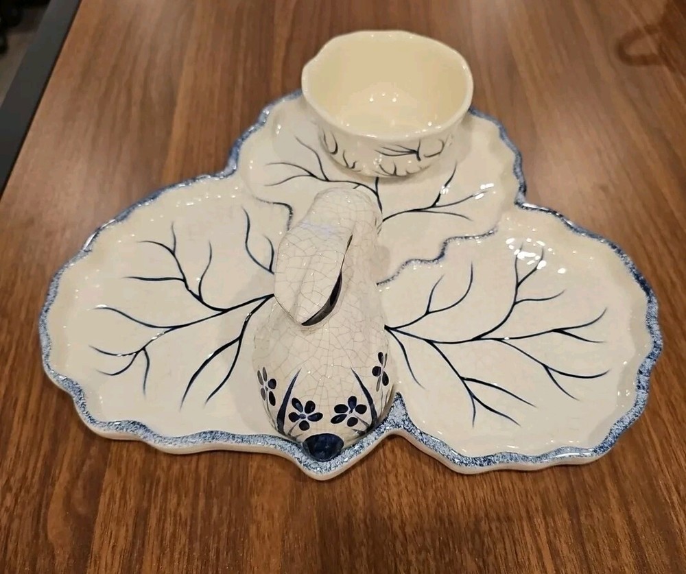 This is a Vintage Dedham Rabbit/Bunny 2 Piece Chip and Dip Set perfect for Easter. It is a large blue ceramic/porcelain serving piece featuring a rabbit design. The item measures 14.5 inches in length and was manufactured in 1993 in the United States. The set includes a chip and dip bowl with a glazed finish. Its in excellent condition with no chips or cracks.