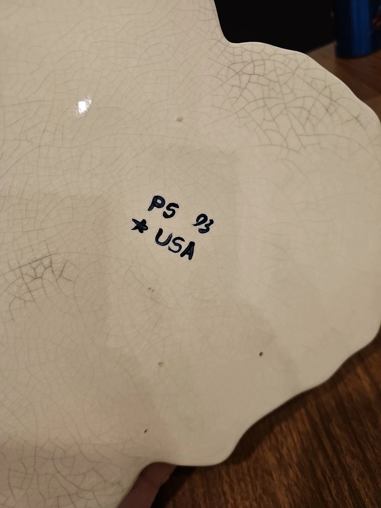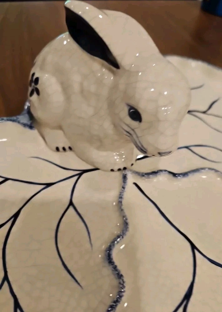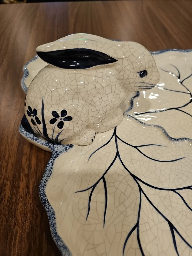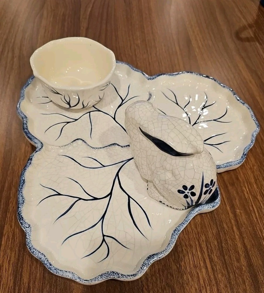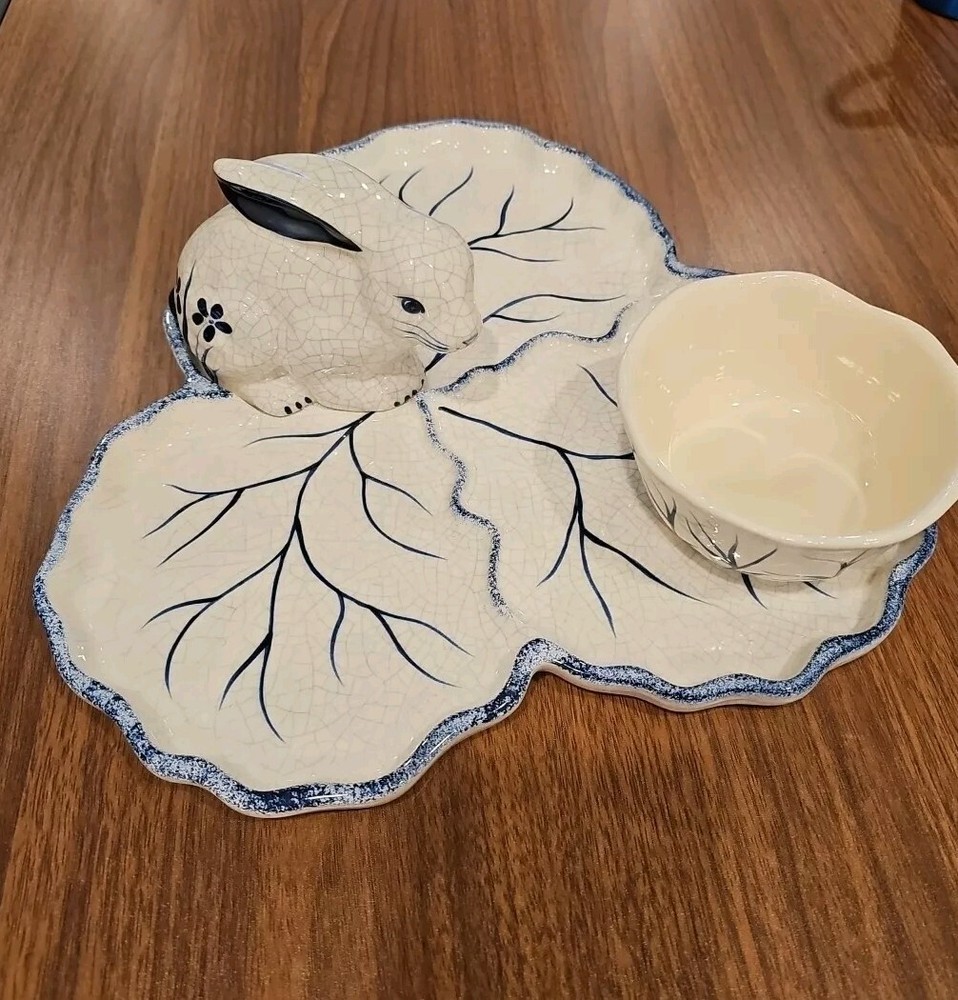 This is a Vintage Dedham Rabbit/Bunny 2 Piece Chip and Dip Set perfect for Easter. It is a large blue ceramic/porcelain serving piece featuring a rabbit design. The item measures 14.5 inches in length and was manufactured in 1993 in the United States. The set includes a chip and dip bowl with a glazed finish. Its in excellent condition with no chips or cracks.