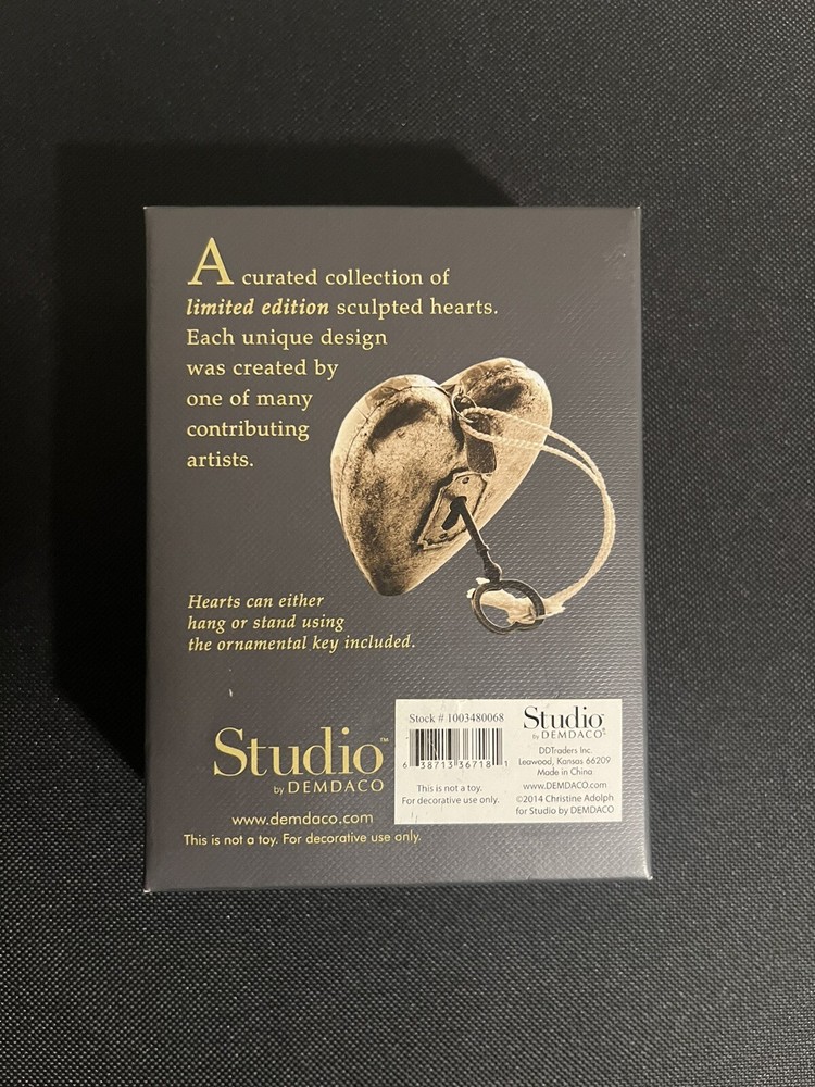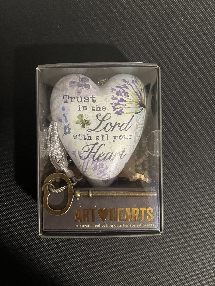This stunning Demdaco Art Heart, designed by Christine Adolph, is a perfect addition to any collection. The intricate details and beautiful colors make it a true masterpiece. The heart-shaped design and inspiring message, "Trust in the Lord with all your heart," accompanied by a key, make it a wonderful gift for a loved one or a gorgeous decoration for any room. The brand, Studio, is known for its high-quality collectibles, and this Art Heart is no exception. The Art Deco style adds to the overall beauty of the piece. Get ready to add a touch of elegance to your space with this beautiful Art Heart. Brand New Please look carefully before purchasing this Let me know if you have any questions concerns regarding this item since I have a NO return policy