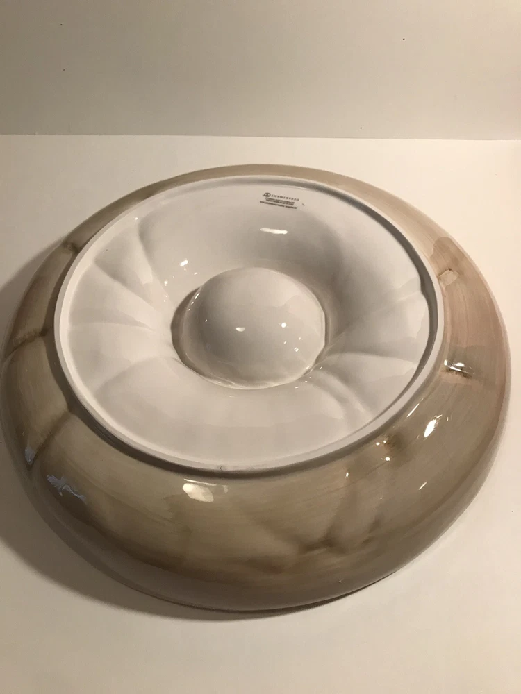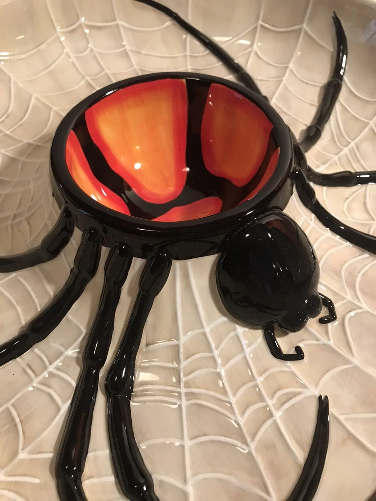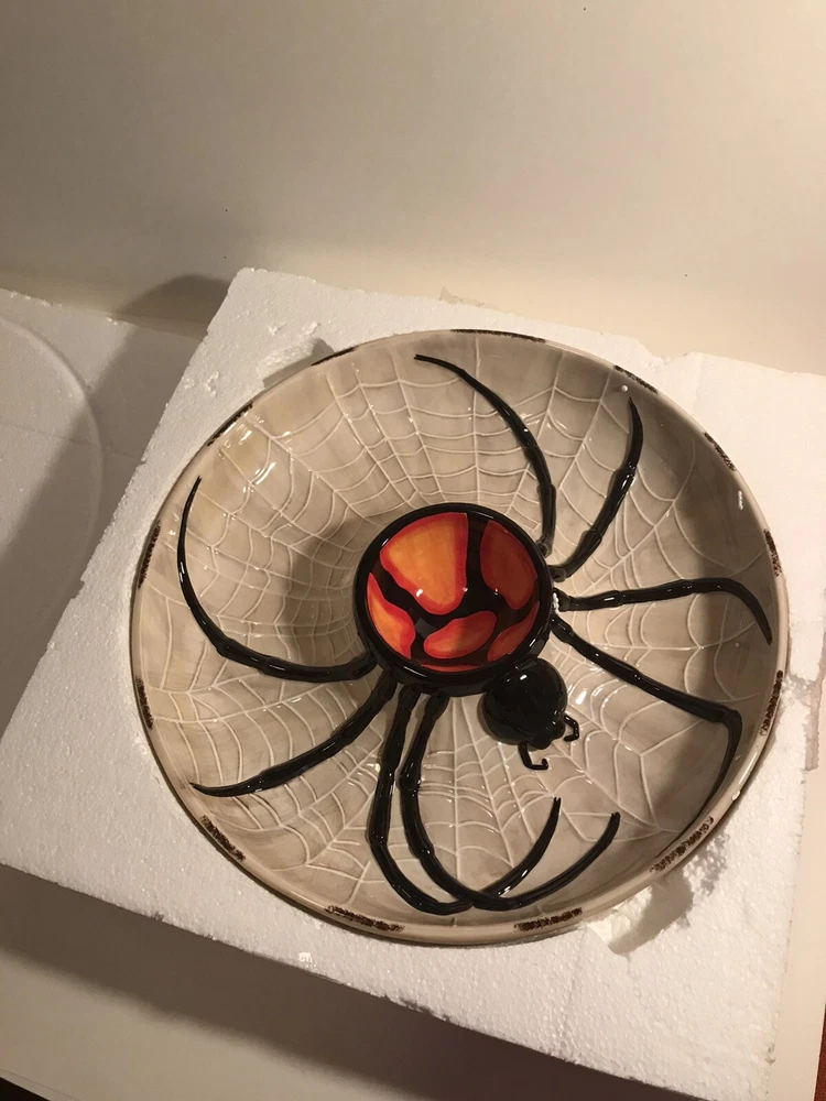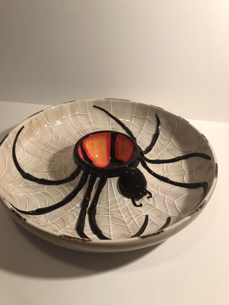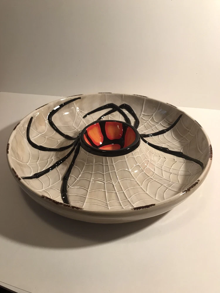 Add a spooky touch to your table with this large 14" serving piece from Department 56. Featuring a round shape with a glossy finish, this Halloween-themed piece is perfect for any occasion. The multicolor spider chip and dip design is made of ceramic and porcelain materials, and comes with its original box. This retired piece is from 2004 and is part of the Halloween collection. The spider web theme is perfect for any Halloween-loving collector or guest. Get ready to impress with this unique and creepy cool serving piece.