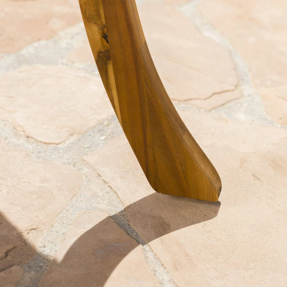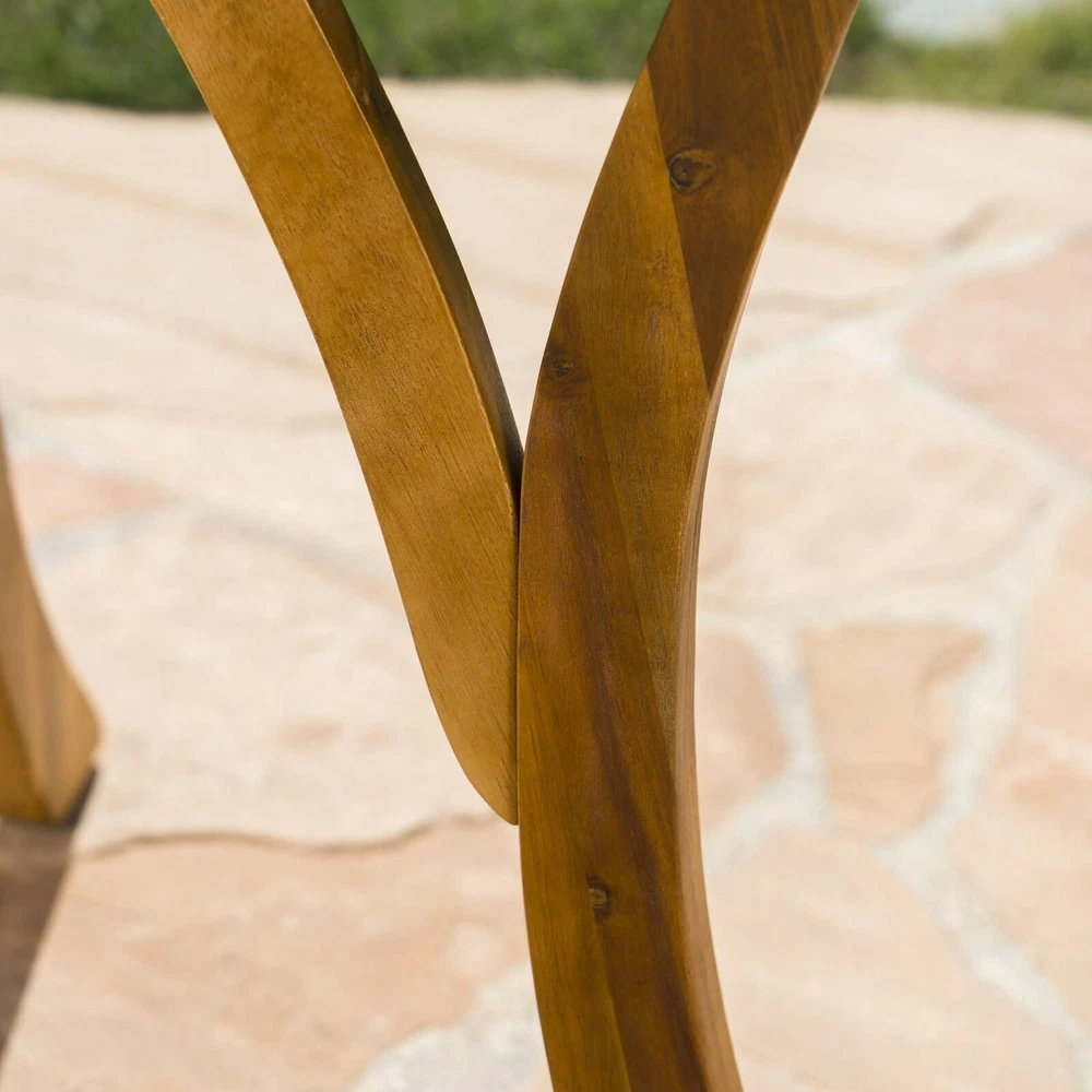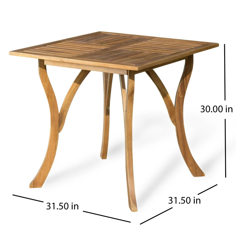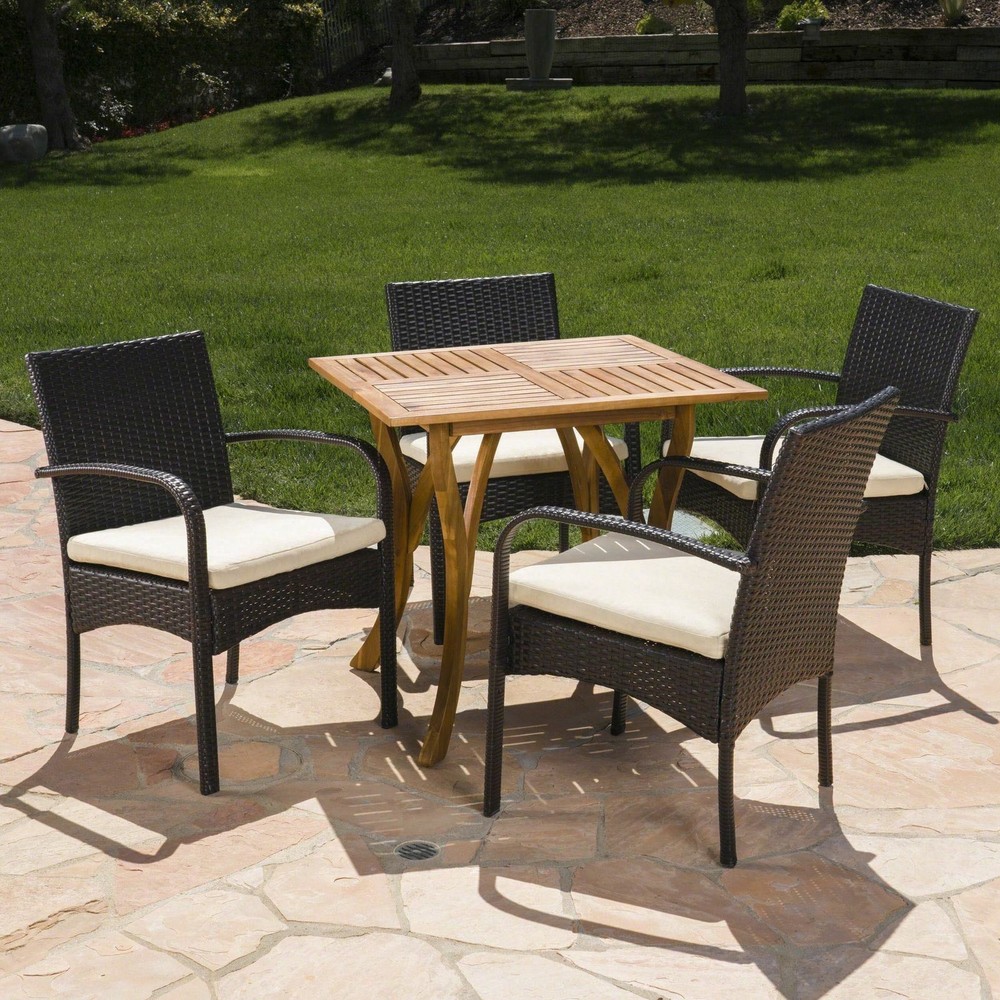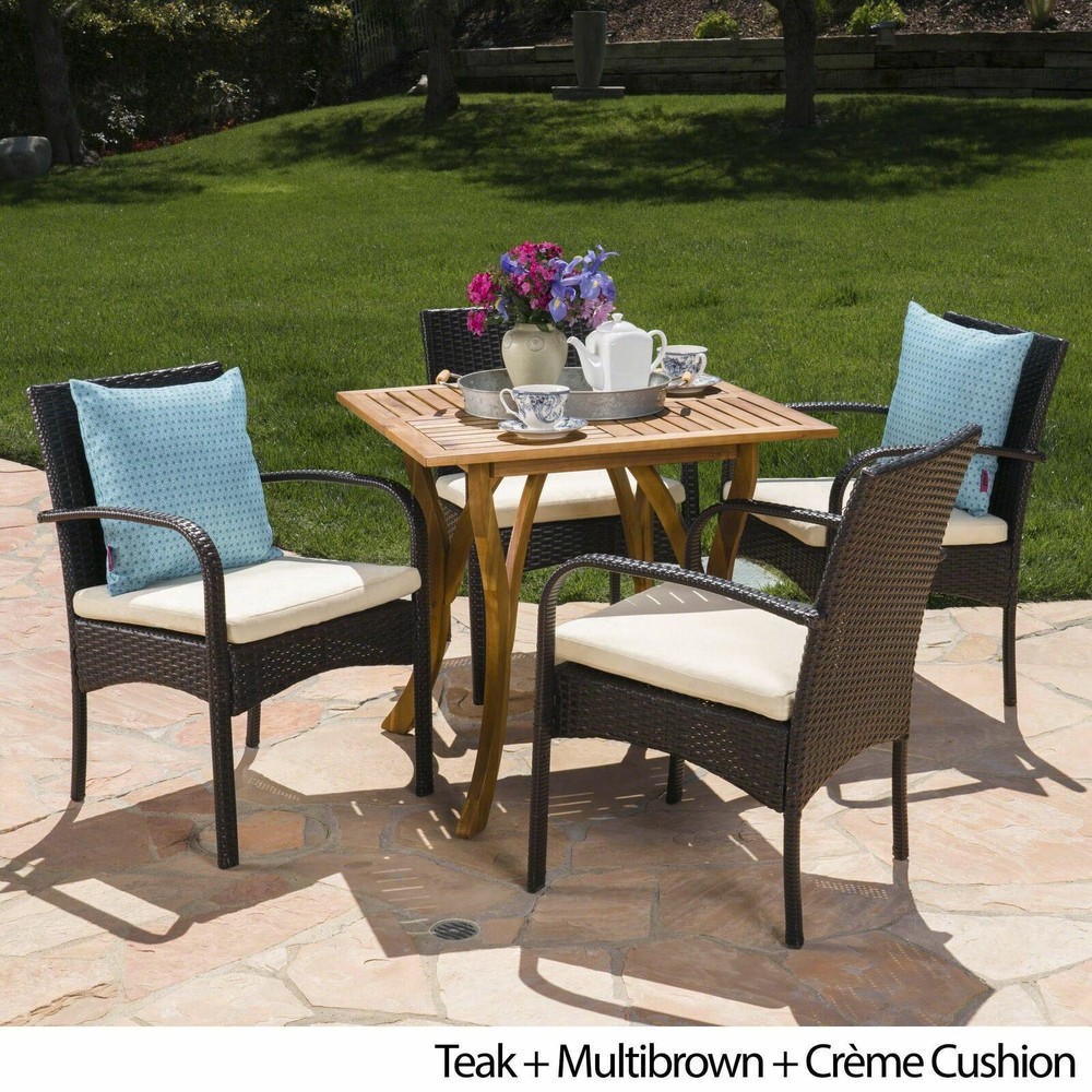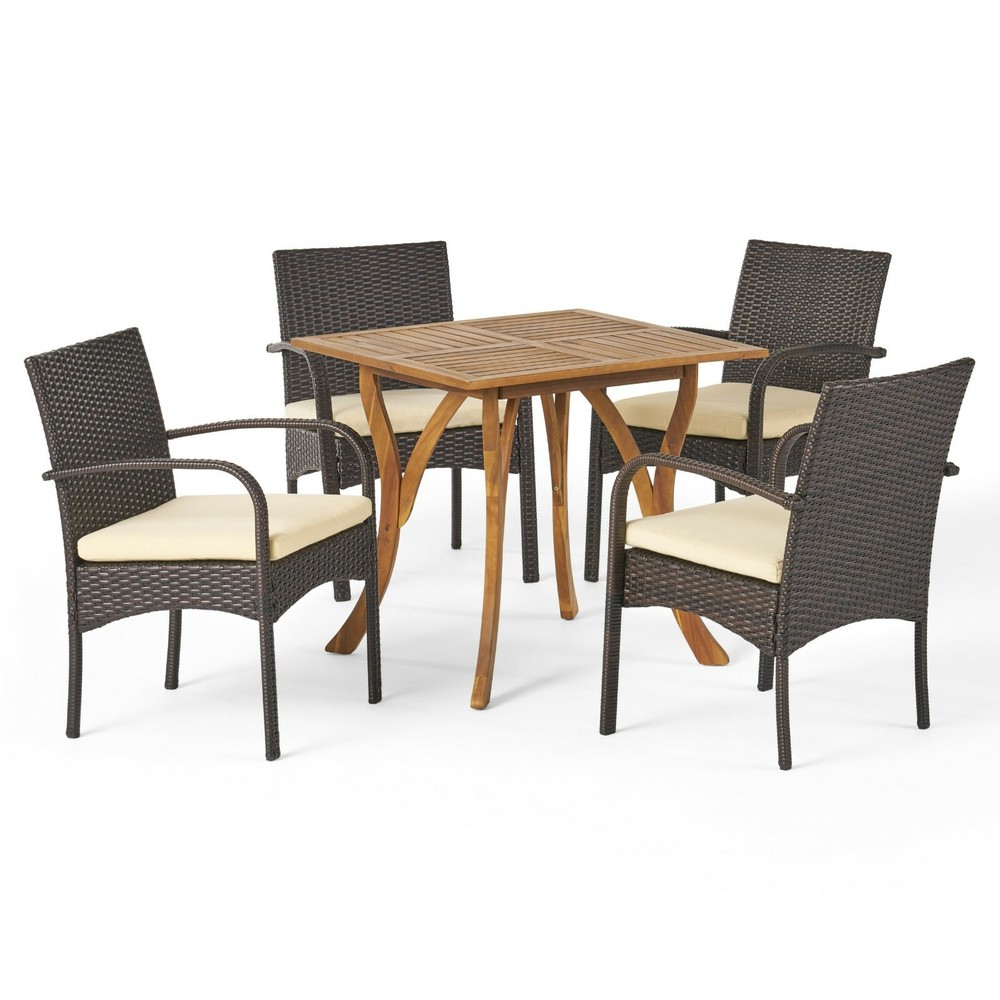 The beautiful blend of wood and wicker comes to life with this dining set. Complete with four wicker dining chairs and one wooden table, you can enjoy eating in your backyard whenever you want. The wooden table is treated to withstand even the harshest of seasons, ensuring your set looks great all year long. This set also comes with the added benefit of cushions for your seats, giving you the perfect color contrast, as well as the comfort that everyone wants when sitting outside for extended periods of time. The square table ensures that there is enough space for both food and people, meaning no one leaves the table hungry. Features: Includes: One (1) Table and Four (4) Chairs Table Material: Acacia Wood Chair Material: Polyethylene Wicker Chair Frame Material: Iron Cushion Material: Water Resistant Fabric Composition: 100% Polyester Wood Finish: Teak Wicker Finish: Multibrown Cushion Color: Crème Assembly Required Hand Crafted Details Table Dimensions: 31.50 inches deep x 31.50 inches wide x 30.00 inches high Chair Dimensions: 23.50 inches deep x 22.10 inches wide x 32.75 inches high Seat Width: 18.25 inches Seat Depth: 18.25 inches Seat Height: 16.50 inches Arm Height: 24.60 inches Dimensions: 31.5"L x 31.5"W x 30"H