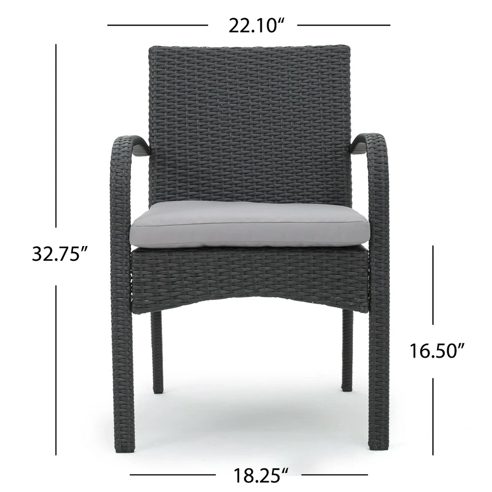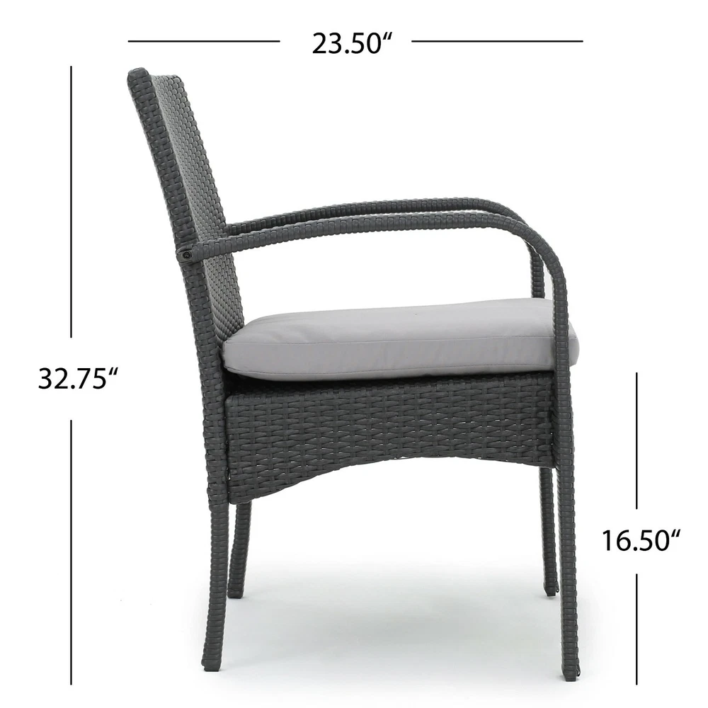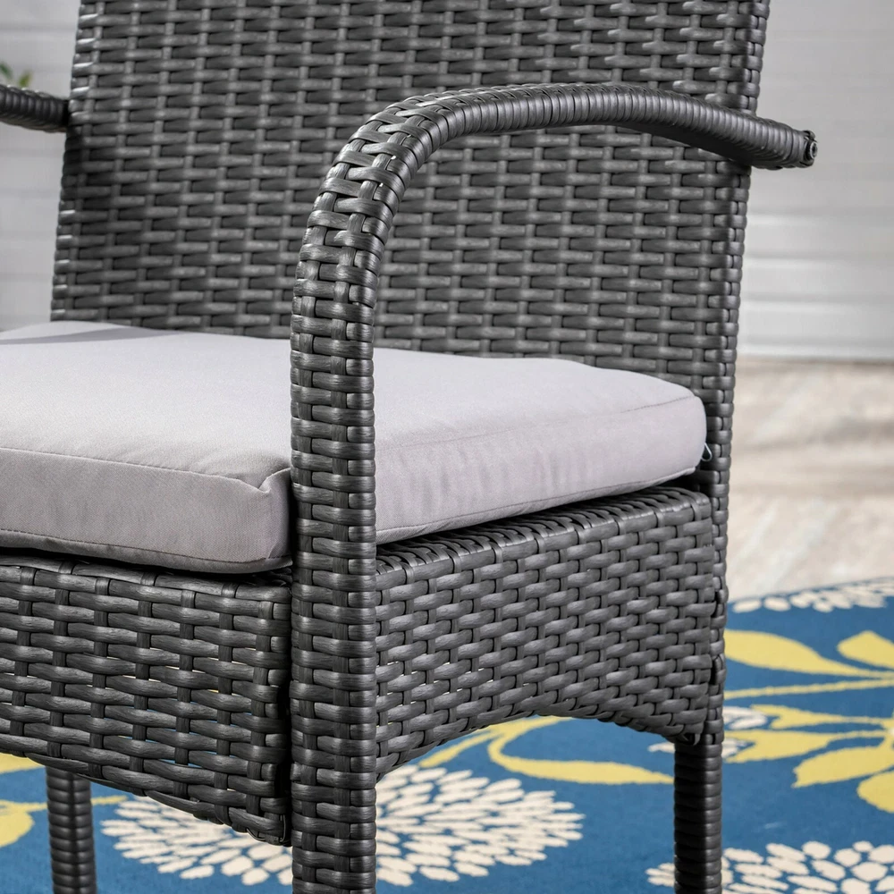 The beautiful blend of wood and wicker comes to life with this dining set. Complete with four wicker dining chairs and one wooden table, you can enjoy eating in your backyard whenever you want. The wooden table is treated to withstand even the harshest of seasons, ensuring your set looks great all year long. This set also comes with the added benefit of cushions for your seats, giving you the perfect color contrast, as well as the comfort that everyone wants when sitting outside for extended periods of time. The square table ensures that there is enough space for both food and people, meaning no one leaves the table hungry. Includes: One (1) Table and Four (4) Chairs Table Material: Acacia Wood Chair Material: Polyethylene Wicker Chair Frame Material: Iron Chair Cushion Material: Water Resistant Fabric Composition: 100% Polyester Table Finish: Gray Wicker Finish: Gray Cushion Color: Gray Some Assembly Required Hand Crafted Details Table Dimensions: 31.50 inches deep x 31.50 inches wide x 30.00 inches high Chair Dimensions: 23.50 inches deep x 22.10 inches wide x 32.75 inches high Seat Dimensions: 18.25 inches deep x 18.25 inches wide x 16.50 inches high Arm Height: 24.60 inches