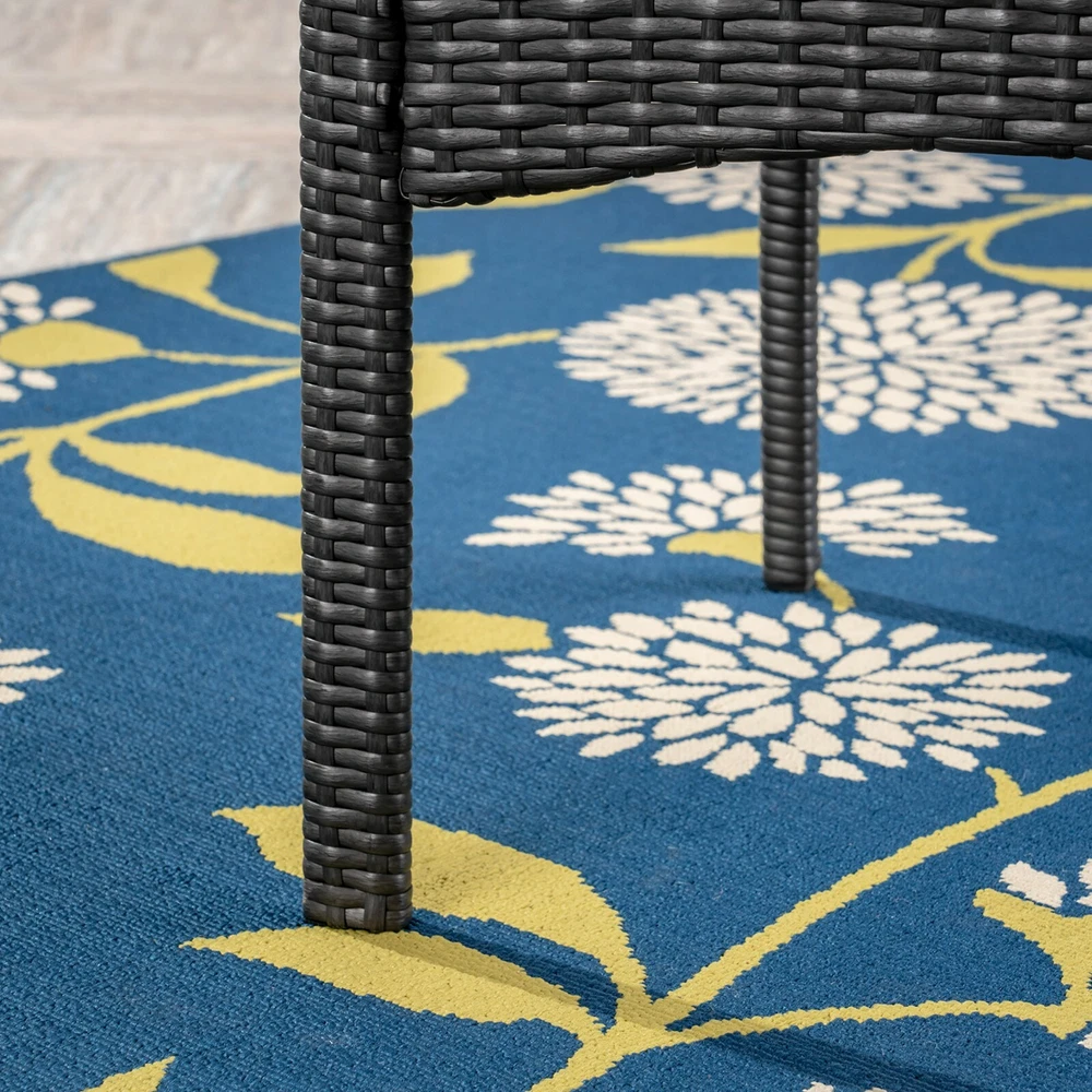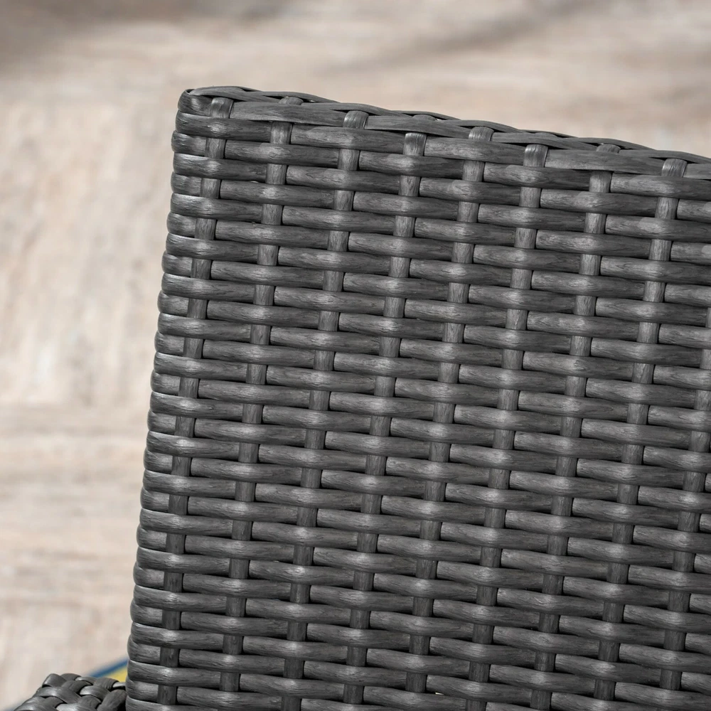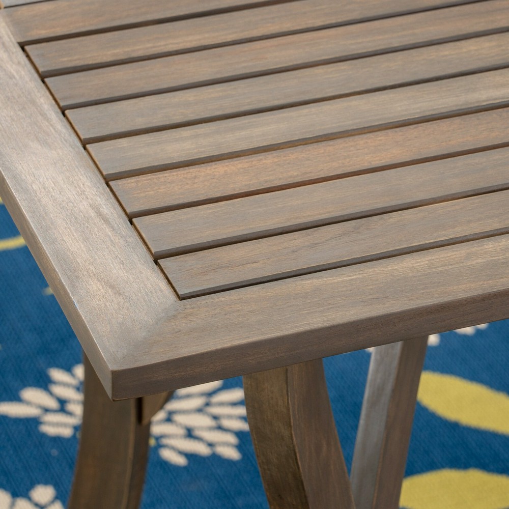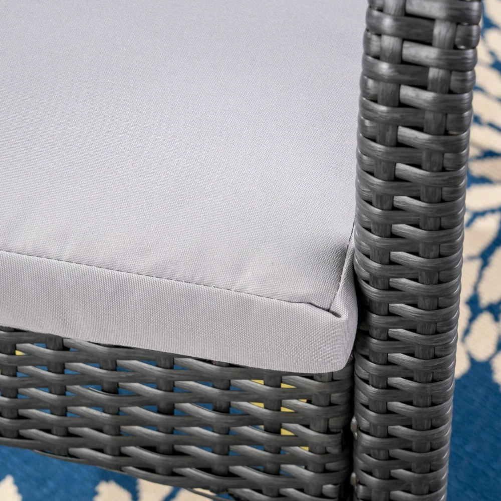 The beautiful blend of wood and wicker comes to life with this dining set. Complete with four wicker dining chairs and one wooden table, you can enjoy eating in your backyard whenever you want. The wooden table is treated to withstand even the harshest of seasons, ensuring your set looks great all year long. This set also comes with the added benefit of cushions for your seats, giving you the perfect color contrast, as well as the comfort that everyone wants when sitting outside for extended periods of time. The square table ensures that there is enough space for both food and people, meaning no one leaves the table hungry. Includes: One (1) Table and Four (4) Chairs Table Material: Acacia Wood Chair Material: Polyethylene Wicker Chair Frame Material: Iron Chair Cushion Material: Water Resistant Fabric Composition: 100% Polyester Table Finish: Gray Wicker Finish: Gray Cushion Color: Gray Some Assembly Required Hand Crafted Details Table Dimensions: 31.50 inches deep x 31.50 inches wide x 30.00 inches high Chair Dimensions: 23.50 inches deep x 22.10 inches wide x 32.75 inches high Seat Dimensions: 18.25 inches deep x 18.25 inches wide x 16.50 inches high Arm Height: 24.60 inches