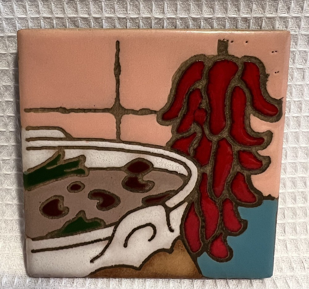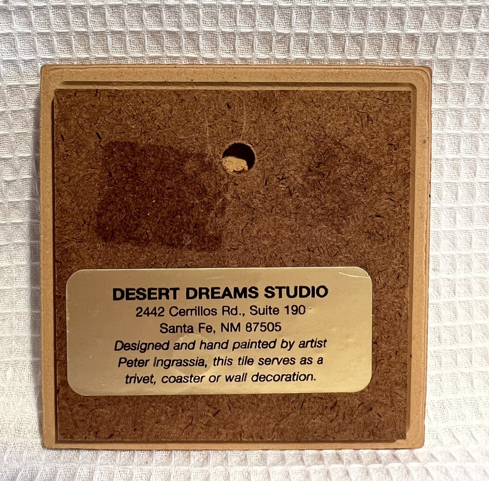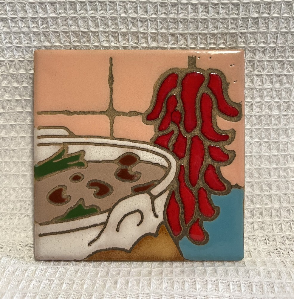 Desert Dreams Studio-Santa Fe,N.M.-Peter Ingrassia-Hot Peppers Wall Tile/Plaque. VERY GOOD CONDITION No chips, cracks, or scratches. Has some adhesive on the back from stickers. Size: 4 in. X 4 in. **It is a good idea to check the lead, cadmium etc. content, of all dishes, pottery, glassware, metalware, wood, etc. especially vintage ones! Many dishes even newer ones and pottery have unacceptable lead content and and are not safe especially for children and pregnant women! Painted dishes are more prone to have lead. Please check about this or use for collector purposes only.