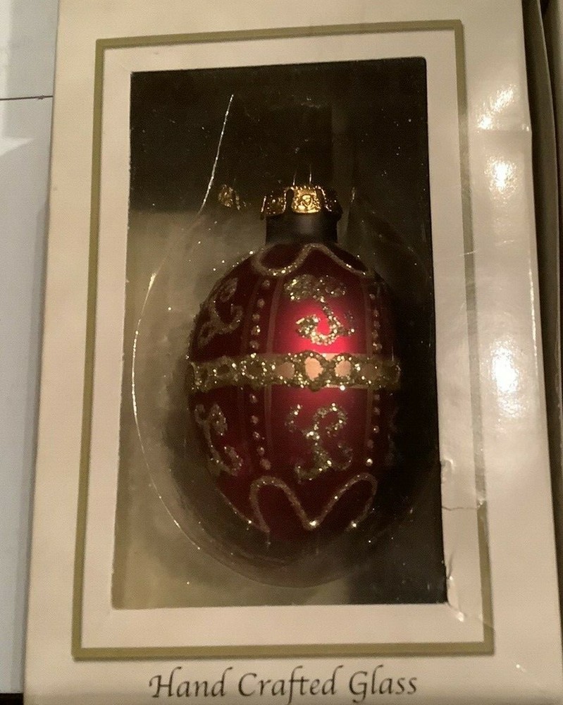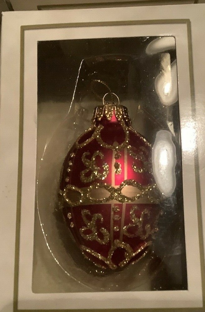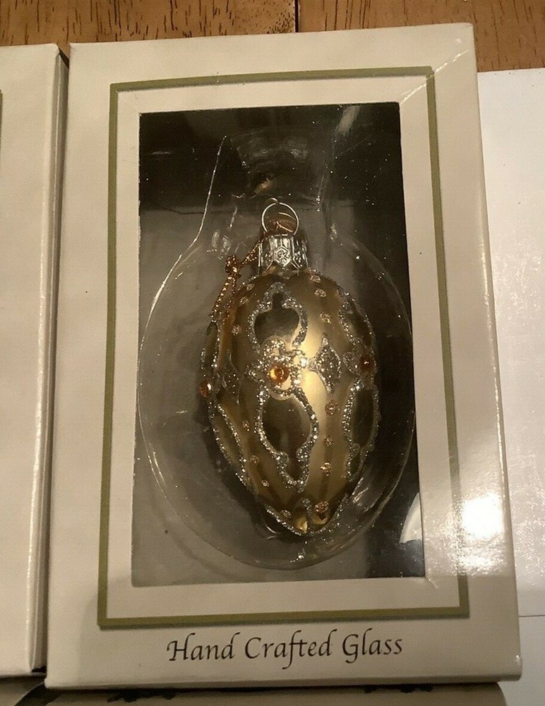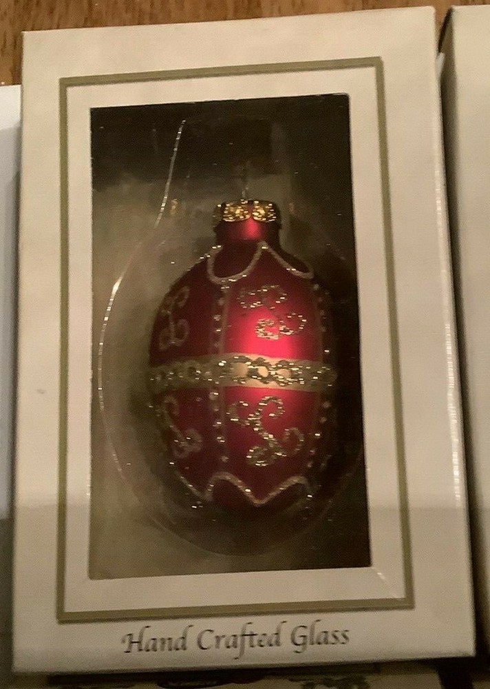 4 egg shaped hand crafted glass - 3 red and 1 gold - all with glitter - new old stock
