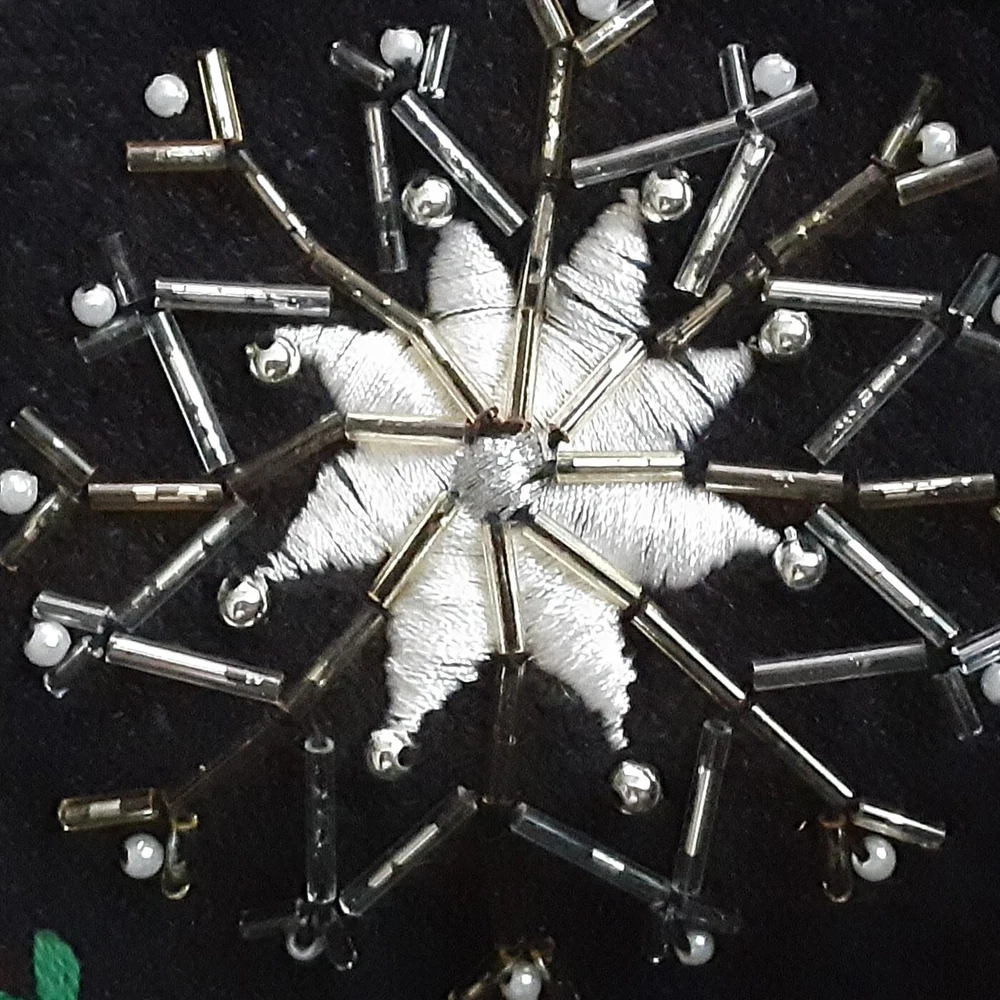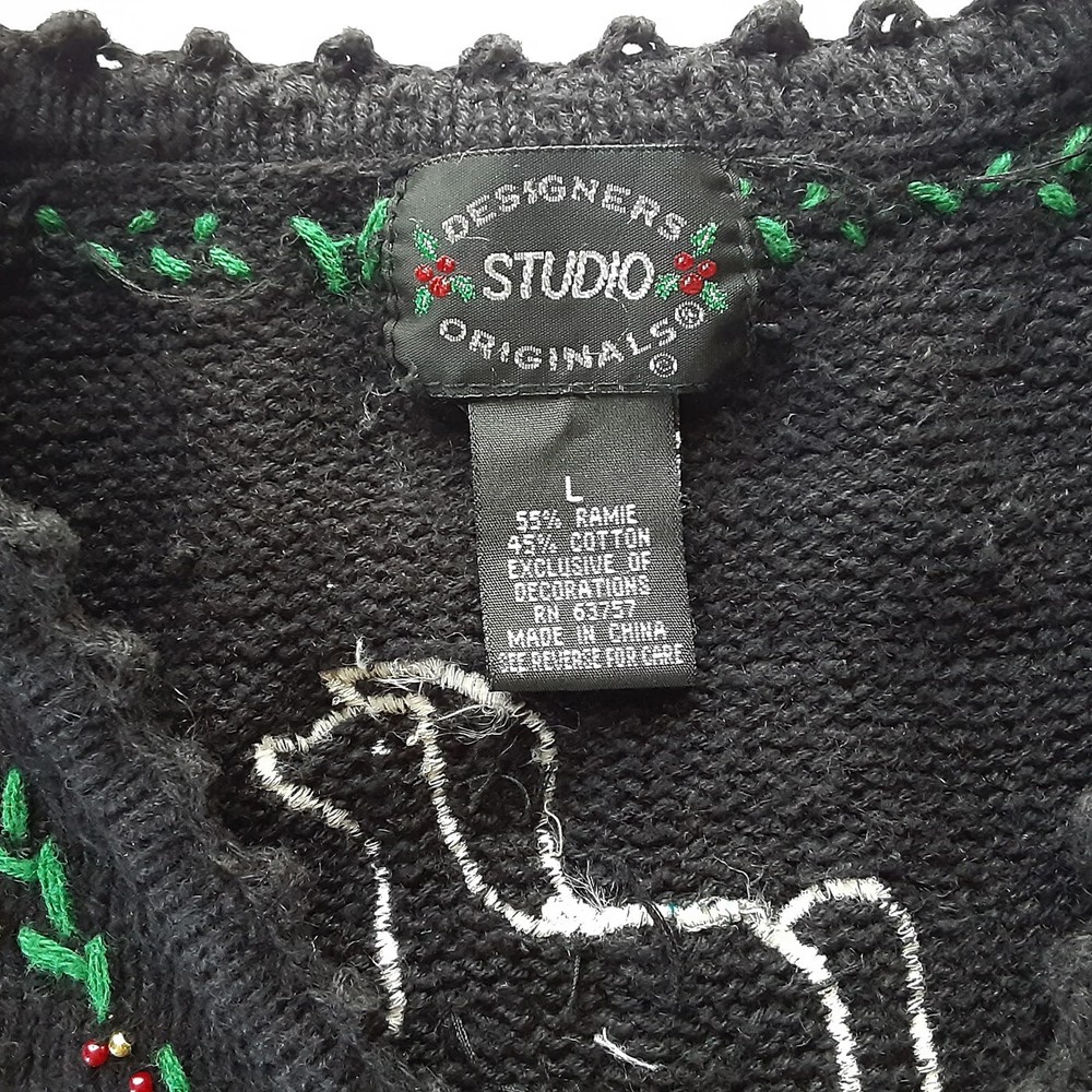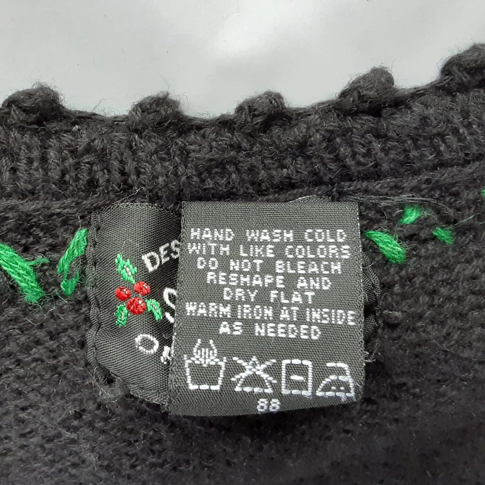 Very lovely black knit with silver beading and snowflakes, snowman, rocking horses, crocheted scalloped edges, crocheted buttons, marquise shaped rhinestones and red & green embroider, v-neck cardigan by Designers Studio Originals. Please note: I offer many pre-owned high-end/designer garments and every piece is inspected for any issues. These garments are "Pre-owned" and previously worn and will show typical signs of previous use and wear. Each item is measured and these measurements are listed below. In clothing, sizes can vary by brand and style. Washing and drying, even dry-cleaning can cause shrinkage and effect the sizing of garments. The "tagged" size is not always the same as the "measured" size. Please compare your measurements against a similar garment you own at your location to ensure this items' fit is suitable for you. The measurements are for you so you can buy with confidence. I list both so you can determine if it is a proper fit. Please contact me if you want me to re-measure the garment before you purchase. The garment measurements laying flat are: Length: 21.5 inches Width across chest laying flat (underarm to underarm): 22.5 inches Sleeve: 23.5 inches If you have any questions or would like additional pictures please ask. Please note that shipping is based on the weight & size of the package and the destination and will require extra packaging materials to keep it safe during transit which also adds to the weight. This is a heavy sweater. If ever you receive anything from me with which you have a legitimate issue, please contact me ASAP and I will work with you to resolve it. All items come from a smoke free and odor free environment. Thanks for looking!