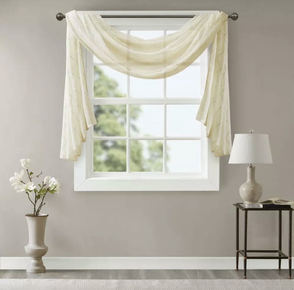 Diamond sheer embroidered wibdow scarf. Measure 50”x144”. Light wibdow scarf with diamond embroidered pattern. Color light yellow almost cream.condition is new / other/ open box. Free shipping....