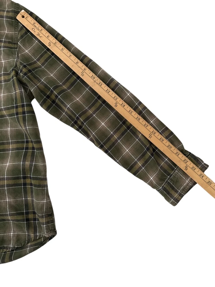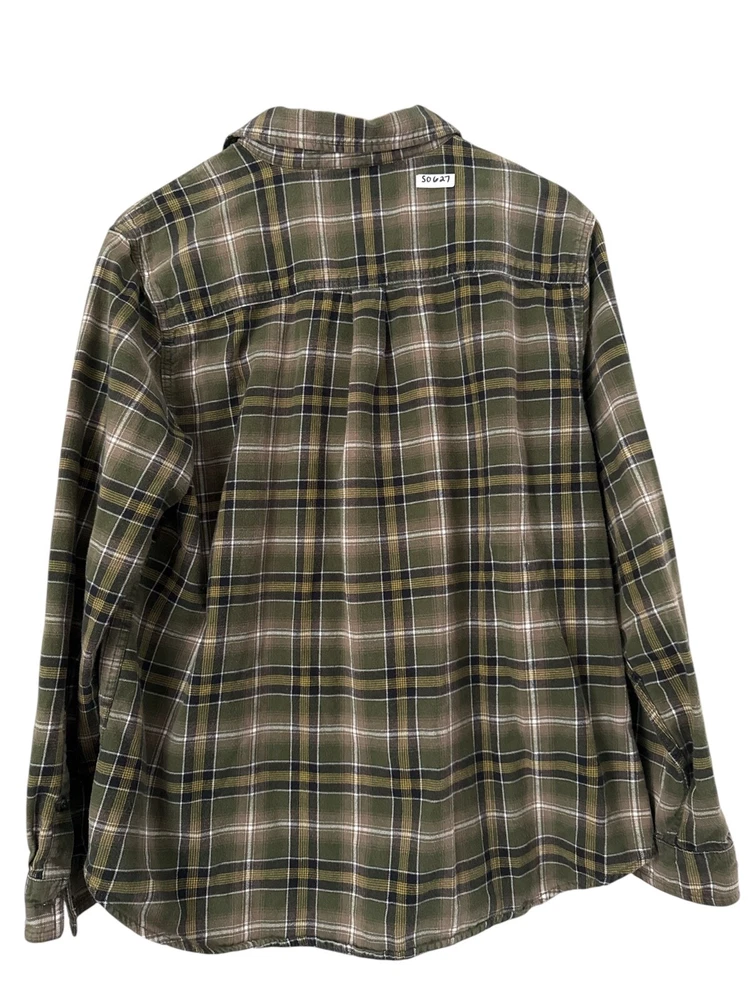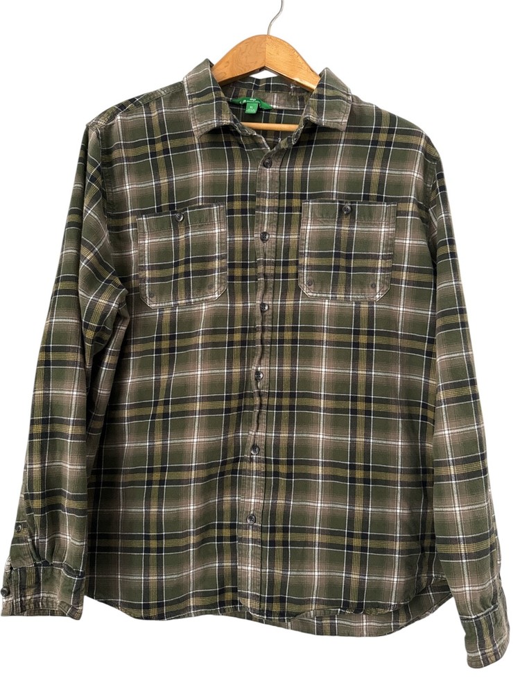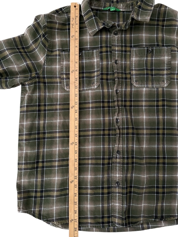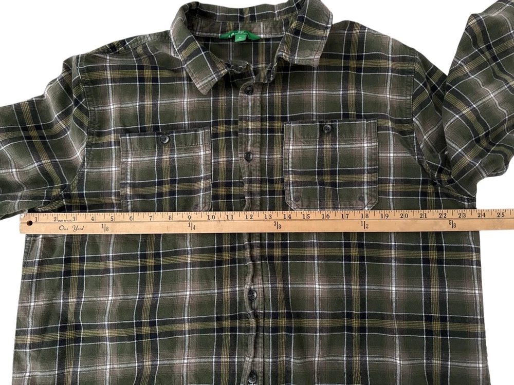 This Dip button-down shirt features a green plaid pattern, long sleeves, and a collared neckline with a button-down closure. It is made of 100% organic cotton and is machine washable. The shirt has a regular fit and is available in size XL, with a chest size of 48 inches. The shirt is perfect for travel, casual wear, work, or business attire. It also features pockets and button accents. The shirt is suitable for all seasons, including winter, summer, fall, and spring, and is made in Bangladesh.