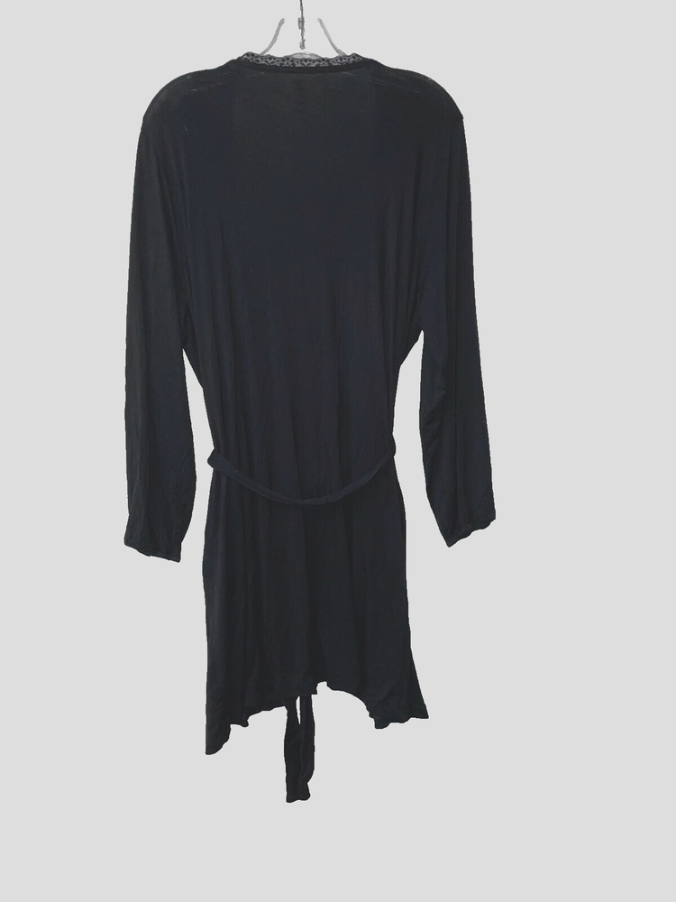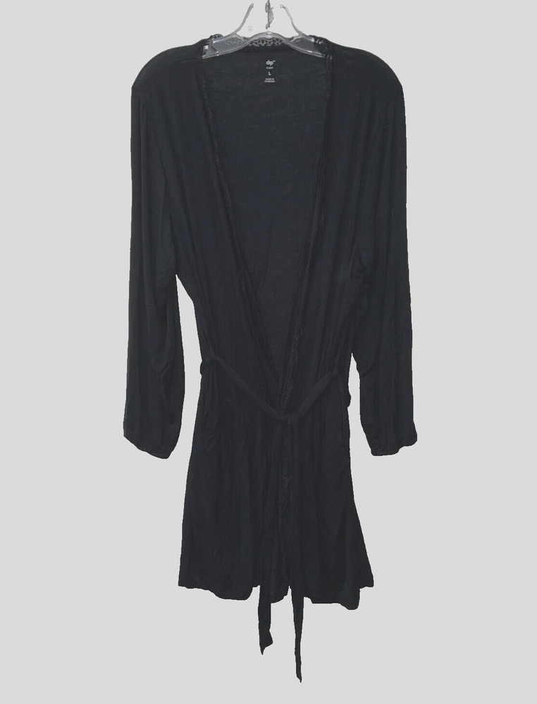 BLACK ROBE, BELTED, LACE DETAIL, SIZE LARGE, GREAT SHAPE MEASURES 21 INCHES ARMP PIT TO ARM PIT AND IS 36 INCHES FROM TOP TO BOTTOM I DO COMBINE SHIPPING AND WHEN YOU ARE PURCHASING MULTIPLE ITEMS LET ME KNOW WHEN DONE AND DONT PAY AND I WILL THEN A NEW INVOICE EMAIL ME FIRST IF YOU ARE NOT SATISFIED FOR SOME REASON BEFORE OPENING A CASE, LEAVING NEUTRAL OR NEGATIVE FEED BACK SO I MAY TRY AND RESOLVE ANY ISSUE INCLUDING ANY DELAYS ETC FROM THE POST OFFICE