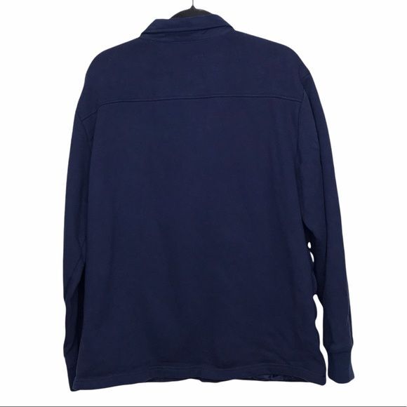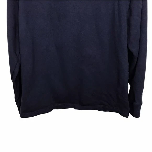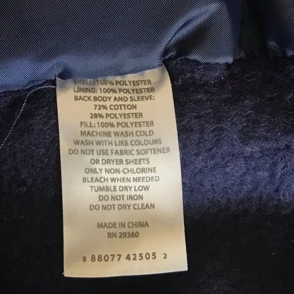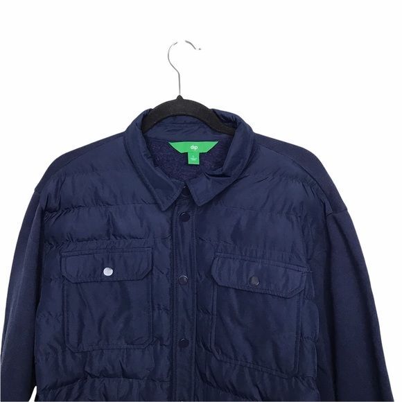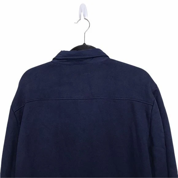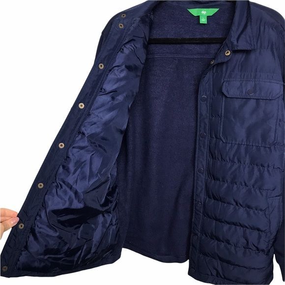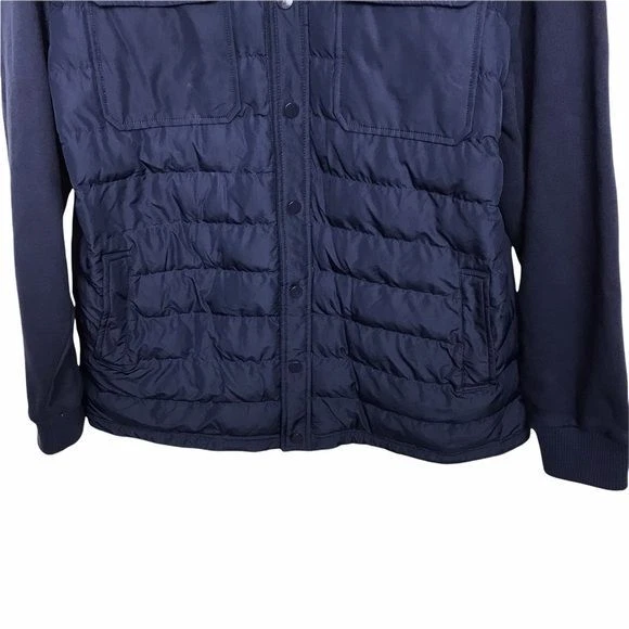 Blue, mixed media, quilted jacket. Has snap button front closure. Quilting is only on front. Preowned with minor fading on back but otherwise in good shape. Approximate Measurements: 22 inches from underarm to underarm 27 inches in length Fall Autumn Winter Casual