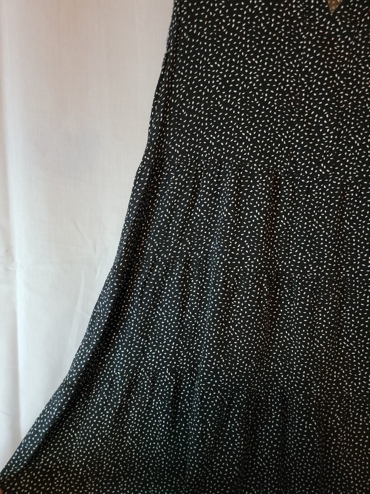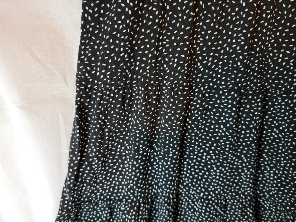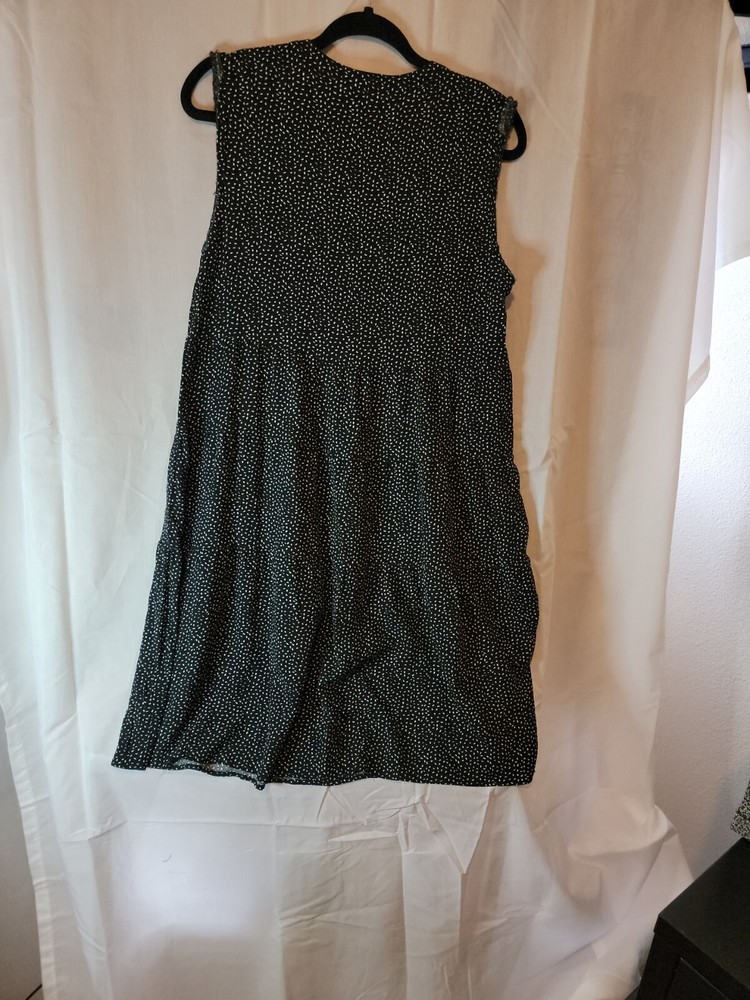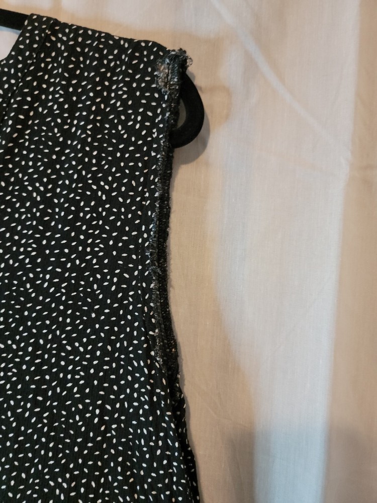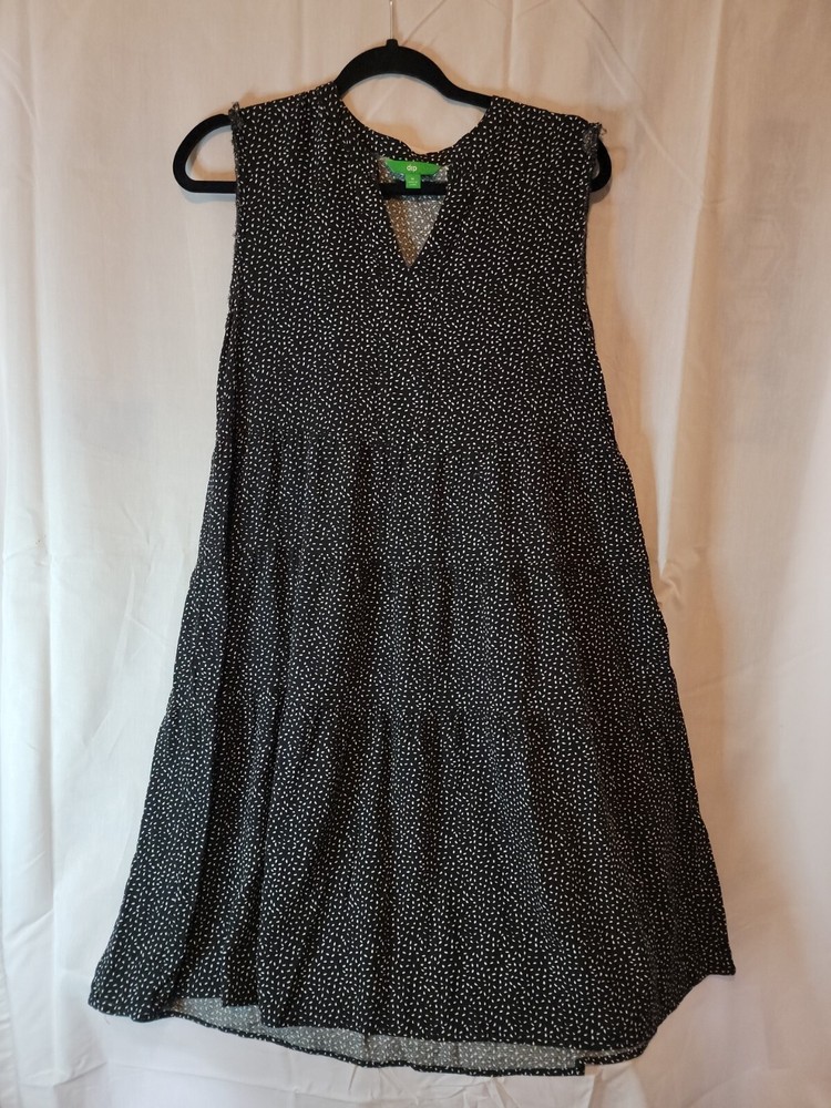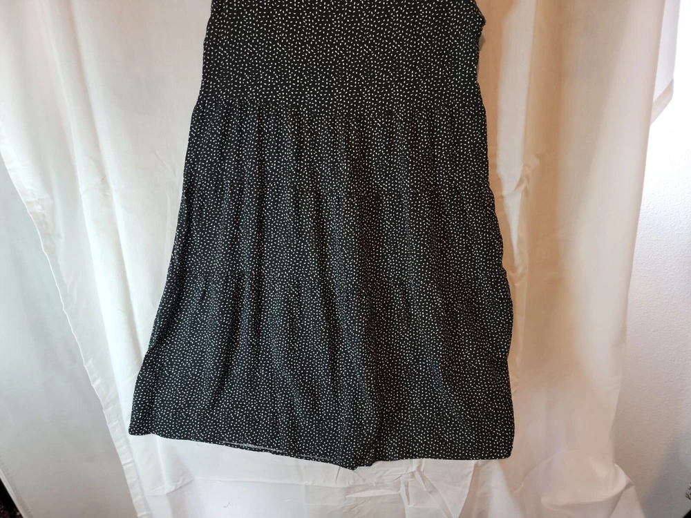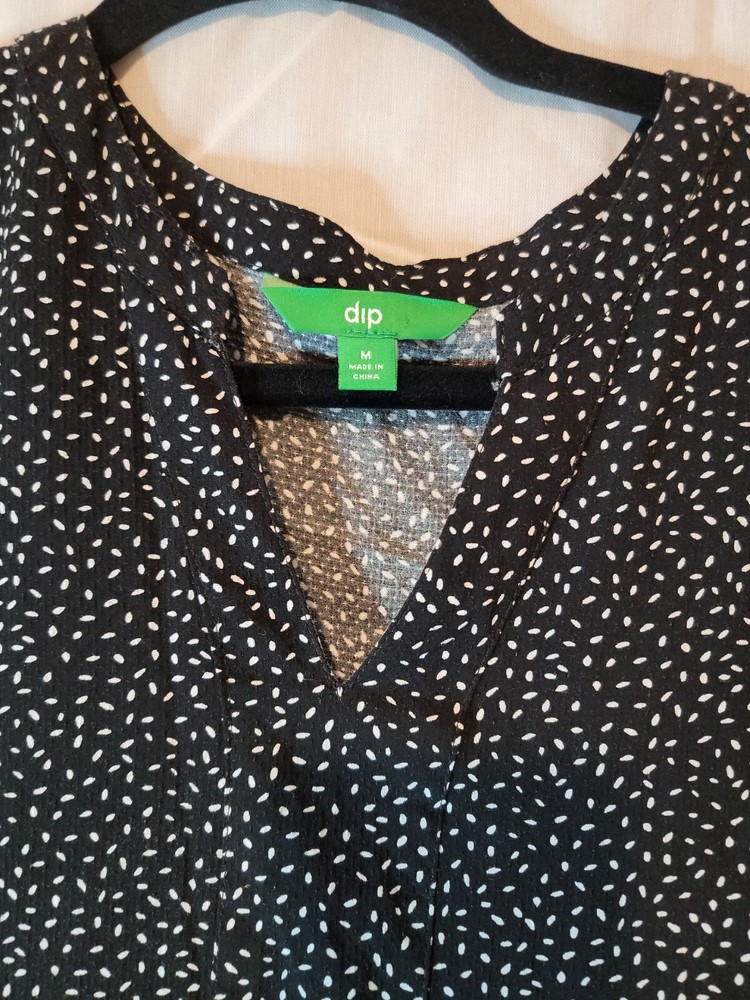 This Dip brand dress is a stunning addition to any wardrobe. The black and white polka dot/hash mark pattern with a distressed effect sleeve enclosure is eye-catching and unique. The sleeveless V-neck cut is flattering and versatile, making it perfect for any occasion from casual to travel, wedding, or party/cocktail. The pullover closure makes it easy to slip on and off, while the lightweight and oversized features make it comfortable to wear in the summer. Made with high-quality rayon material, this knee-length maxi dress is available in size M and comes in a beautiful pink color with a flower theme. The dress is not vintage and is designed as a regular size for women. The dress is perfect for a summer outing or a night out with friends.