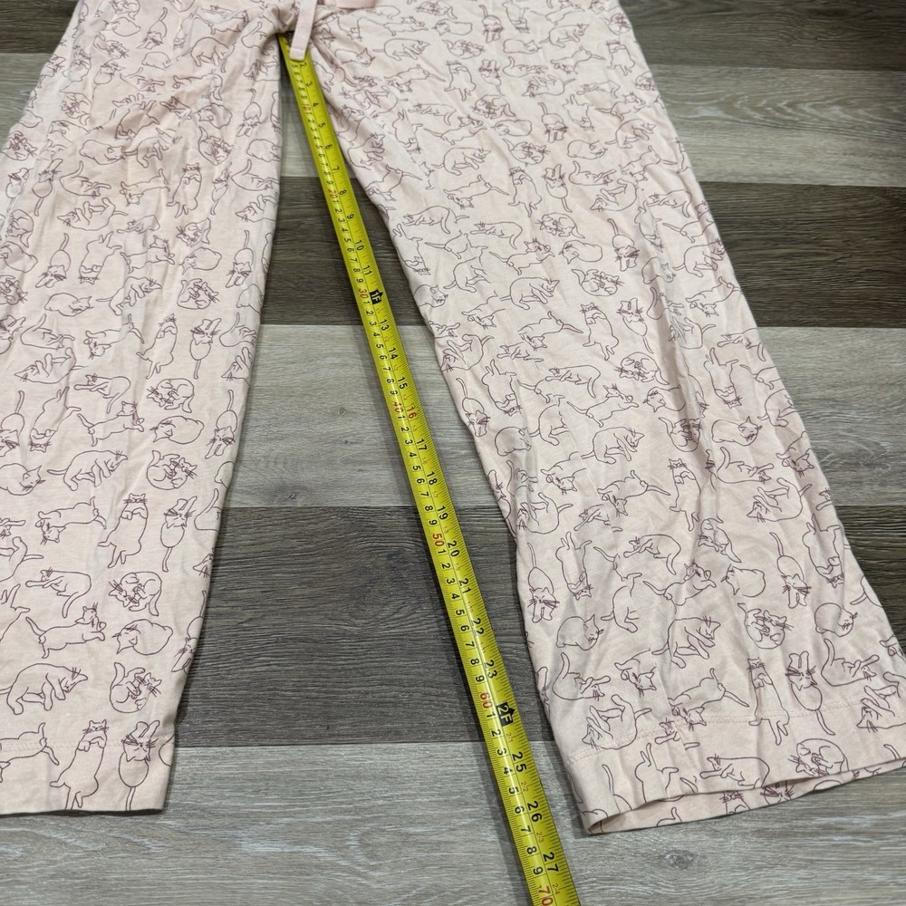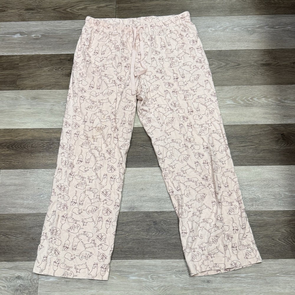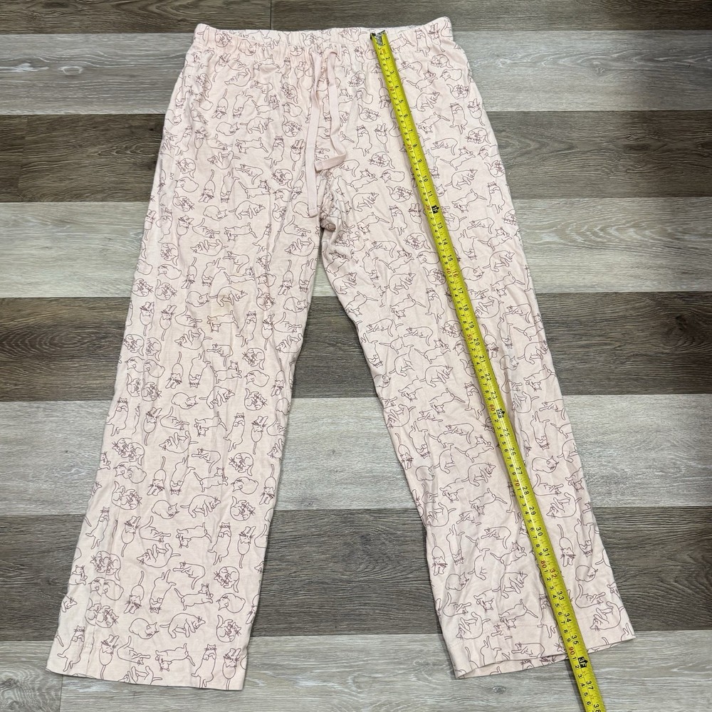 These Dip Brand Pajama Pants for women in size Large feature a light pink color with animal print cats, making them perfect for those who love cats and want a cute and cozy sleepwear option. Made from 100% cotton, these pajama pants have an elastic waist with a drawstring closure for a comfortable fit. The lightweight material makes them suitable for all seasons, and they are machine washable for easy care. With a regular size type and a cute cat theme, these pajama pants are both stylish and comfortable for a good night's sleep. No stains or holes, these pajama bottoms have been preloved with several washings.