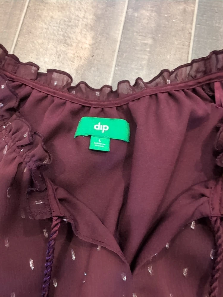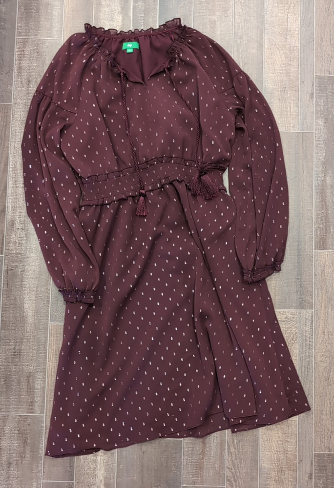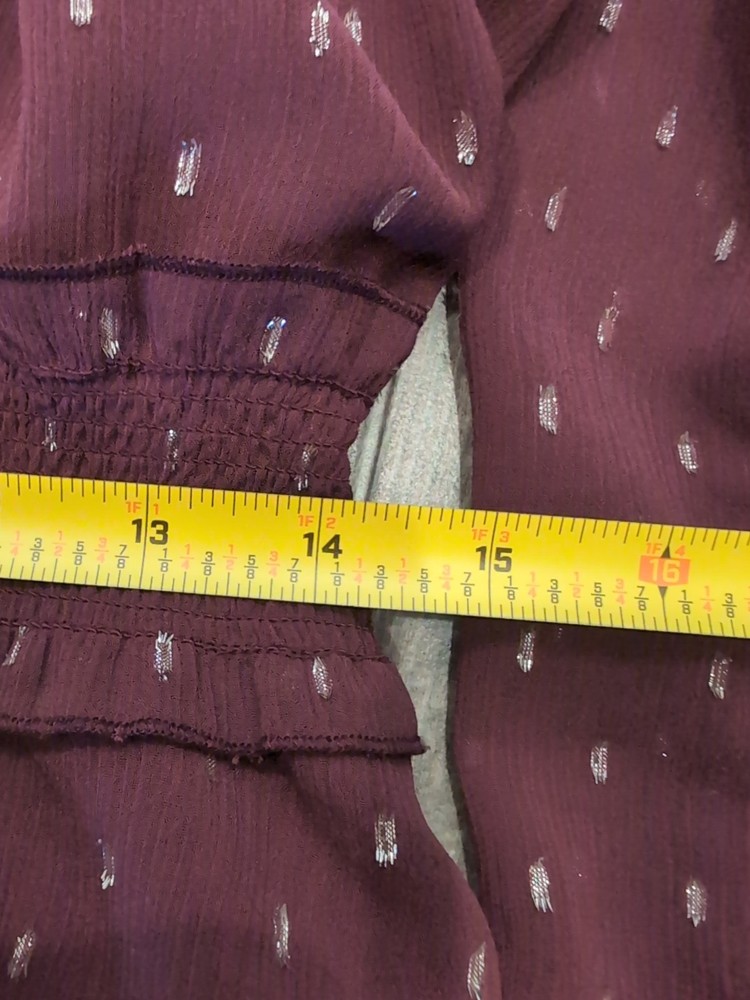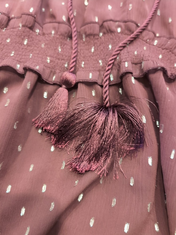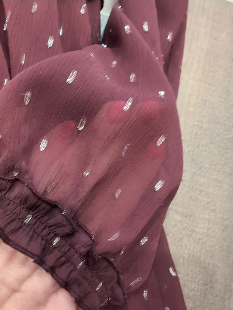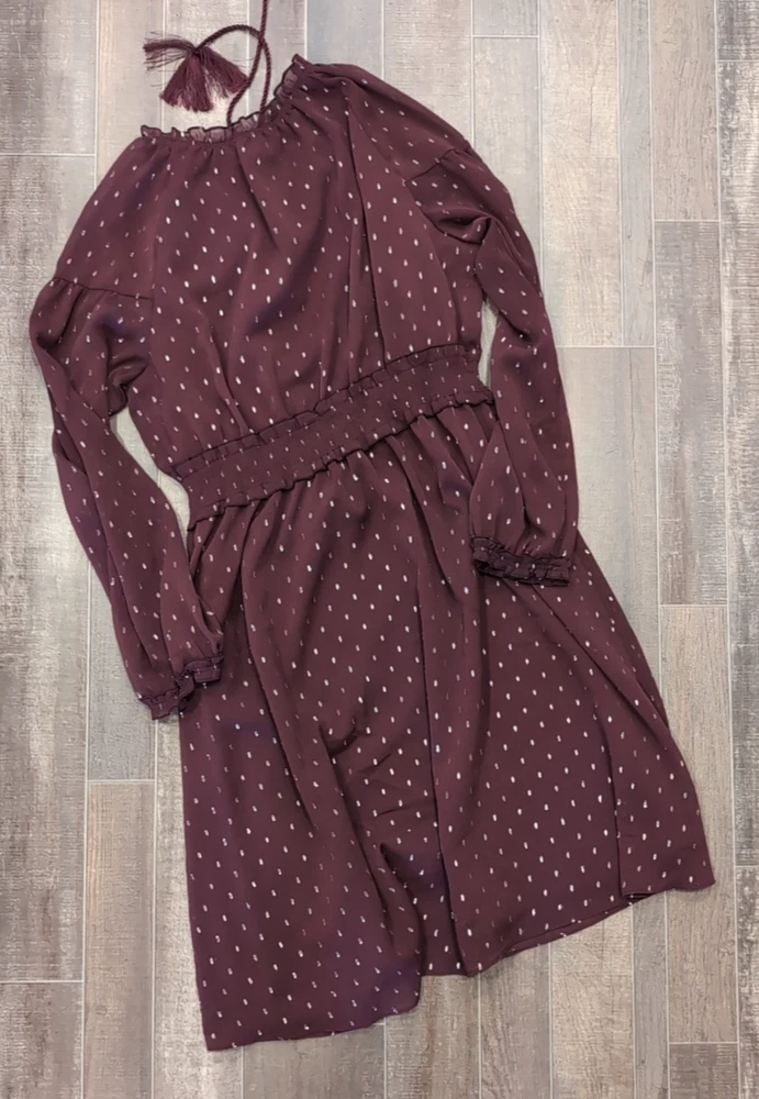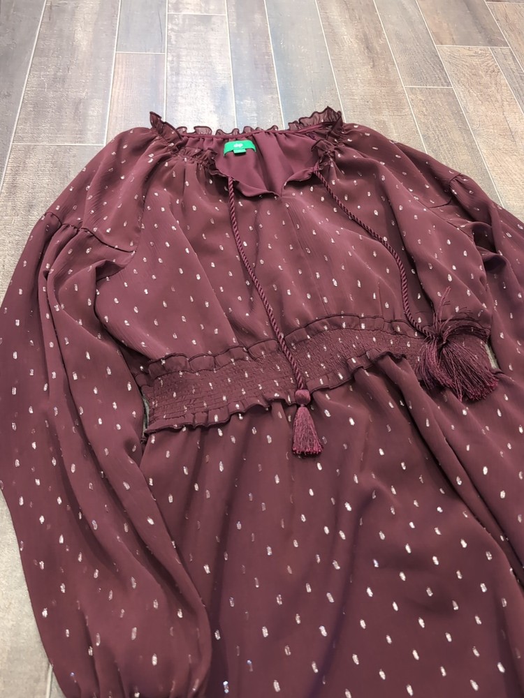 Maroon / burgundy dress with gold accents; long, sheer sleeves. **Note** one of the tassels on the front is missing the string that holds its shape — see picture! Don’t forget to combine your order at checkout prior to paying when purchasing multiple items 😊 . . I want to sell you the best, most high-quality items that I can find. All items have been inspected by me, personally. Anything without a tag has been washed and dried! I’ve tried to catch all wear and tear, blemishes, rips, threading issues etc. but sometimes things get missed. If I do find something, I make sure to point it out and photograph it. If you catch something, and you’re unsatisfied, please let me know. Thank you for choosing sustainable, small business! Your positive review is appreciated!