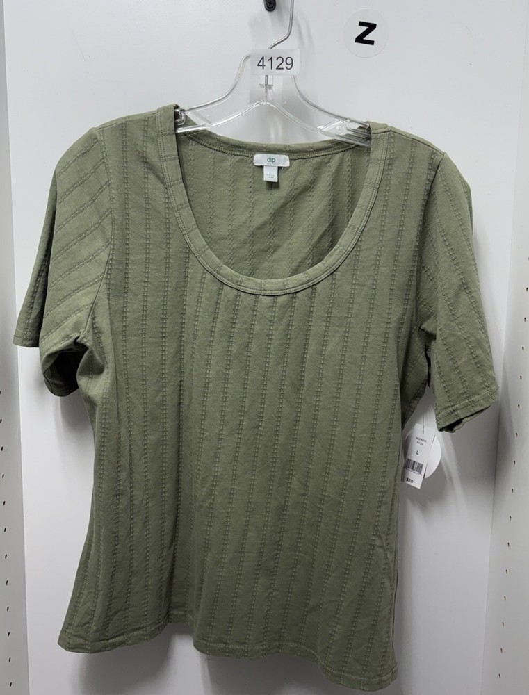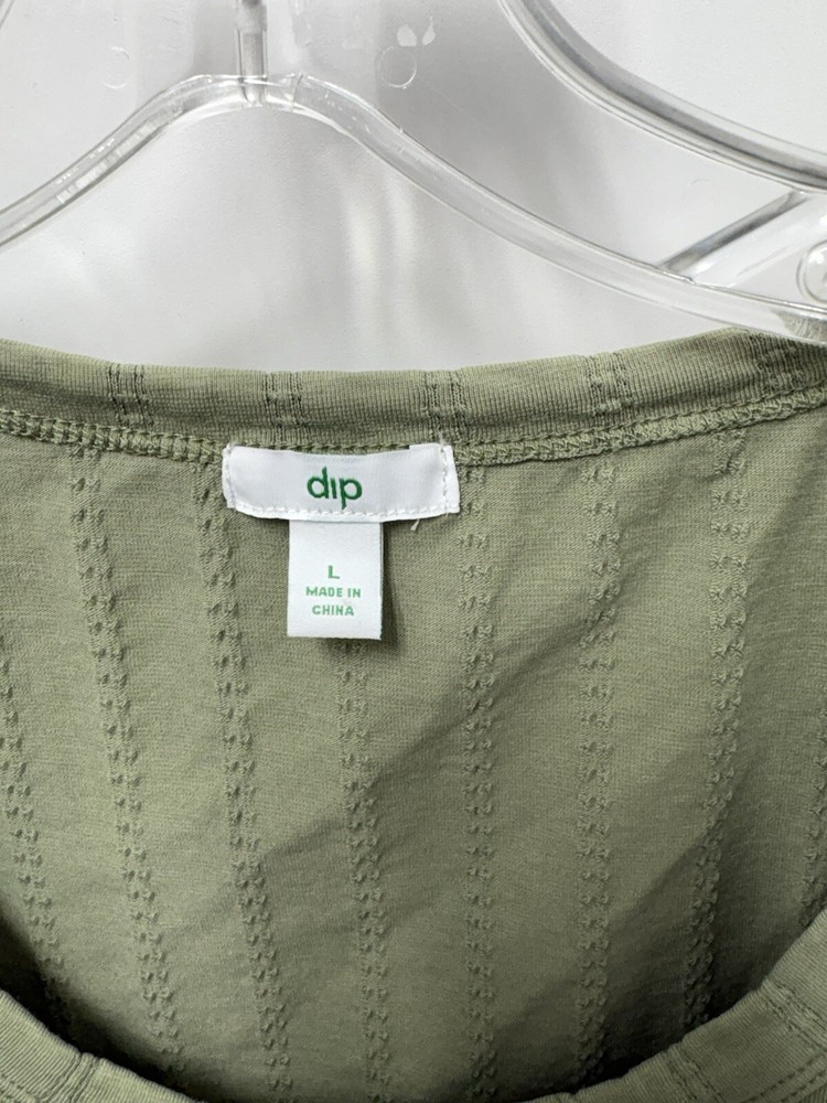 This is a women's green short sleeve T-shirt from the brand Dip in size L. It features a round neckline and is brand new with tags. The T-shirt is designed in a regular size type, making it a versatile and comfortable option for casual wear.