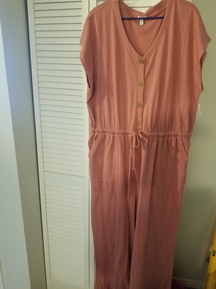 This is a women's jumpsuit in size 2XL by the brand Dip, featuring a solid coral color and a square neckline with a tie closure. The sleeveless jumpsuit has a classic fit with wide-leg bottoms, making it suitable for casual and travel occasions. Made of jersey fabric, this one-piece garment is machine washable and designed for all seasons, particularly for summer, fall, and spring. The overall style is described as casual and bohemian, perfect for adding a relaxed and stylish touch to your wardrobe.