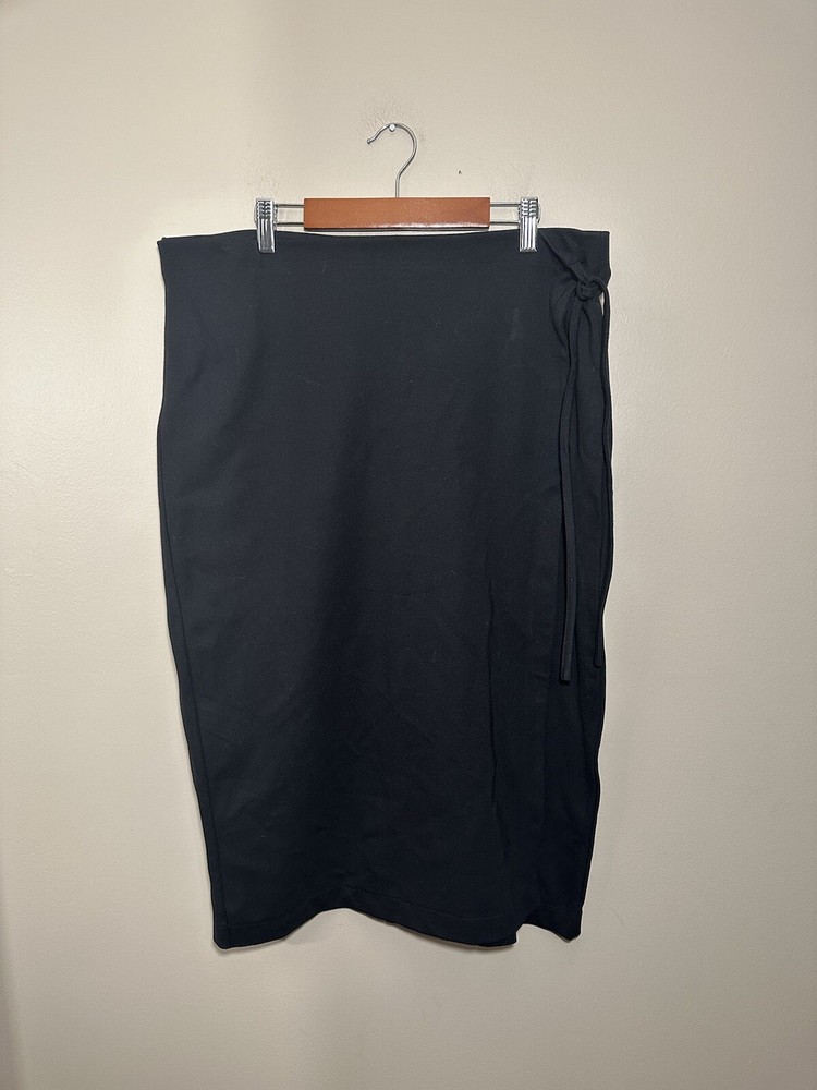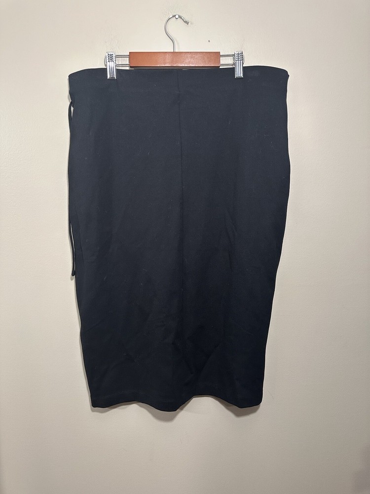 Dip Ponte Knit Faux Wrap Skirt XL Stretch Side Tie Pencil Minimalist Black 35 inch waist 41 inch hips 28.5 inches long Washed per Ebay?s standards....