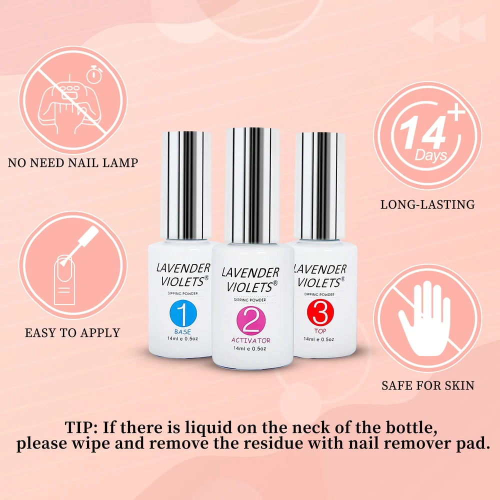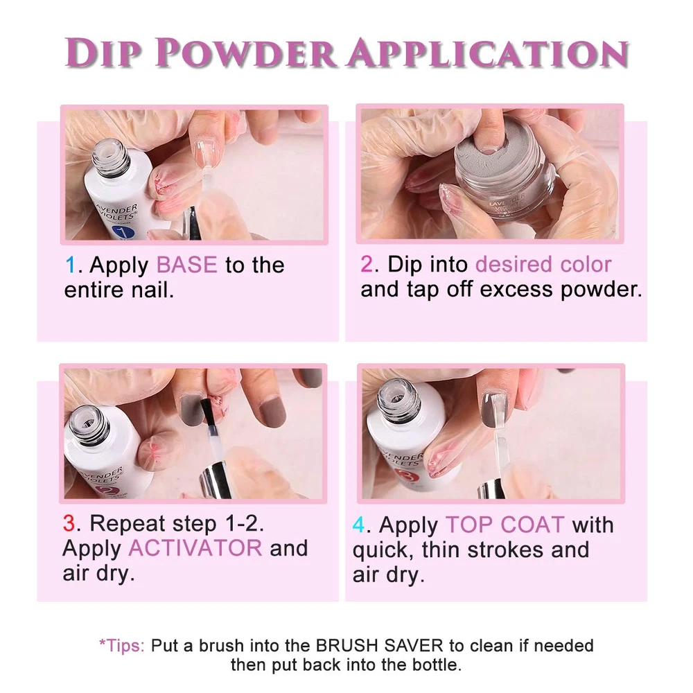 Dip Powder Liquid Set with Activator, Base Top Coat and Brush Saver 0.5oz/Bot Nail File Necessary Tools for Dipping Powder Acrylic Nail Manicure Pedicure J775 Dip Powder Liquid Set Includes: 4 X Base coat, Top coat, Activator, and Brush Saver (14ml / 0.5 fl oz each bottle), 1 X Mini Nail File, 2 X Brushes Replacement and 2 X Bamboo Cuticle Pushers. Perfect for both professional salons and beginners. Easy to Apply: Dip powder gel is easy enough for anyone to apply, and it also takes about 30% less time to apply than acrylics. Just a simple 3-step dipping system to design captivating acrylic nails. Durable: Dip powder gel is resistant to chipping and cracking, breathable with no damage to the nails beds, which is shiny for about 3 weeks even without a led nail lamp curing. High Quality: Made of high quality material, glass bottles are more textured than plastic ones, environmentally friendly and non-toxic. Protect your hands and keep your nails nice. Warm Tips: After apply base and top coat, if there is liquid on the neck of the bottle, please wipe and remove the residue with a cloth wetted by brush saver before closing it or it will stick and difficult for opening again. Product Description Easy Manicure With Dip Powder Add to Cart Add to Cart Add to Cart Add to Cart Add to Cart Add to Cart Add to Cart Customer Reviews 4.4 out of 5 stars 11 4.3 out of 5 stars 7,402 4.3 out of 5 stars 3,023 4.2 out of 5 stars 1,378 4.1 out of 5 stars 1,012 4.4 out of 5 stars 641 4.1 out of 5 stars 1,012 Price $34.99 $ 34 . 99 $9.99 $ 9 . 99 $29.99 $ 29 . 99 $39.99 $ 39 . 99 $9.99 $ 9 . 99 $9.99 $ 9 . 99 $9.99 $ 9 . 99 Color Powder 16 6 36 30 6 6 6 Dip Powder Liquid Set √ √ × √ √ √ × Nail File √ √ × √ √ √ × Brushes Replacement × × × √ √ √ × Nail Brush, √ × × √ √ √ ×