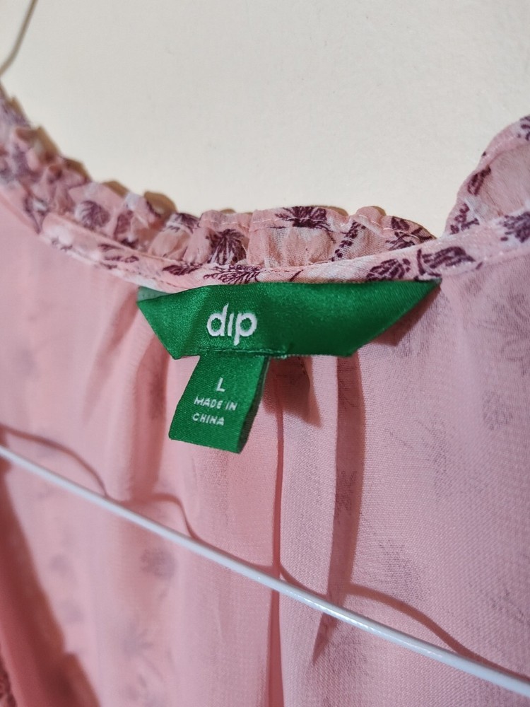 dip Pink Floral Top Size Large Flutter Sleeves New With Tags Measurements: laid flat Armpit to Armpit: 22.5in Nape of Neck to Hem: 27in Sleeve Length: 4in