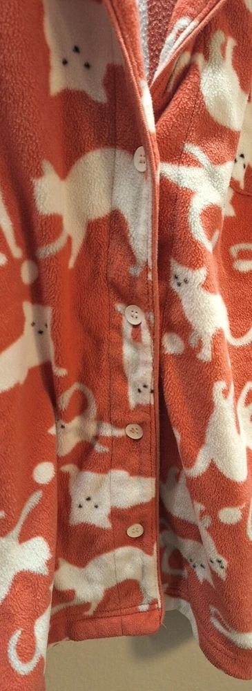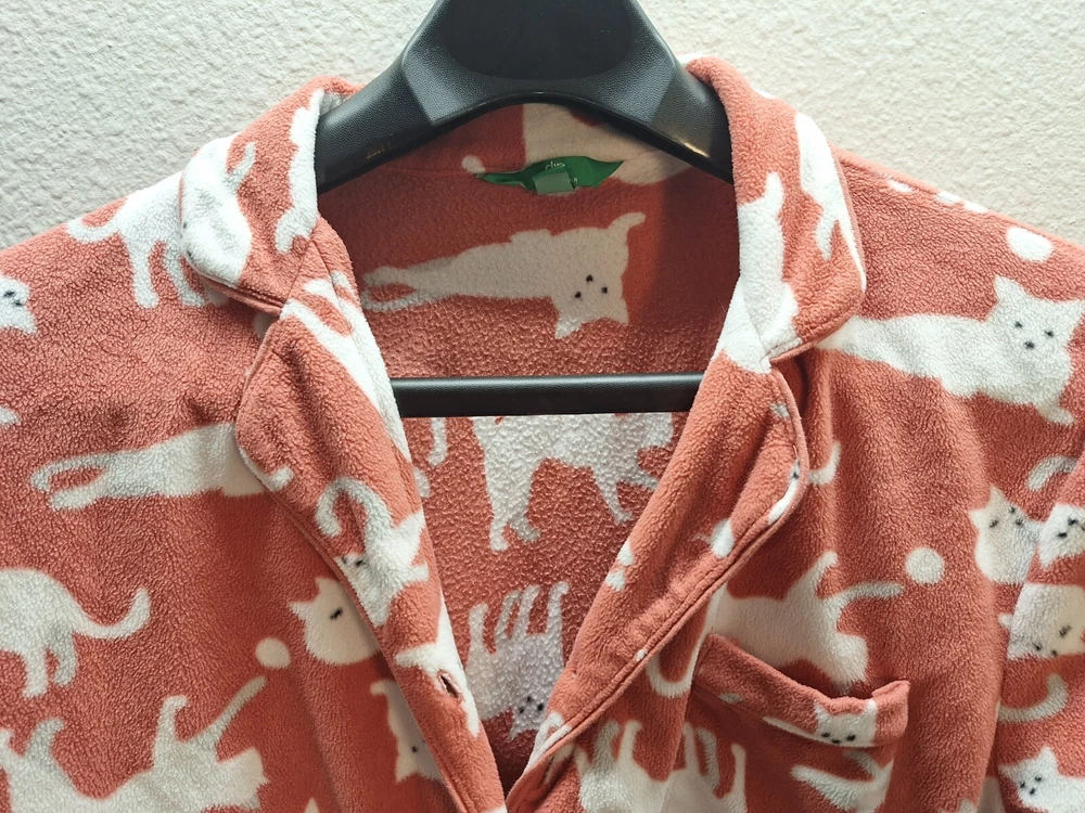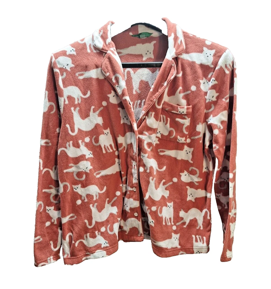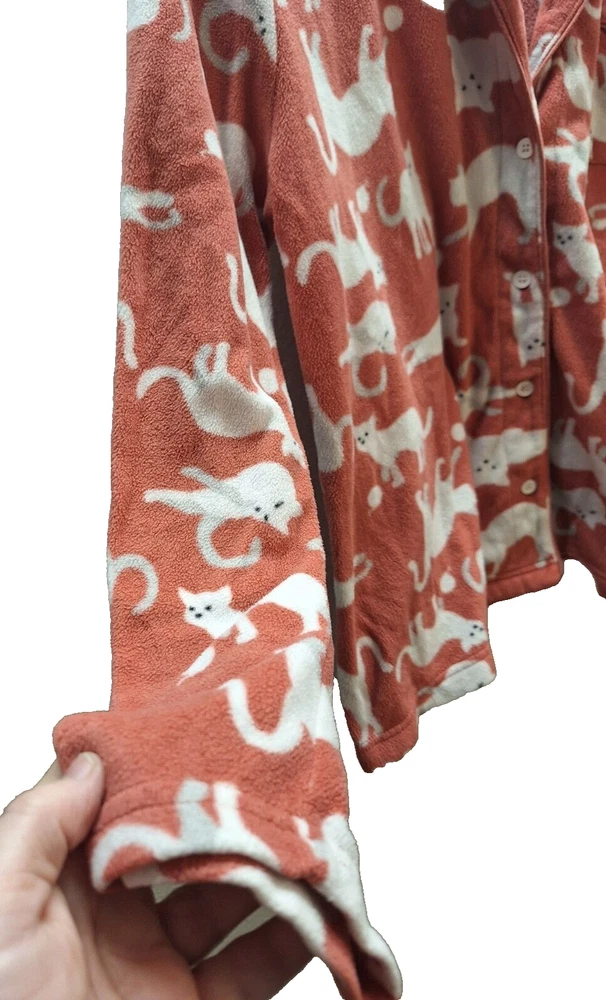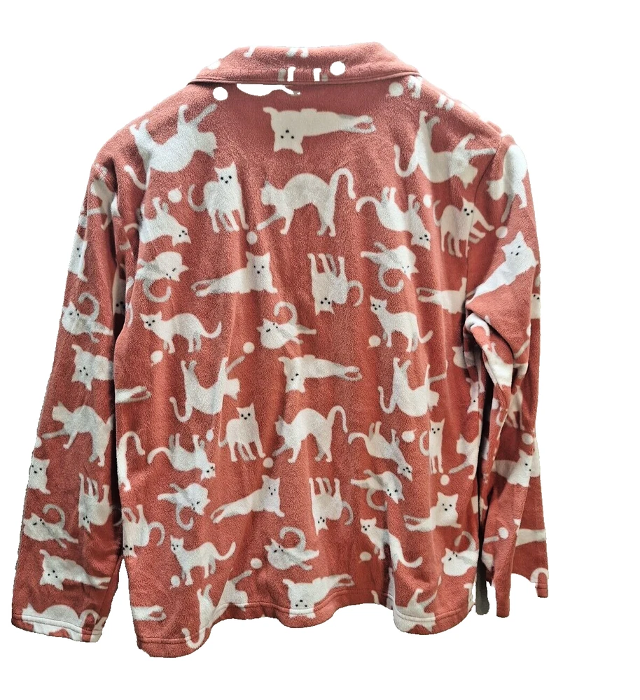 Snuggle up in these cozy Dip Sleepwear pajamas, perfect for those who adore cats and appreciate comfort. This Women's Size XL pajama set features a playful graphic print with an array of charming cat motifs, set against a soft peach backdrop that promises a warm and inviting feel. Crafted from plush polyester fleece, this set ensures you stay comfortable through the night or during those lazy weekend mornings. It includes a long-sleeve top with a button-down closure for ease of wear, and both pieces are machine washable for hassle-free maintenance. Ideal for fall, spring, and winter, this pajama set is a delightful addition to any sleepwear collection.