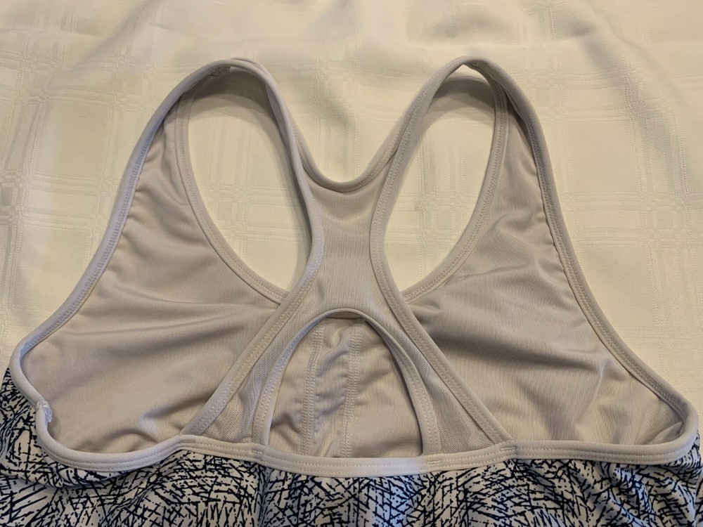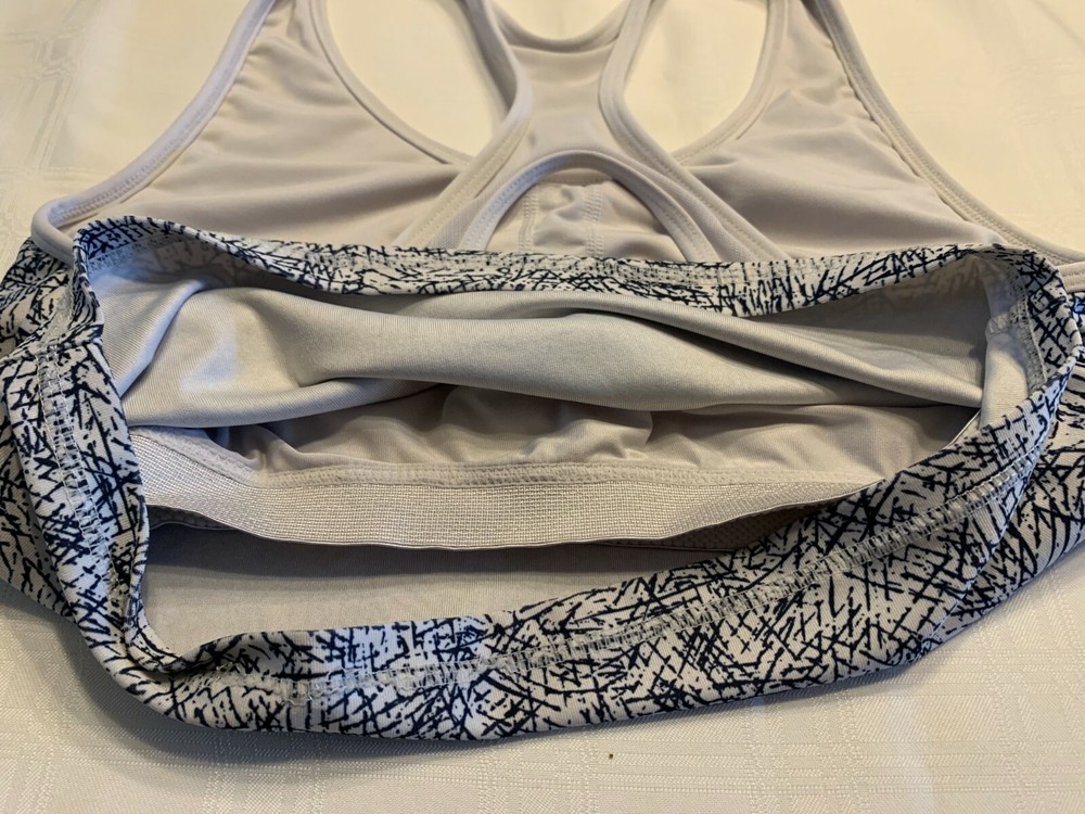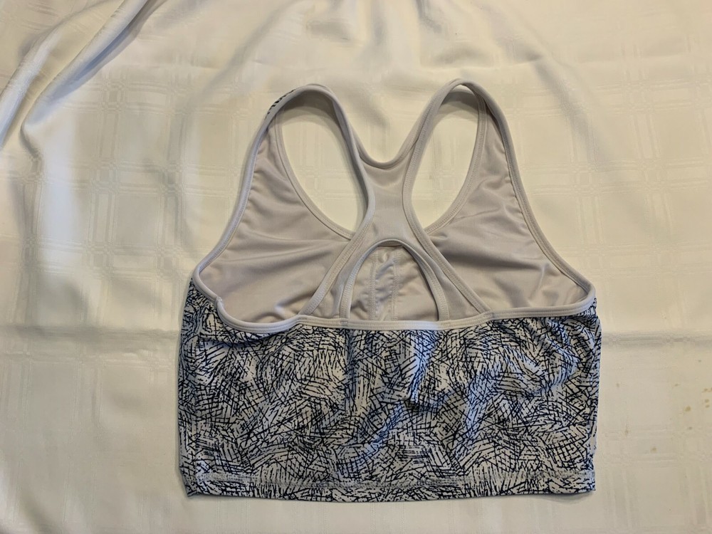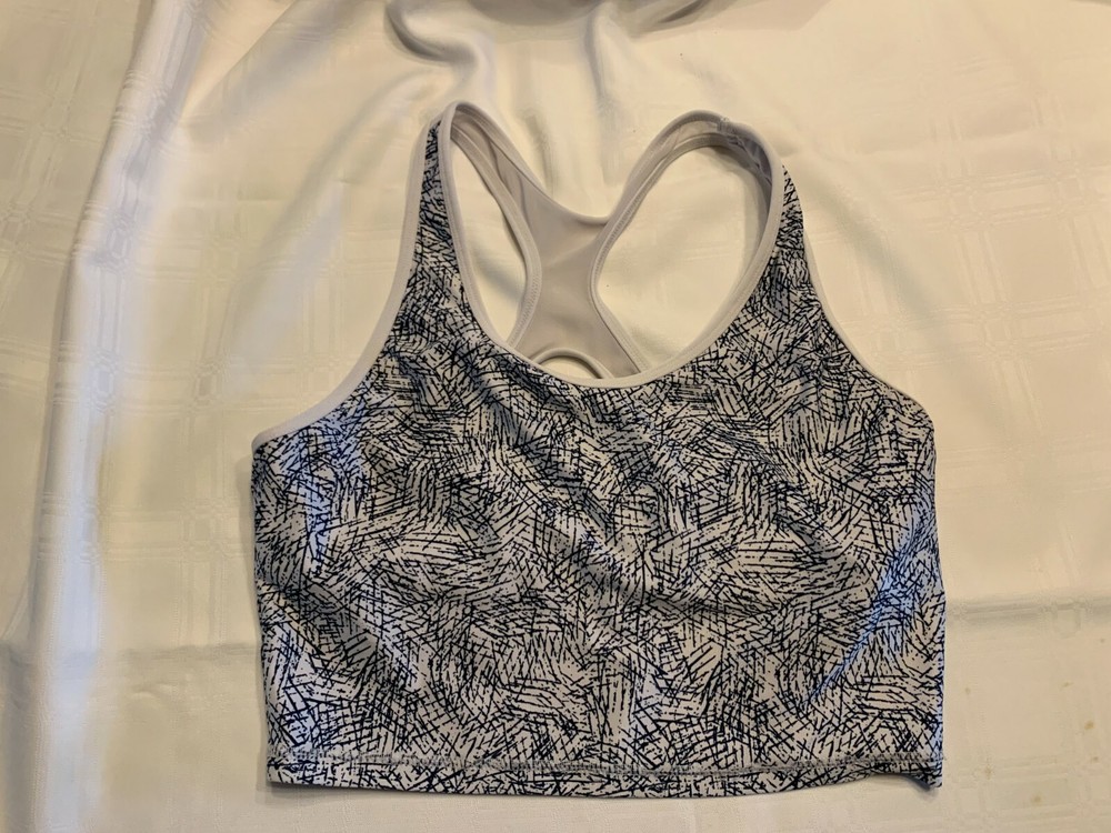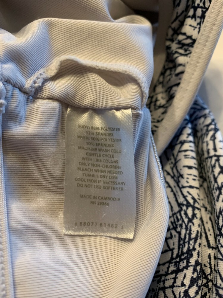 This is a cropped tank with built in bra which is great for dance, exercise, jogging or any other activity you do. It is made of 88% polyester and 12% spandex with mesh made of 90% polyester and 10% spandex. The tank is black and white geometric design and the built in bra is white. Clean smoke free home. Bra100