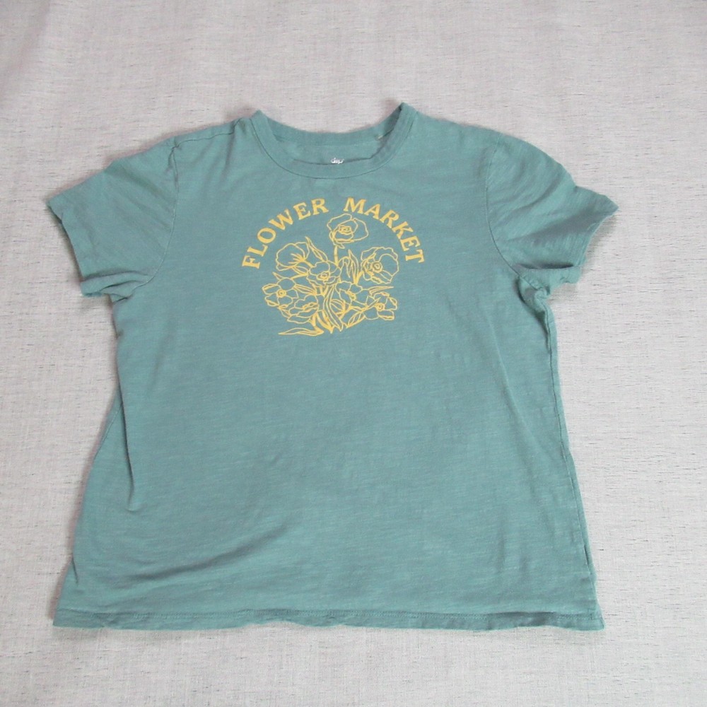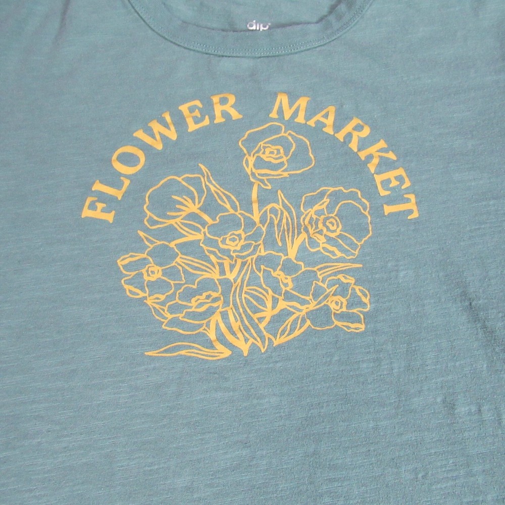 Dip T Shirt Womens Size Large Teal Cap Sleeve Graphic Flower Market Tee Casual If you have any questions, please ask. Helpful Hints: Don't rely on size tag and listing title alone. Compare measurements and pictures with a few of your favorite shirt/jacket because measurements vary within sizes--especially with pre-owned items. Measurements are given as approximates in inches. We appreciate a 5-star positive feedback in all 5 categories and promise the same in return. Should you feel you did not receive a 5-star experience in one or more categories, please contact us before leaving feedback. We will make every effort to ensure 100% satisfaction. Thank you for shopping! Please check out my store, Broke & Boujee, for other great products!