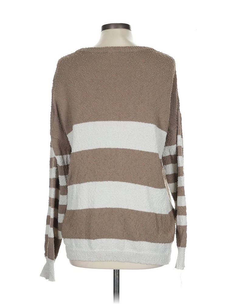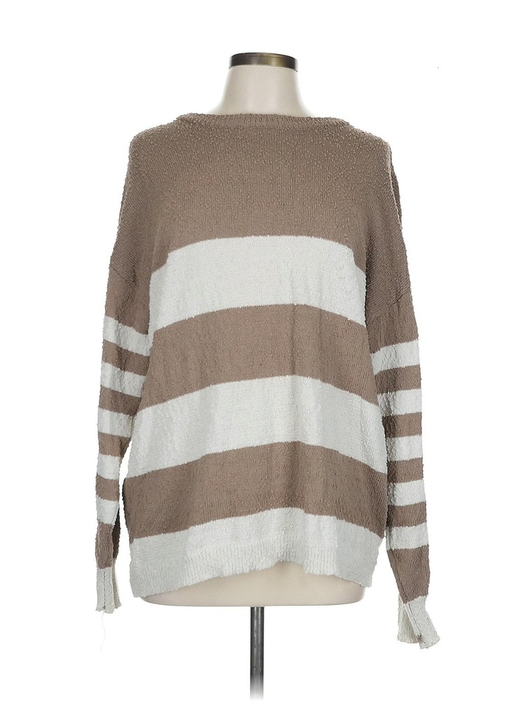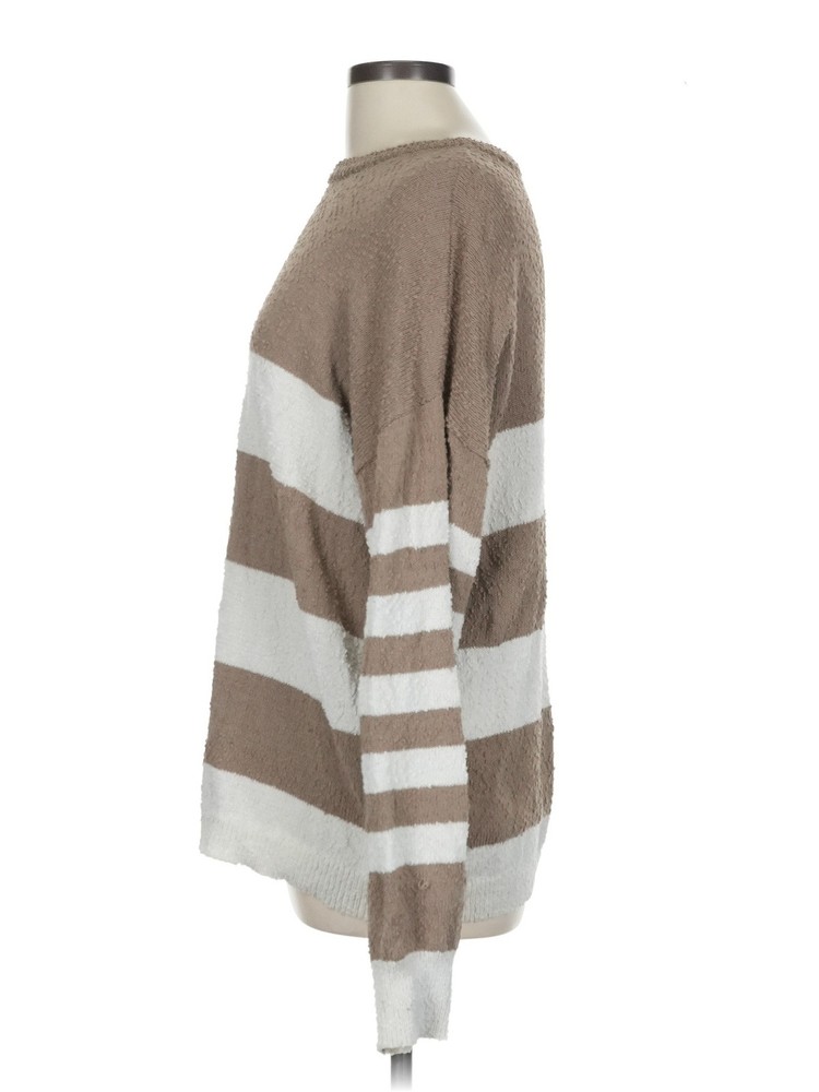 This cozy brown pullover sweater is a fantastic find! The scoop neck and long sleeves make it stylish yet comfortable, perfect for layering or wearing on its own. The striped pattern adds a cute touch, and the fabric feels soft and well-made. Even though it's gently used, it looks almost new—no major flaws at all. Great fit for a size L, and the length is just right. Love that it’s sustainable fashion at an affordable price! Definitely recommend for anyone looking for a warm, stylish sweater.