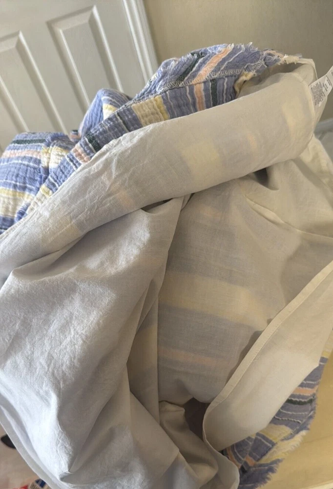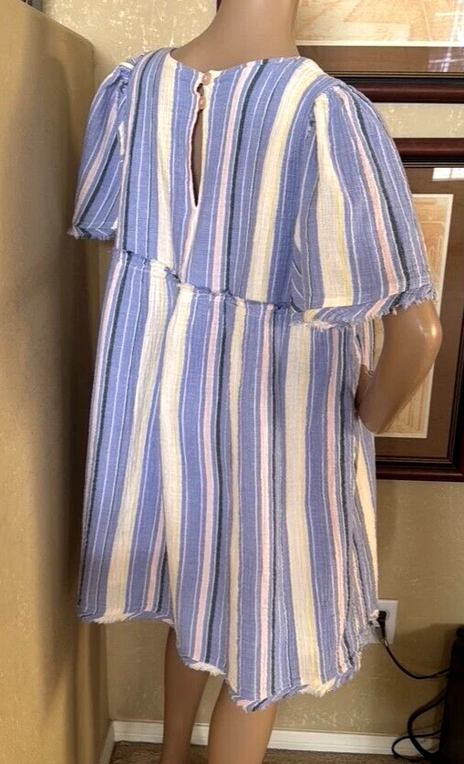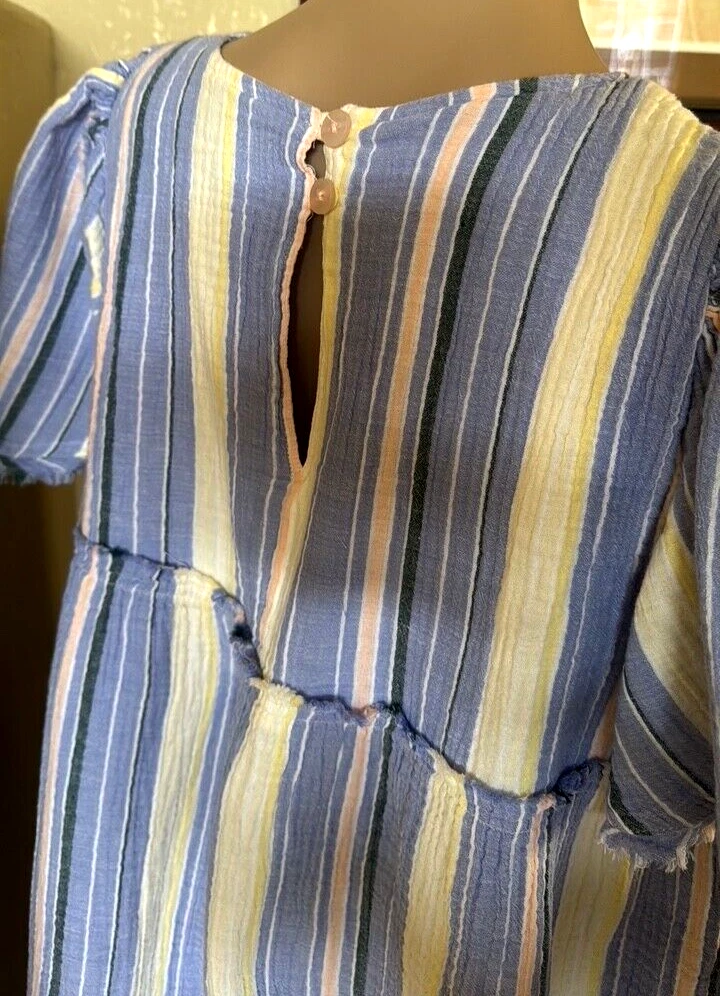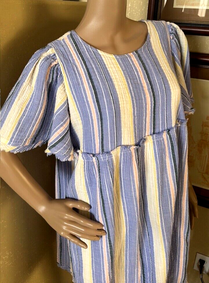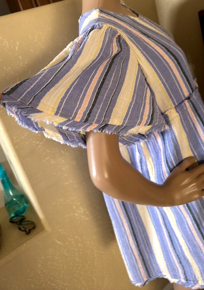 Adorable flutter sleeves. Excellent condition. Fully line. Made in India. 100% cotton crinkle cloth. 100% cotton lining. Perfect beach lounge dress. Falls just above the knee on me. Measures: 36" shoulder seam to hem. 21" armpit to armpit. Smoke free home.