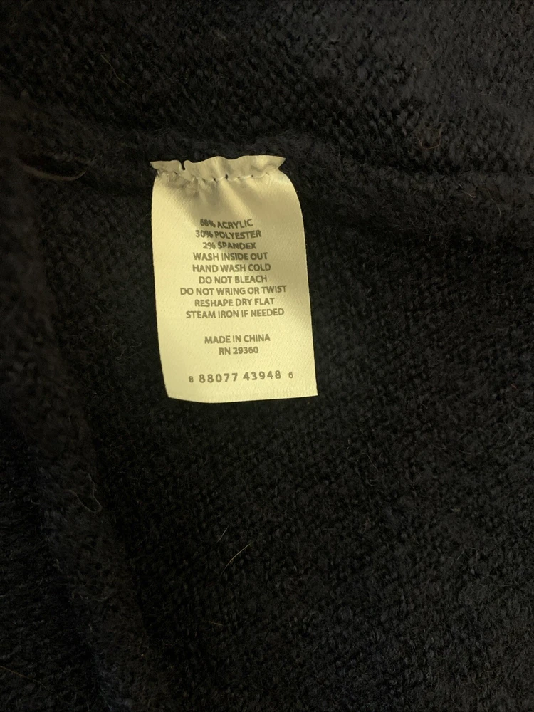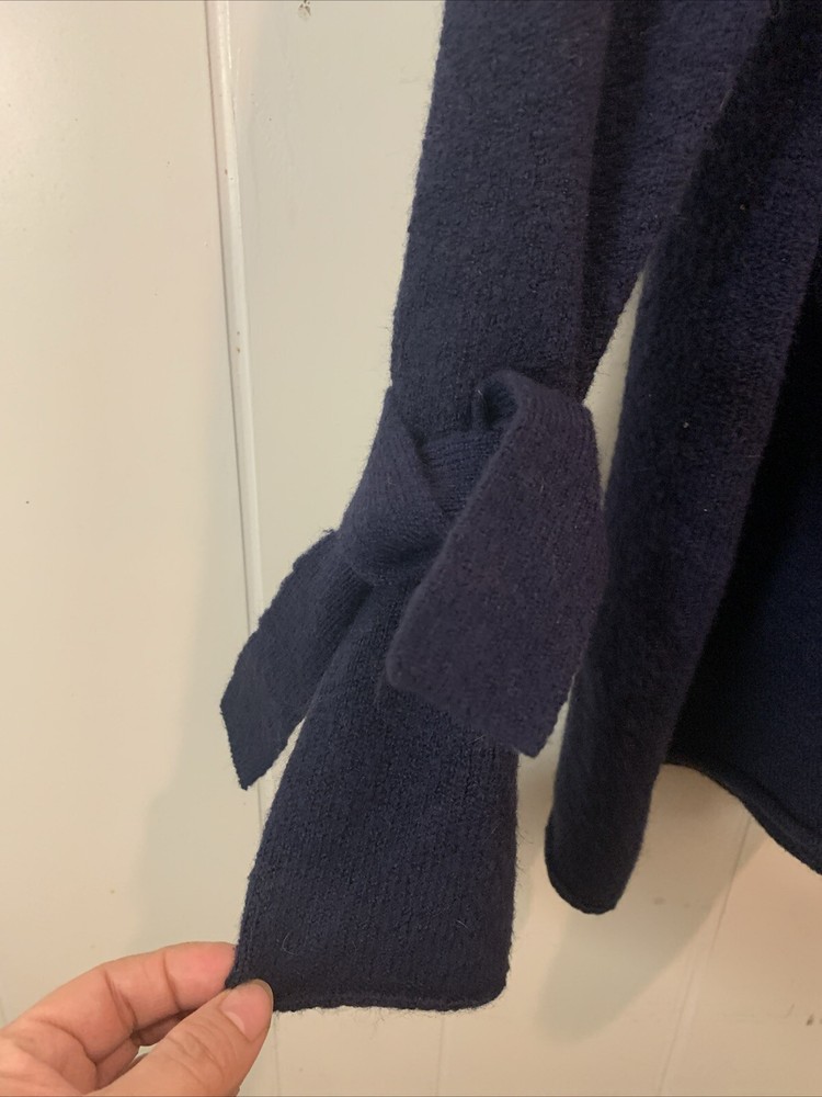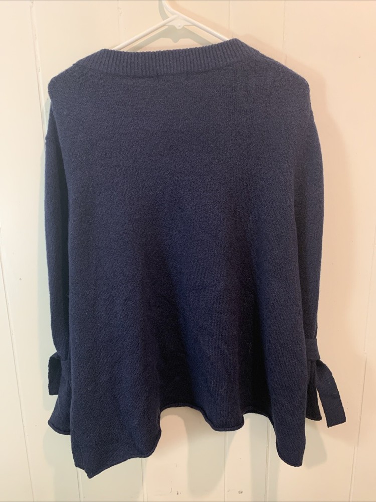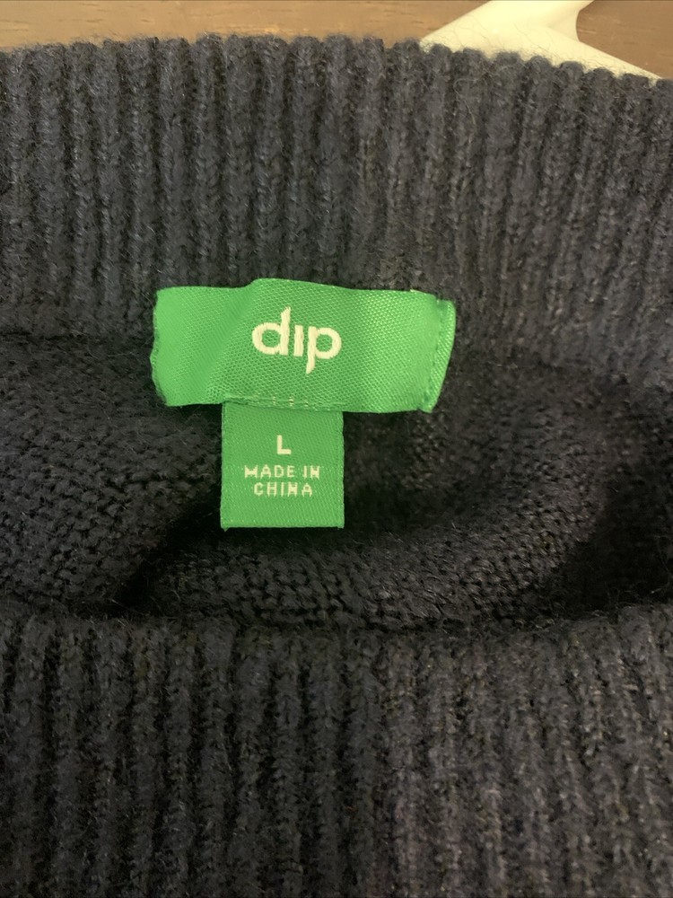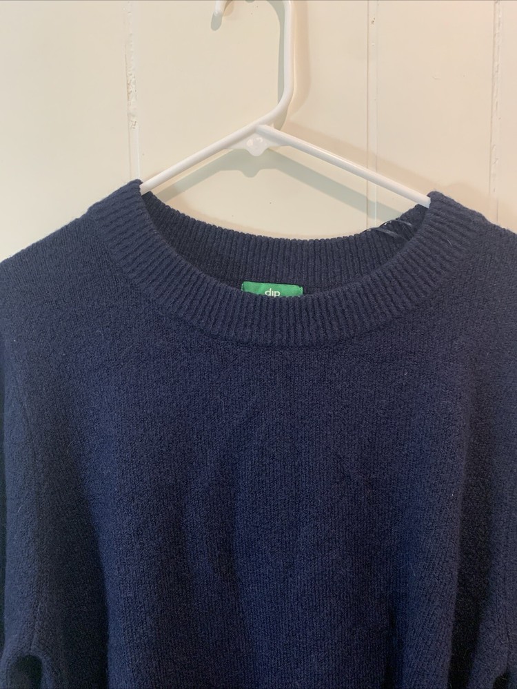 This Dip sweater for women in size Large features a solid navy blue color with a crew neck and long kimono sleeves. Made from a blend of polyester, spandex, and acrylic, the knit fabric offers a soft and stretchy feel, suitable for casual occasions in winter, fall, or spring. The pullover style sweater includes a charming bow accent and is labeled for hand wash only, ensuring proper care to maintain its quality.