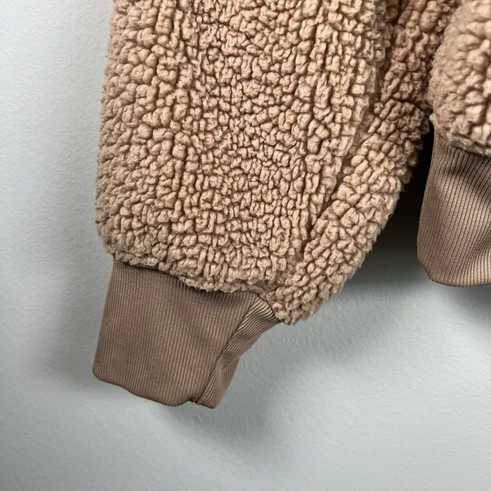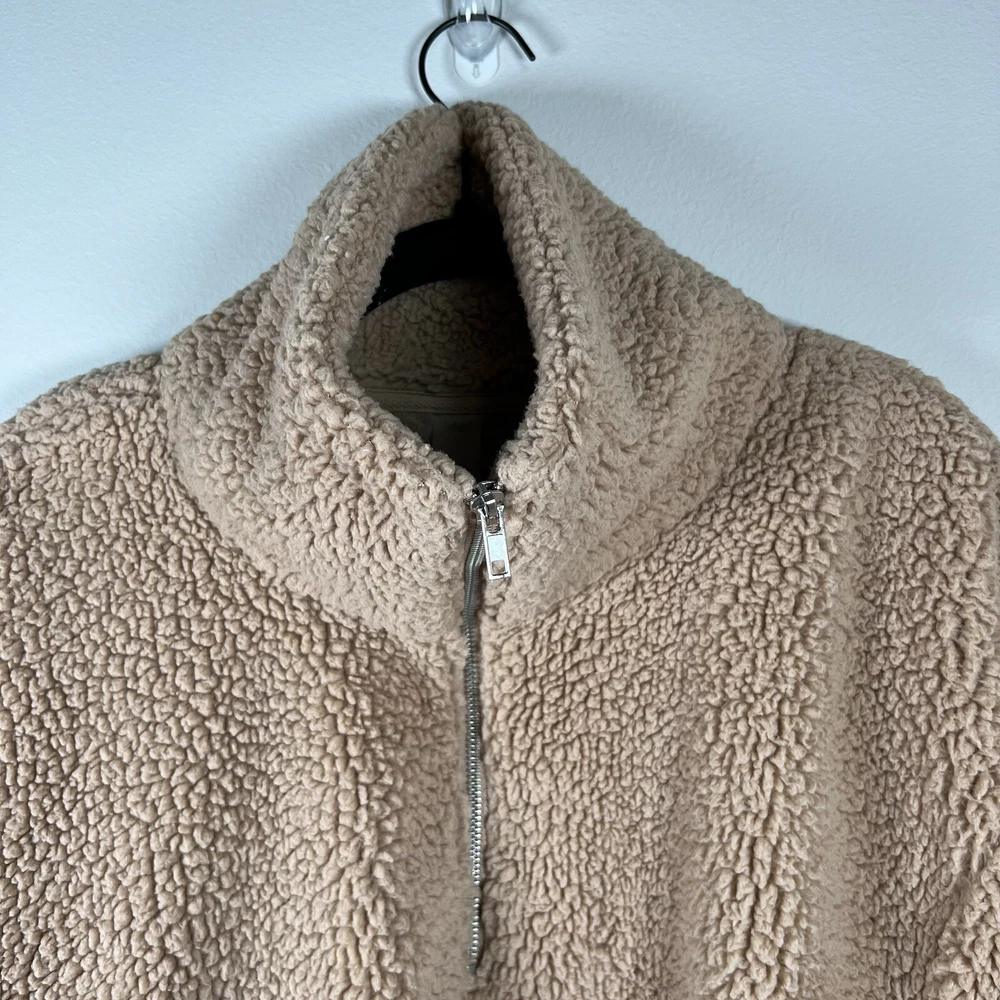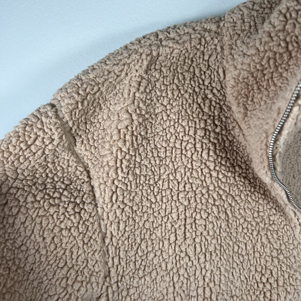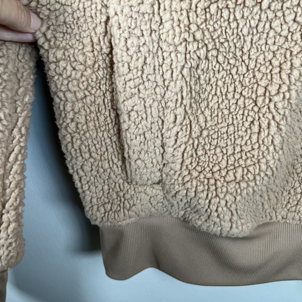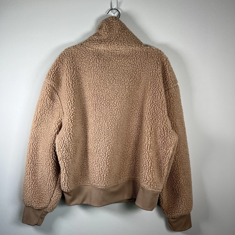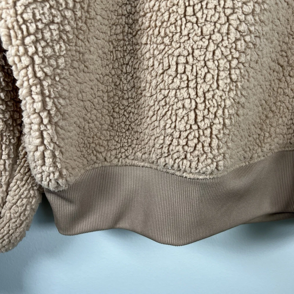 This cozy sherpa pullover is incredibly soft and warm—perfect for chilly days! The neutral tan color goes with everything, and the mock neck adds a stylish touch. Love the slant pockets for keeping hands warm. Fits true to size, and the preowned condition is flawless. Super comfortable and great quality—highly recommend!