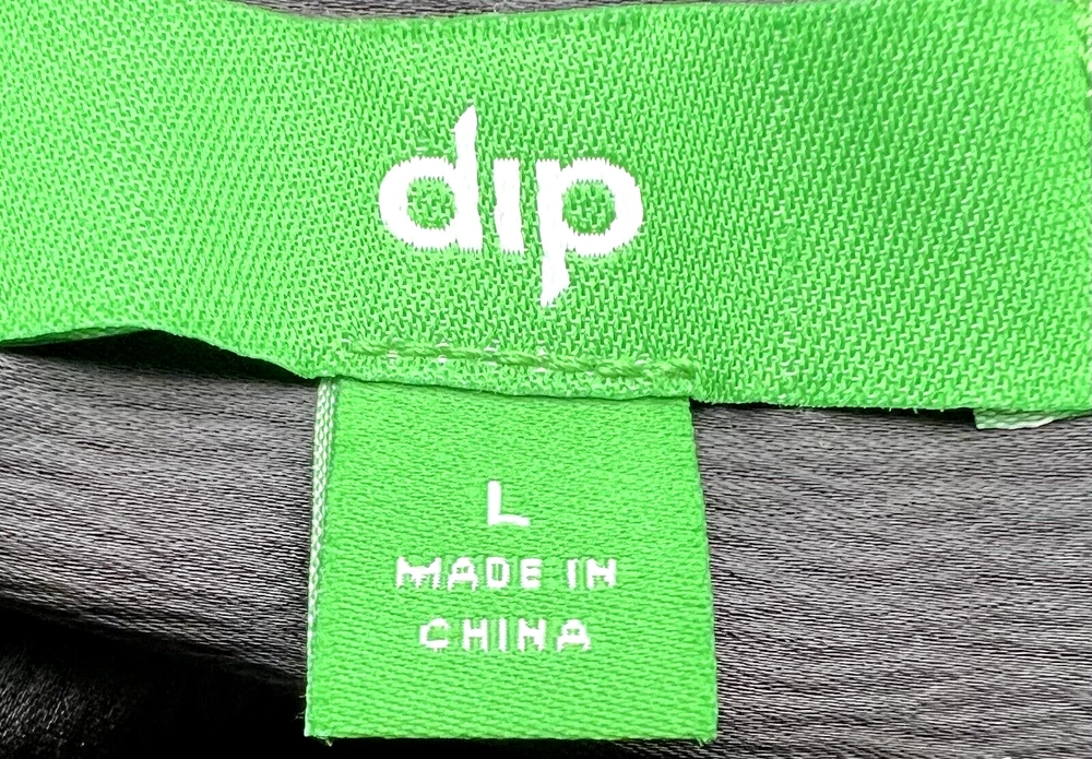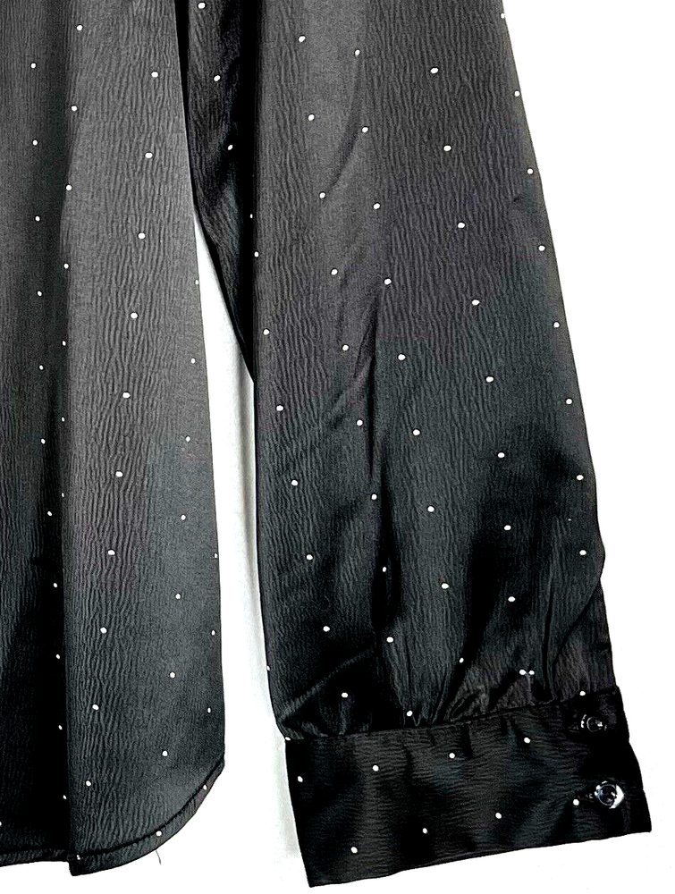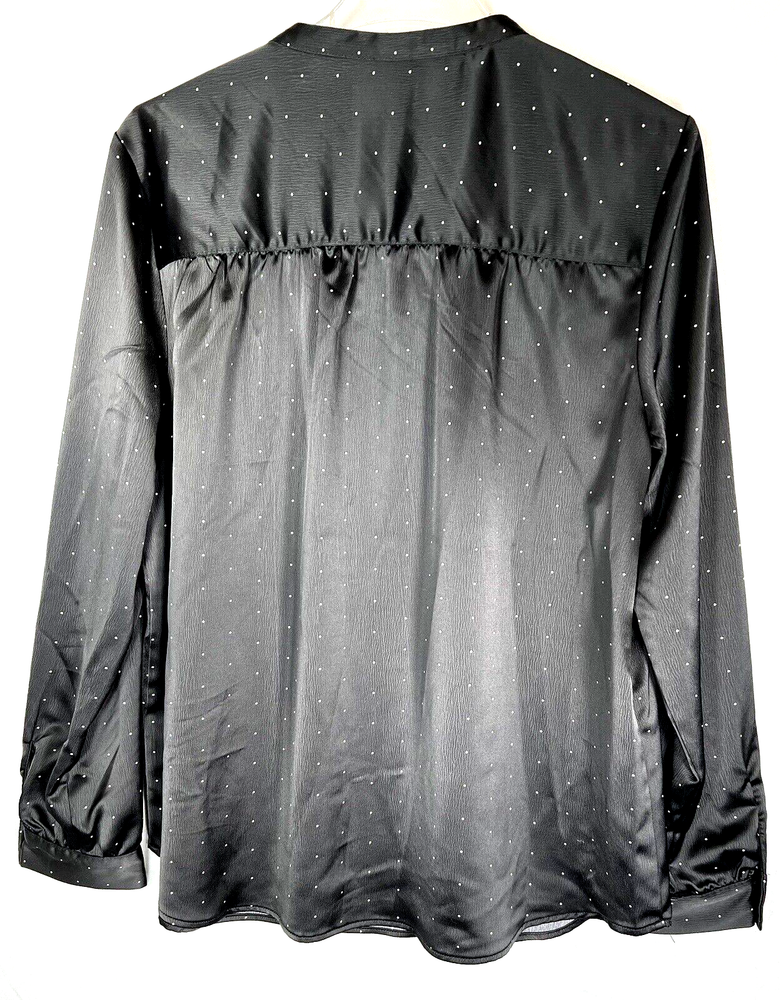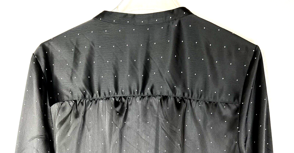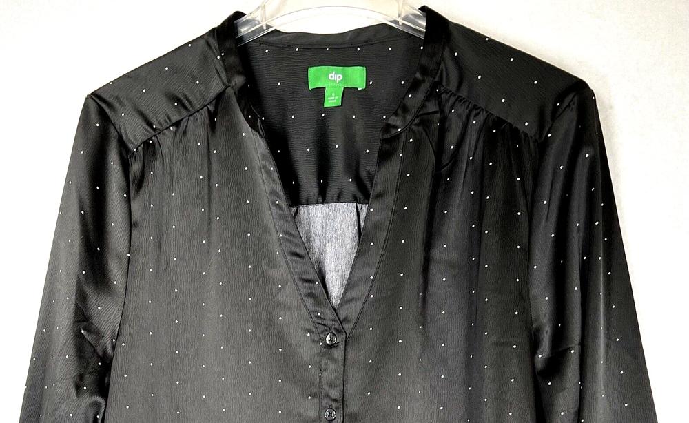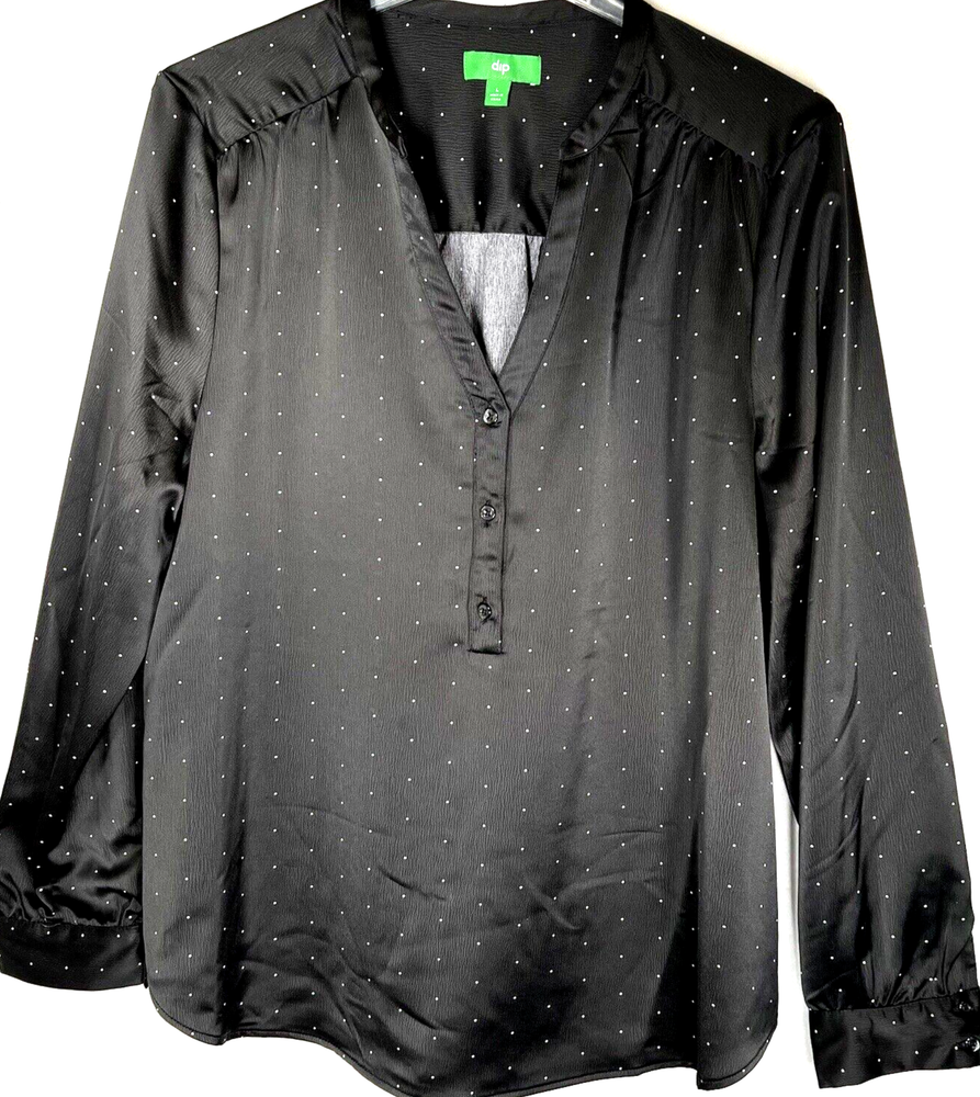 Dip women's size L pull on blouse, top. V-neck, mock collar, 3 buttons on the front. Black with small dots. Sleeves are cuffed with 2 buttons. Blouse has a nice heavier weight satin feel. Appropriate for so many occasions. Measured laying flat: 22" across the front chest, 27" long from top of shoulder. Sleeves are 23" long from the seam. Clean, no damage, rips, stains or fabric pulls. Buttons are intact. See pictures of labels for fabric content and care information. Check out my store for more great items: LaJoFabulousFinds
