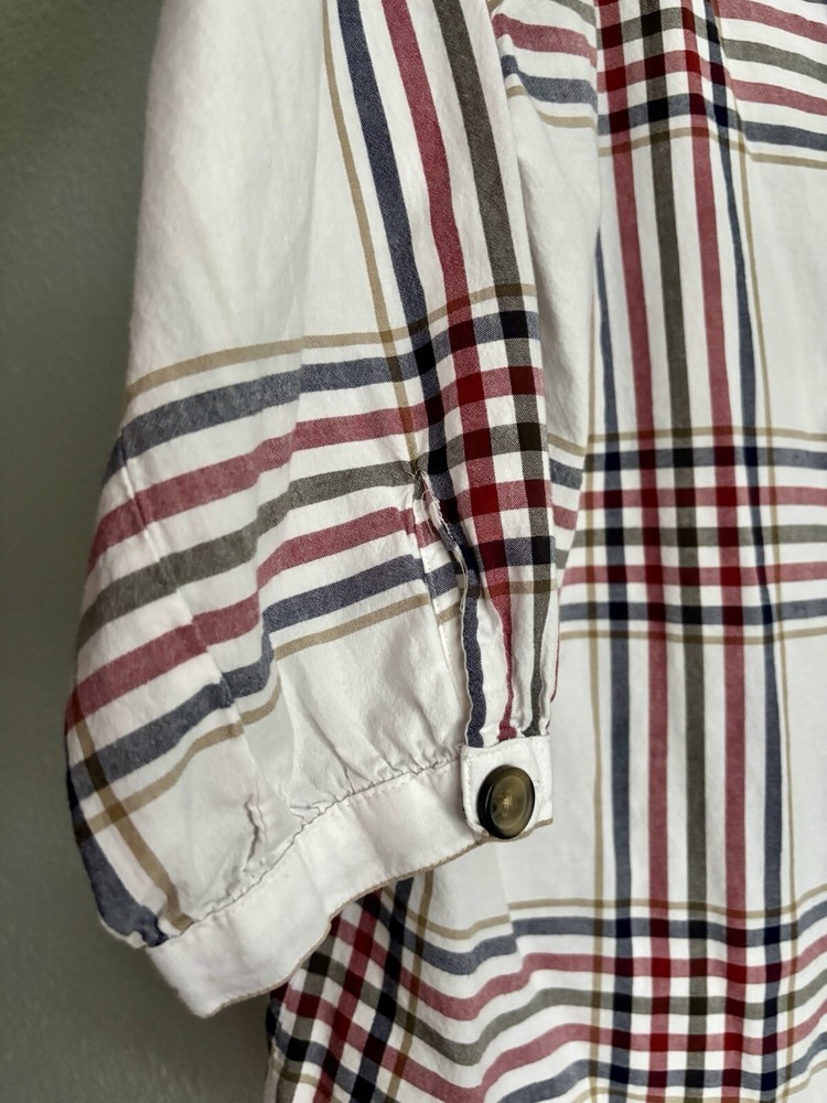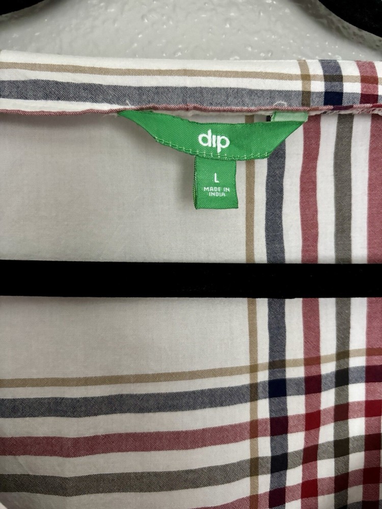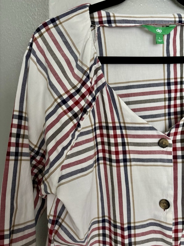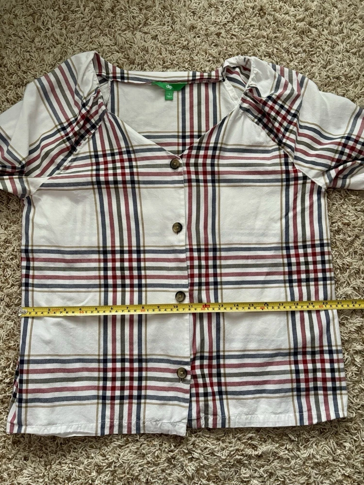 Elevate your wardrobe with this stunning Dip Women's Top featuring a white plaid pattern with blue and red button accents. The V-neckline and 3/4 sleeves add a touch of elegance to this versatile blouse, perfect for any occasion from travel to parties or casual outings. Made from 100% cotton knit fabric, this lightweight and breathable top is perfect for all seasons, bringing a touch of comfort and style to your outfit. The ruffle and button accents add a touch of bohemian flair to this classic and timeless piece, making it a must-have addition to any designer or beach-themed wardrobe.