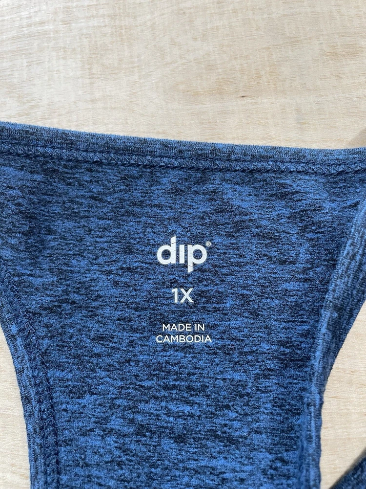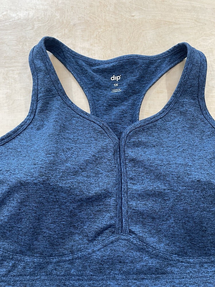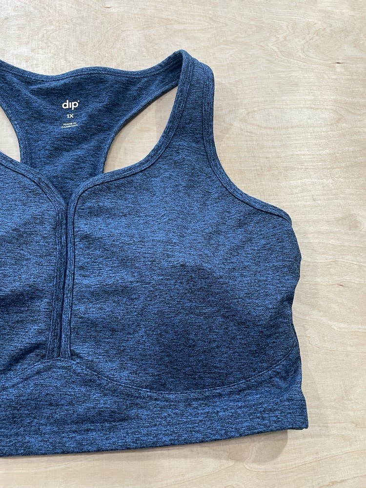This Dip brand sports bra is perfect for any athletic occasion. It features a wireless design with a racerback strap type and a pullover closure. The bra is made from a blend of polyester and spandex materials, providing a comfortable and flexible fit. The bra comes in a size 1X, with a medium support level and a one-size cup size. It also includes removable pads and padded features for added comfort during any performance or activity. This sports bra is ideal for athleisure wear and is available in a beautiful blue color.