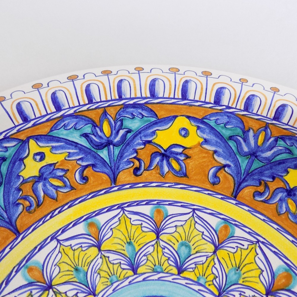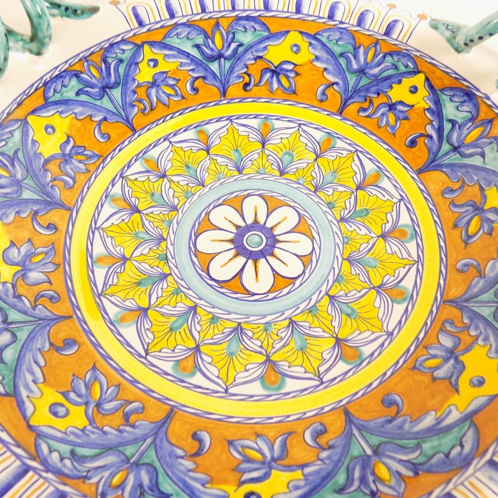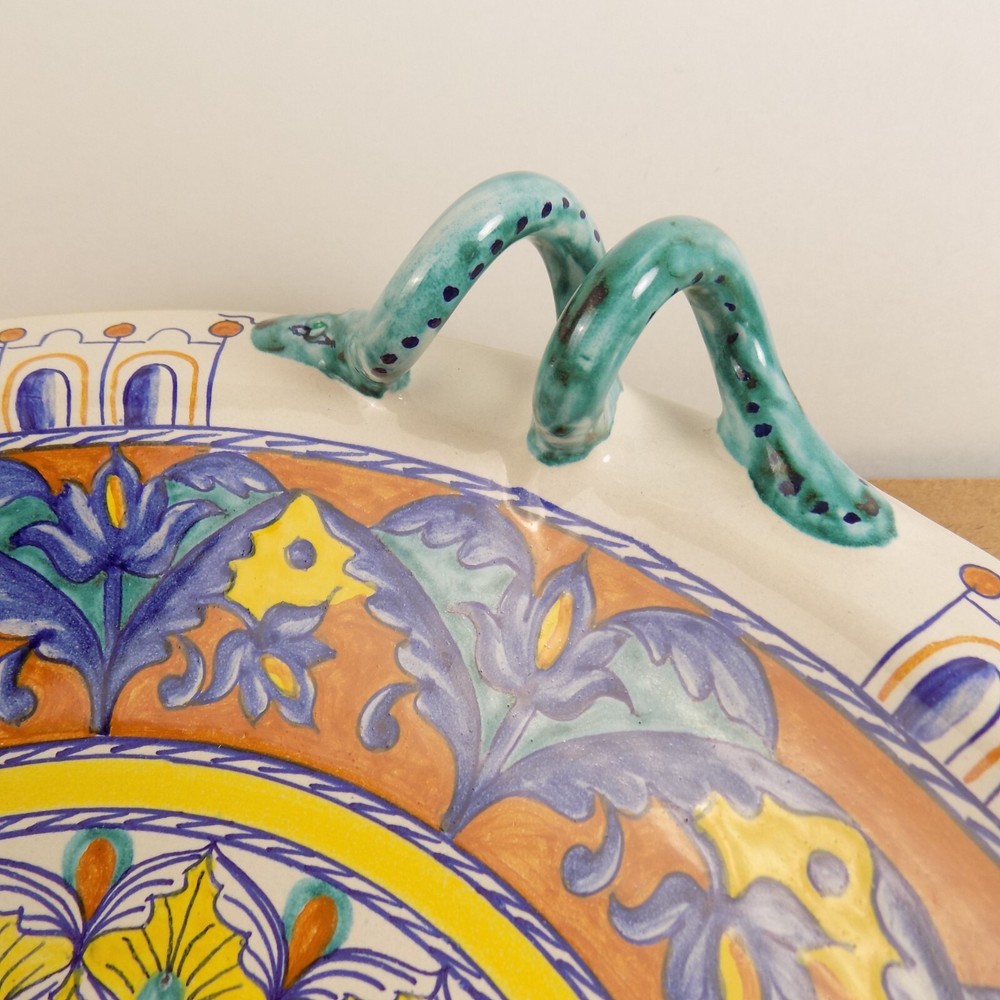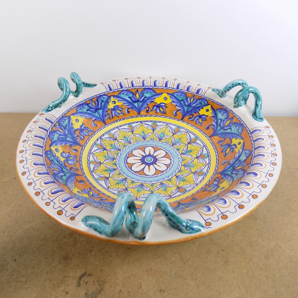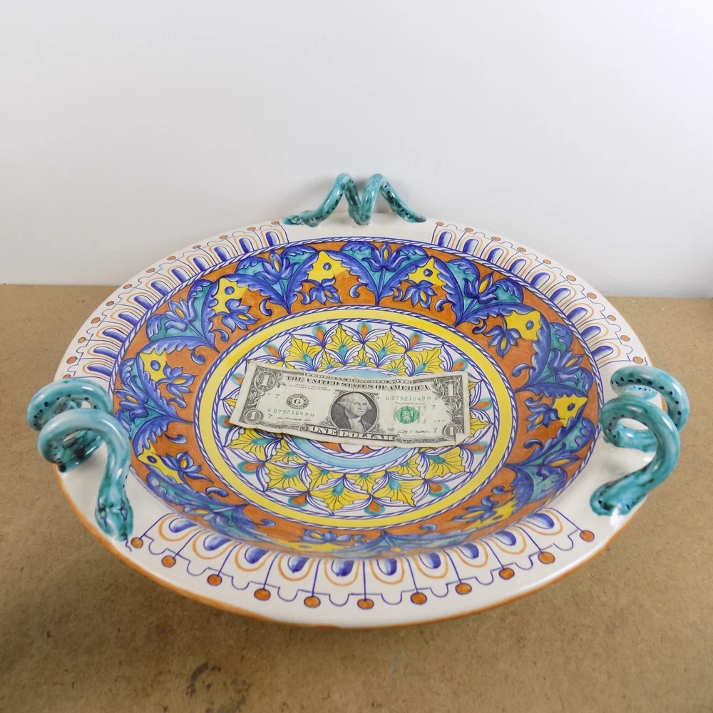 This stunning Italian pottery bowl is a true work of art! The intricate snake handles add a unique, handcrafted touch, and the 14" size makes it perfect for serving or display. The vibrant colors and flawless condition show off its high-quality craftsmanship. A beautiful, functional piece that brings a touch of Italy into any home—highly recommend!