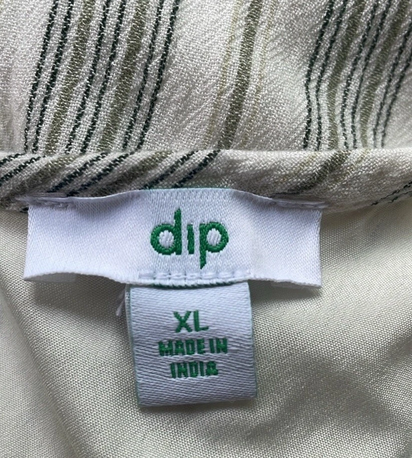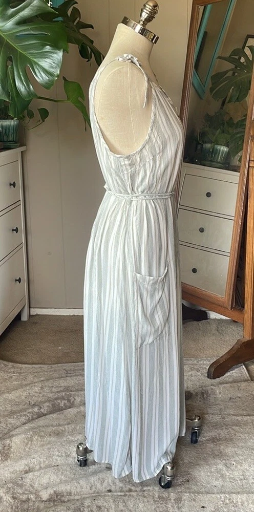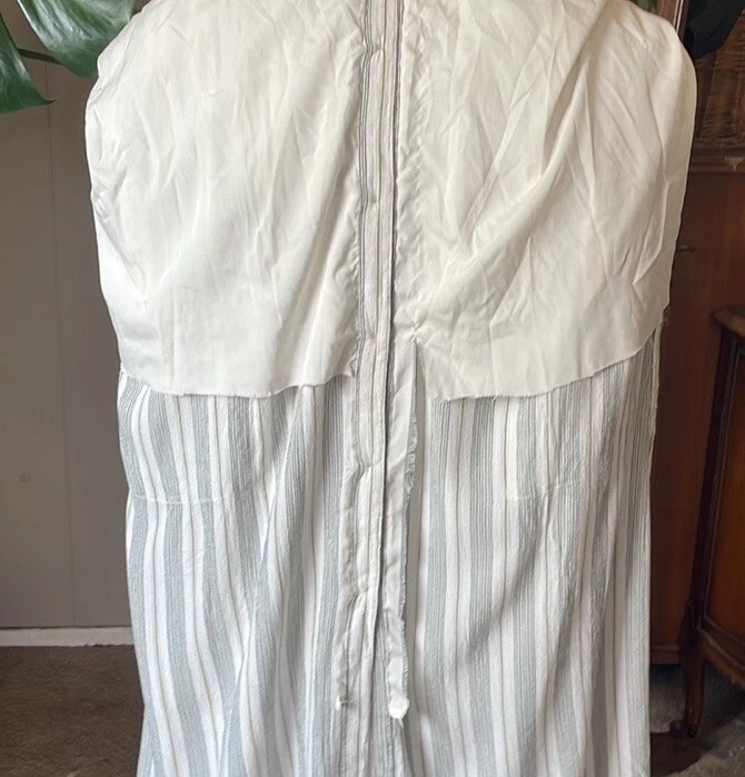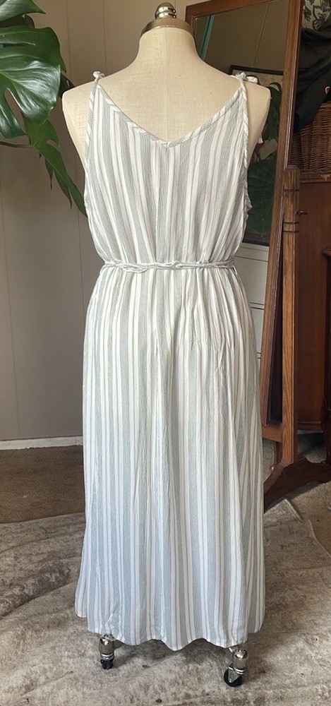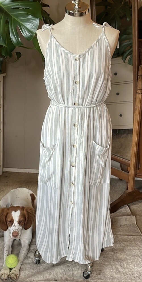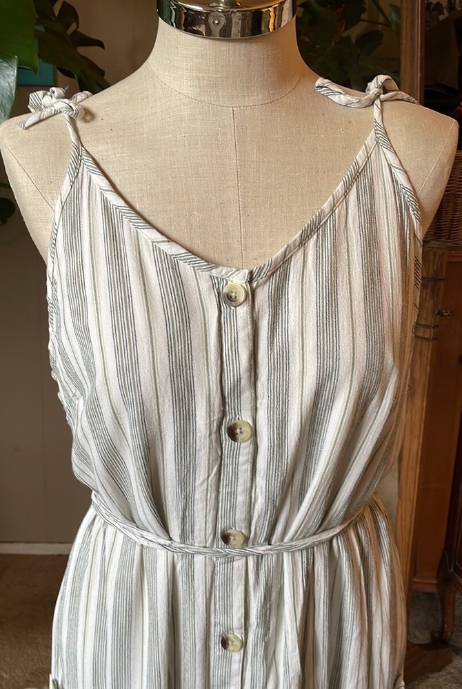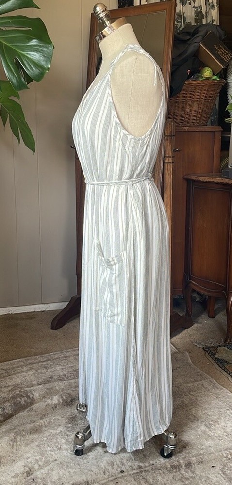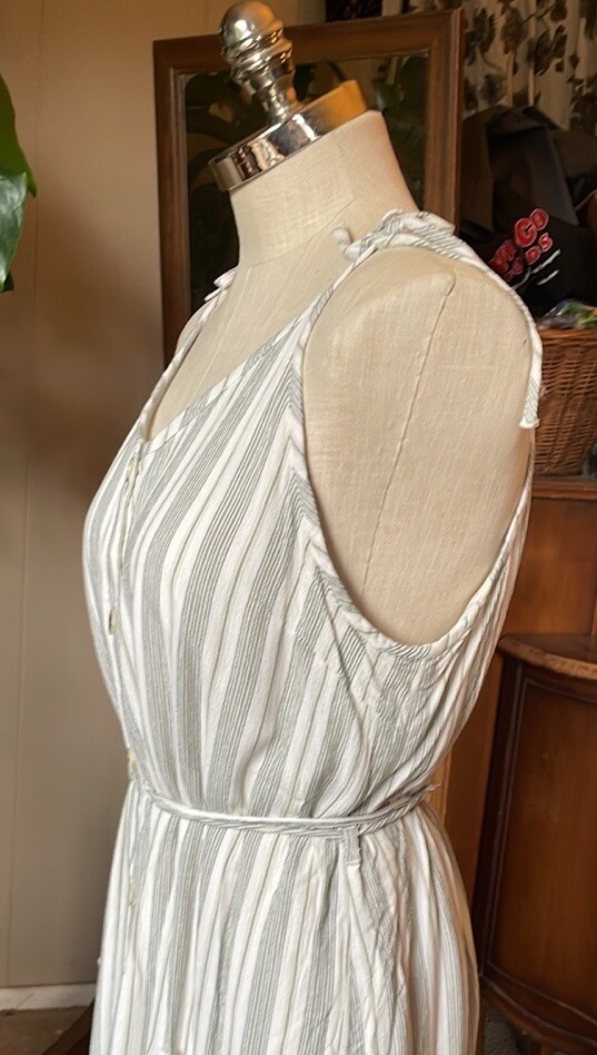 Dip striped cream/green button up dress with 2 pockets and adjustable shoulder straps.Garment has been washed and comes from a nonsmoking pet-friendly home. Chest 42” Waist 41” Hips 52” Length 48” Matching detachable sash has frayed areas. White lining has been cut shorter and is ripped with a raw hem. See last photo. B20